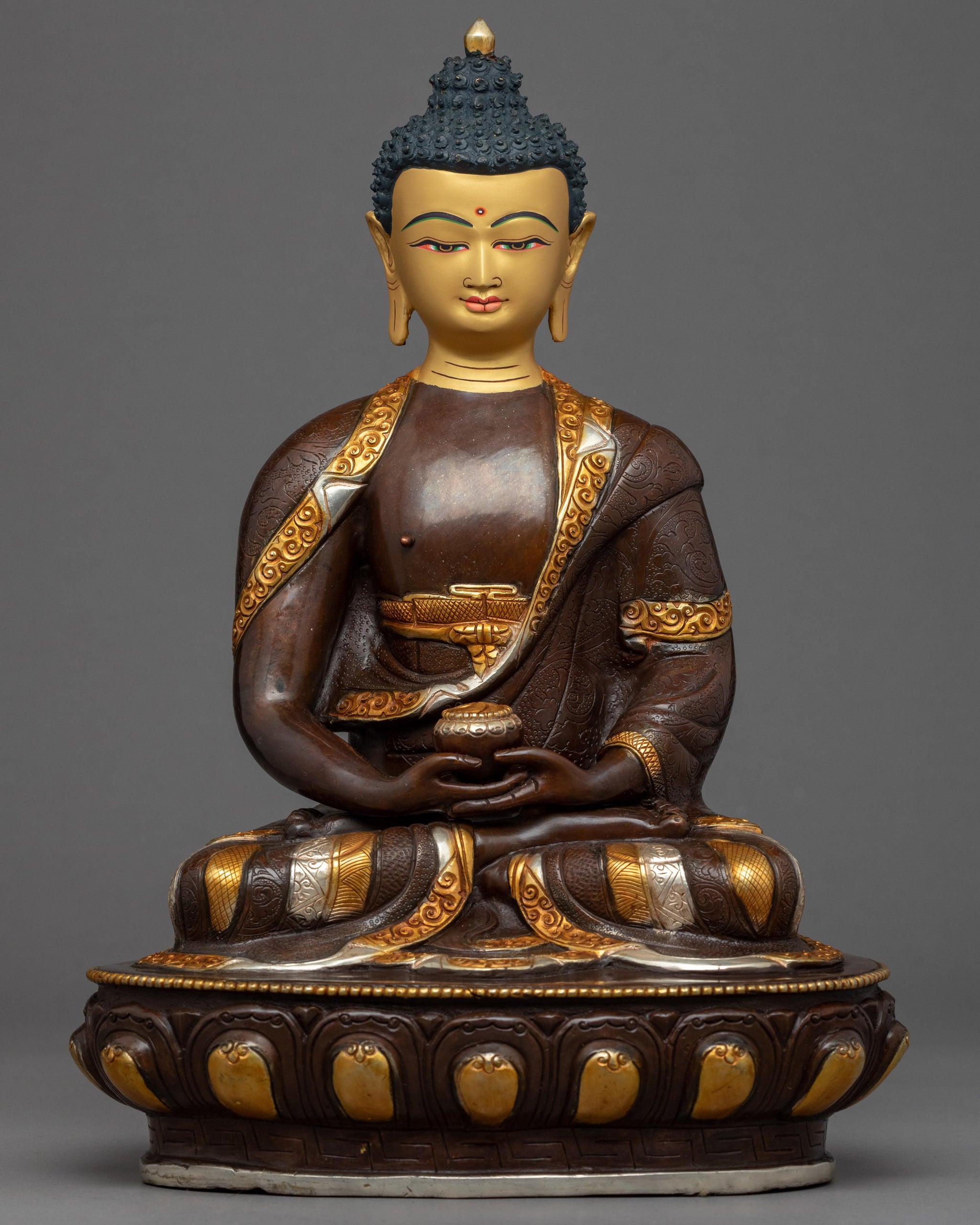 This Indoor Amitabha Buddha Sculpture was accreted in our studio in Nepal by the master craftsmen of Nepal. The intricate design patterns depict the deity with realistic detail patterns that took our artists months to complete. A copper body was used to hand carve the statue's features, while the details were provided with a coating of genuine 24k gold. We have depicted the deity in this Buddhist artwork, holding an alms bowl in both hands while sitting on top of a moon-disc lotus seat with a tranquil expression. The use of Acrylic painting highlights the statue to a greater extent giving it mesmerizing look.