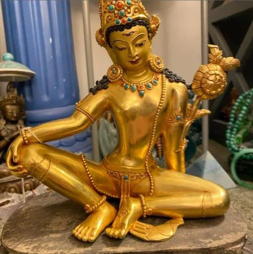 The meticulous gold gilding highlights the exquisite details of his attire and jewels, reflecting his status as a deity of great importance and reverence. This statue serves as an object of veneration and an artistic tribute to the rich tapestry of mythological and spiritual traditions.