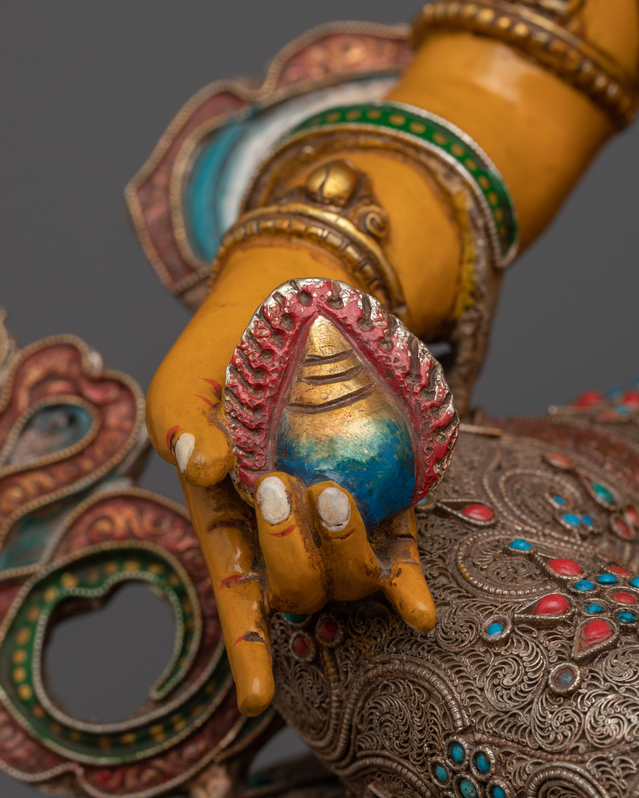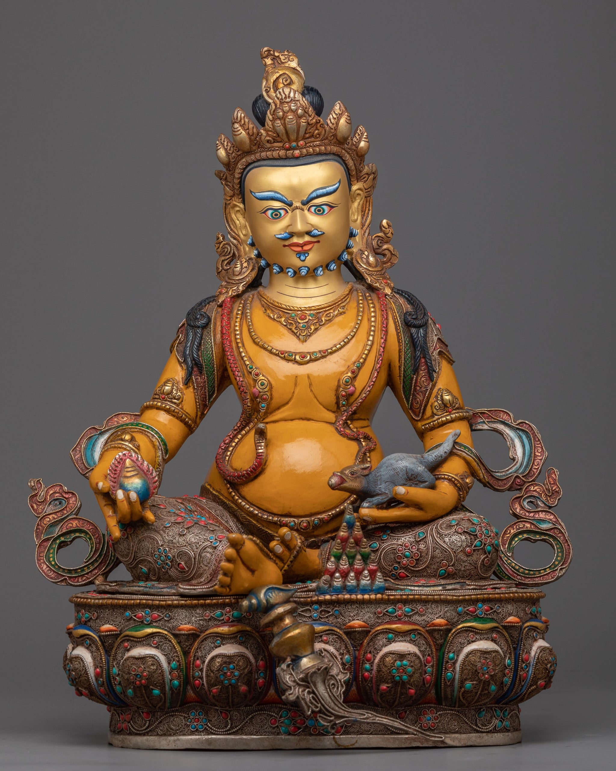 By adding our beautiful 17.7-inch statue, you may enhance your spiritual practice and living area with the wealthy and auspicious energy of Jambala. This high-quality statue was skillfully created in Nepal utilizing the age-old lost wax casting technique, and it features a copper body that has been richly gilded with 24K gold. Jambala's facial characteristics are emphasized in the expertly executed acrylic paints, which give this magnificent sculpture more depth and grandeur. This magnificent statue captures the essence of Jambala's abounding and beneficent energy and is ideal for spiritual practice, home décor, altarpieces, cultural appreciation, or giving.