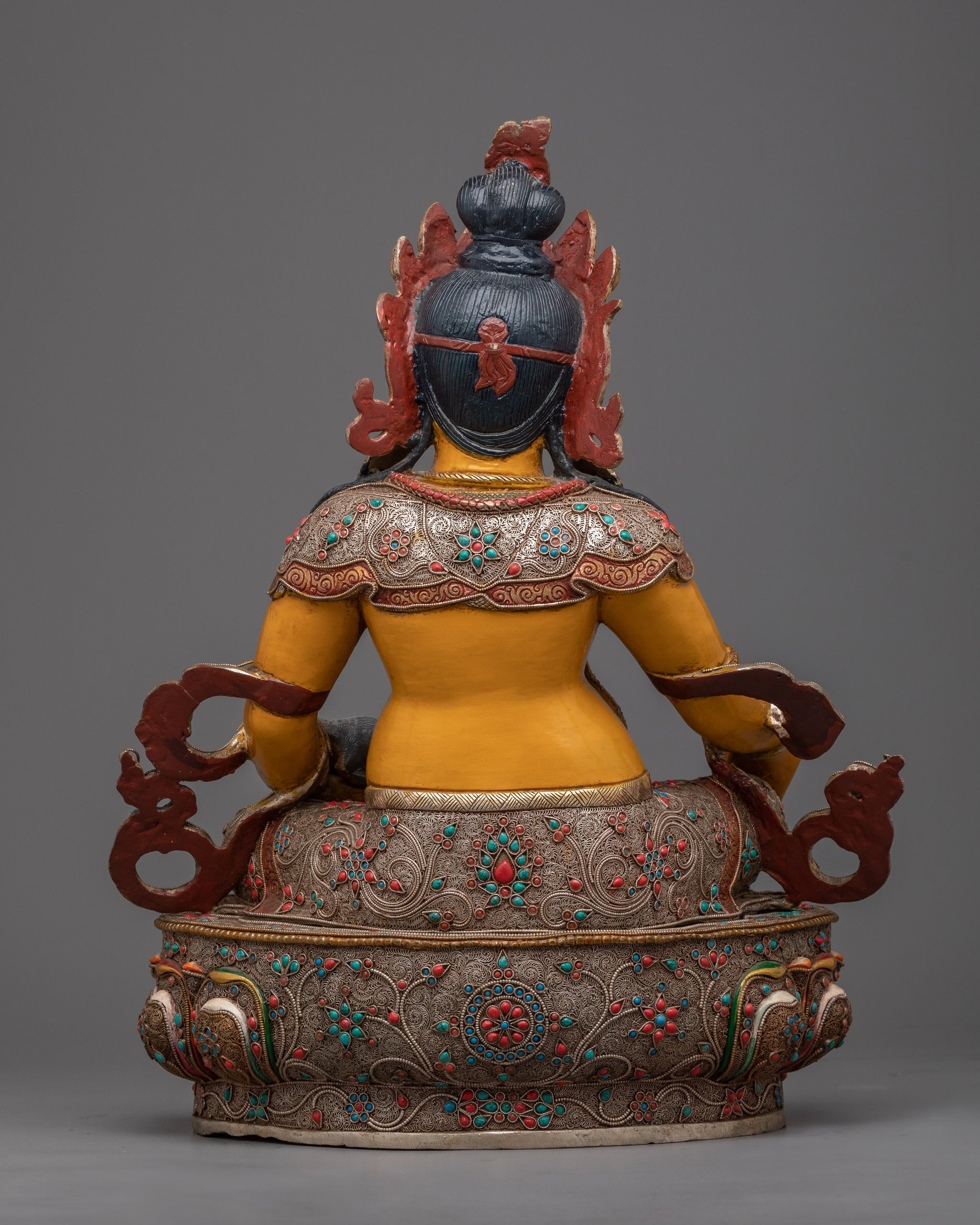 In Tibetan and Nepalese Buddhism, the wealth deity Jambala is worshipped and represents abundance, generosity, and success. Jambala provides assistance to his followers in overcoming financial challenges and bestows the gifts of money, both earthly and spiritual, as a manifestation of the Buddha's enlightened action. You may attract his wealthy and kind energy into your life by adding this alluring Jambala statue into your spiritual practice. This will help you establish a stronger bond with the limitless knowledge and compassion that permeate the cosmos.