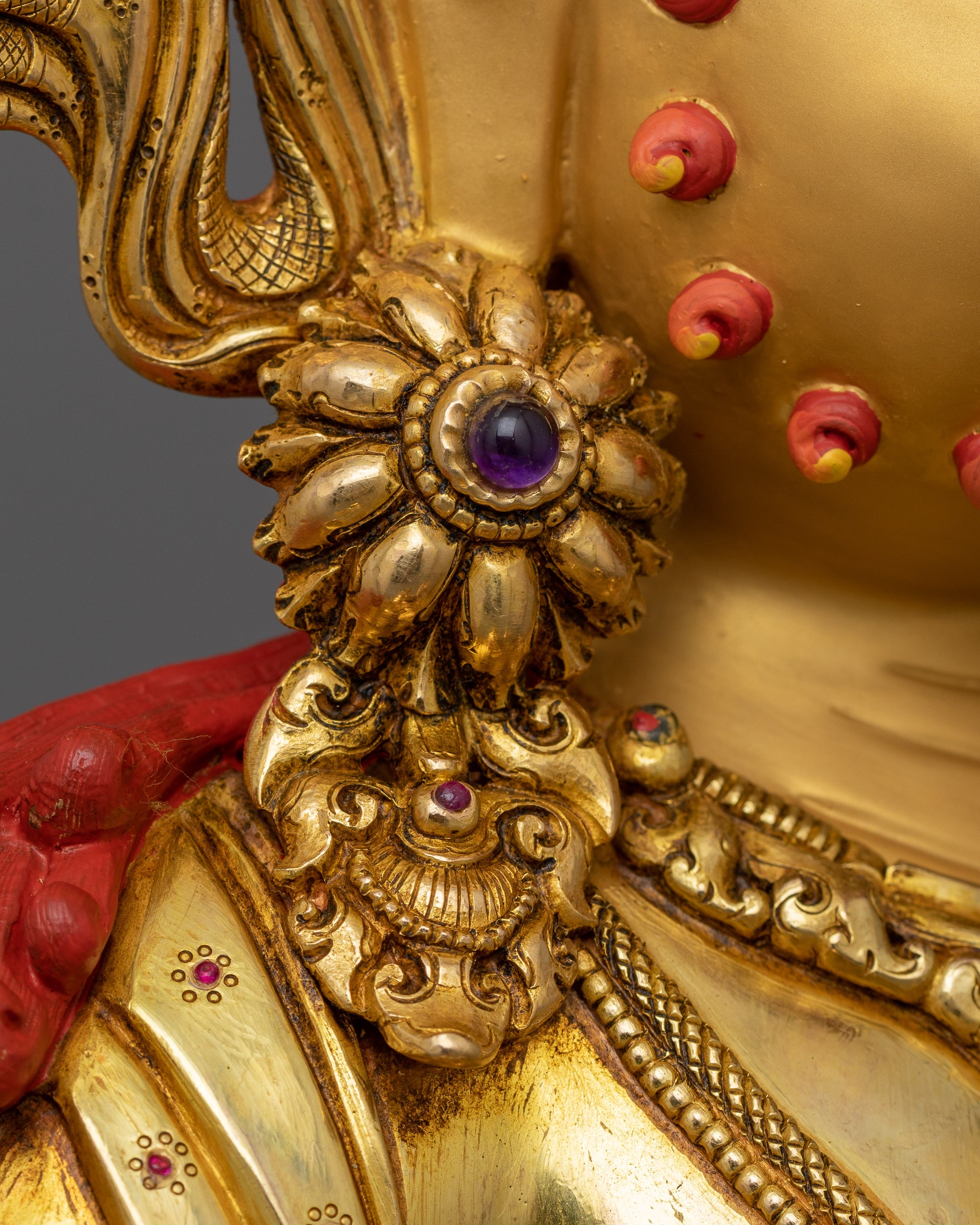 Vajrayogini is stunning. The details are amazing. It's easy to make out her facial expressions, skulls, feet, and the ring of fire around her. You can tell she's handmade. There is a consecration hole in her back.
