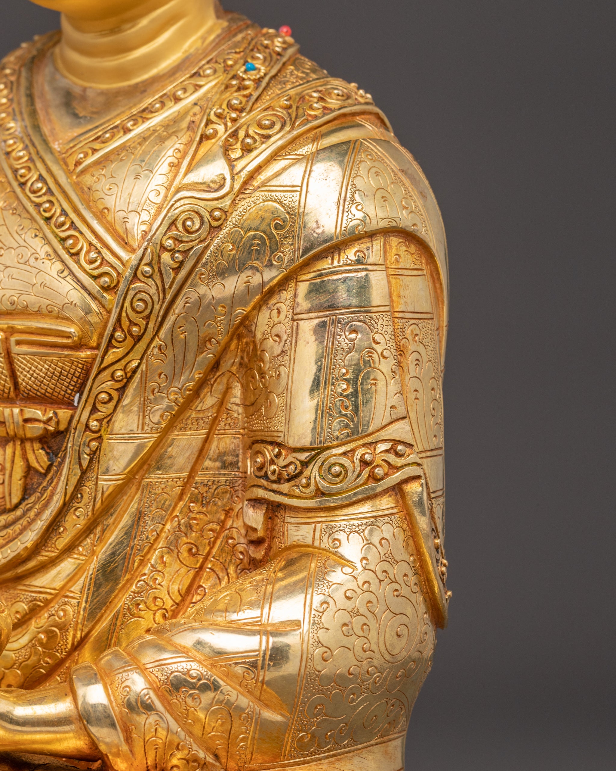 Jigten Sumgon is depicted in a meditative posture, holding his right hand in the bhumisparsha mudra, which symbolizes unwavering determination and the calling of the earth as a witness to enlightenment. His left hand rests upon an alms bowl, representing generosity, monastic discipline, and the sustenance of spiritual practice. He wears the distinctive Drikung hat, which highlights his identity as the founder of the Drikung Kagyu lineage, while his robes and adornments reflect the traditional artistry and devotion of the Himalayas.