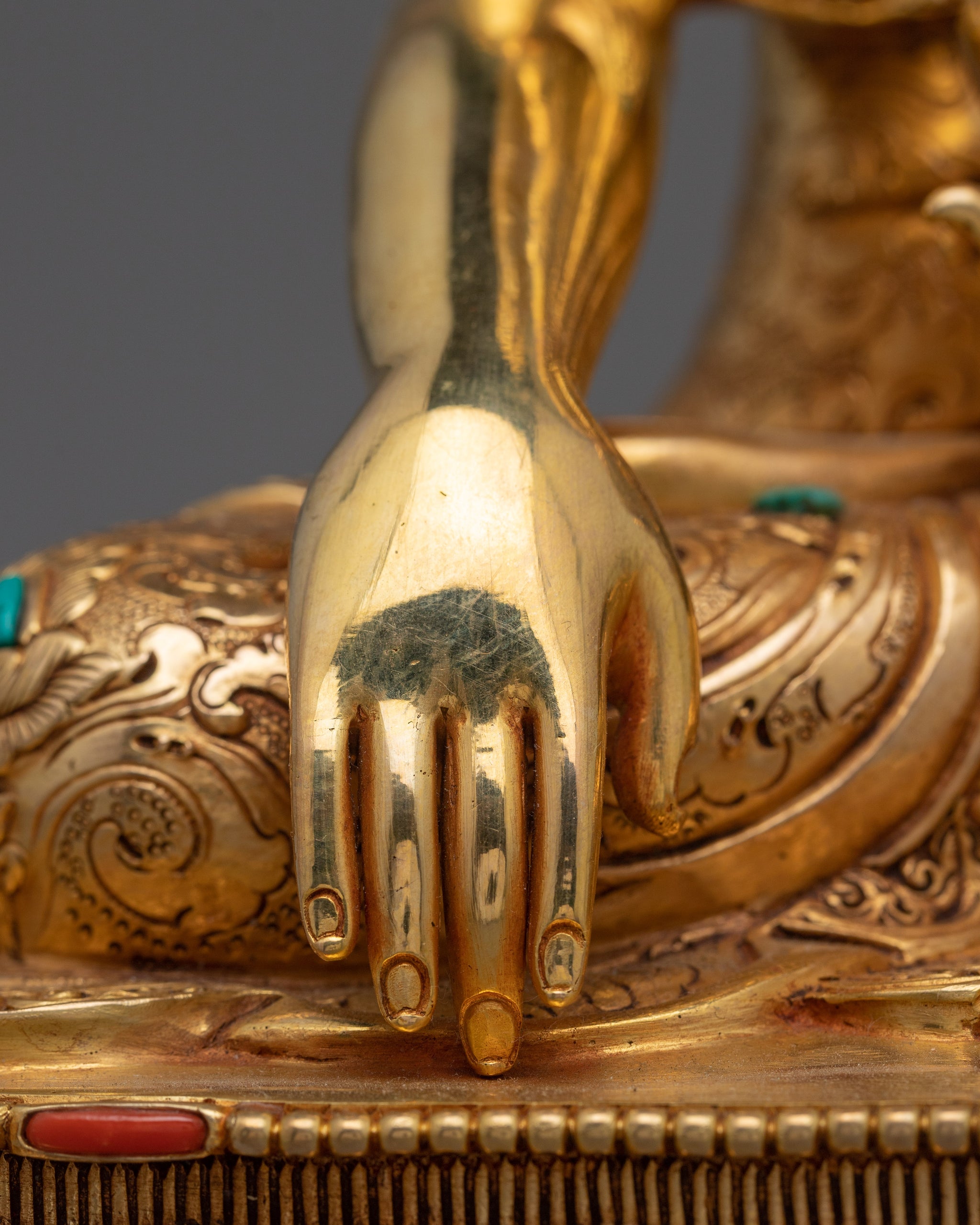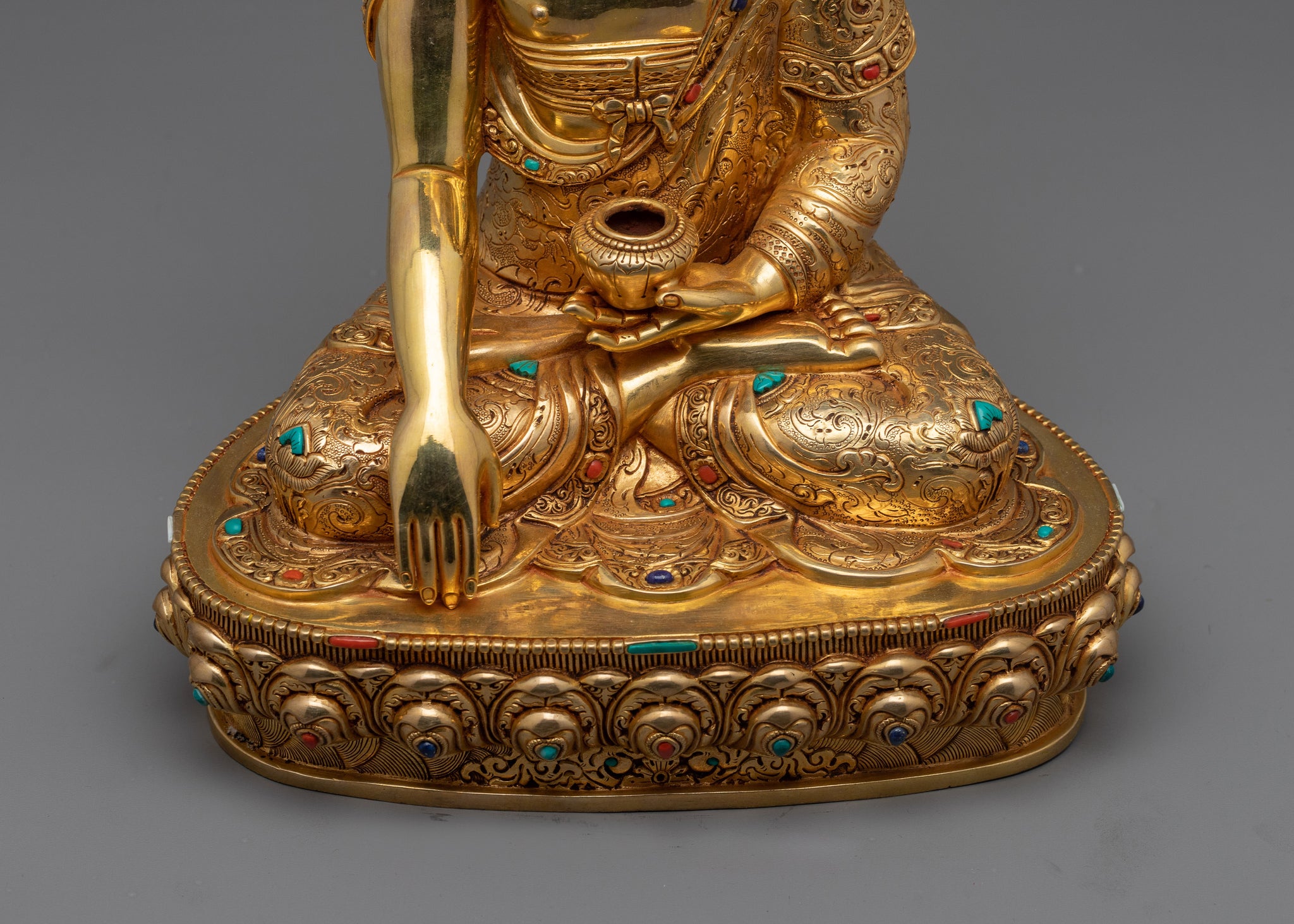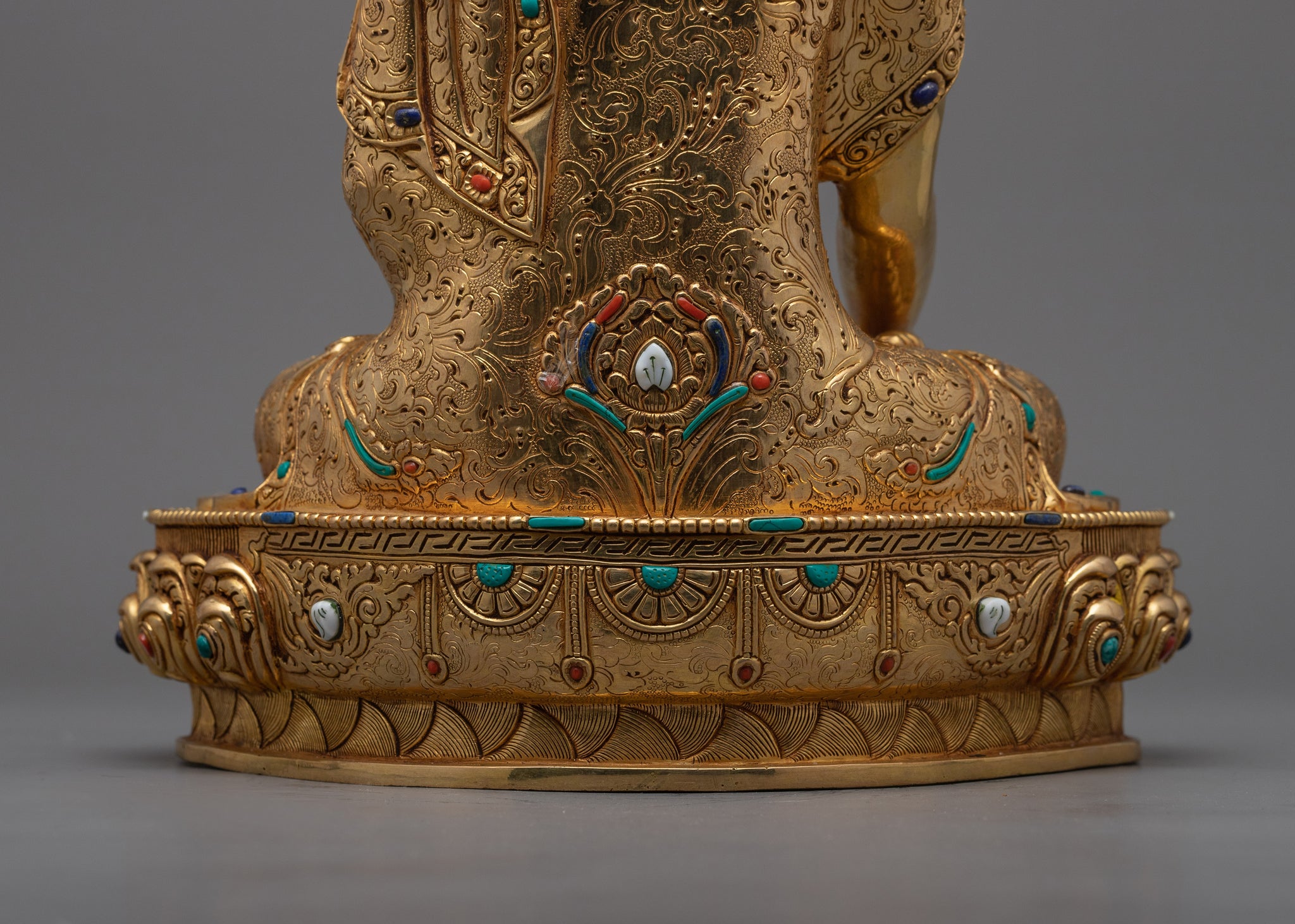 With the Jowo Shakyamuni Buddha Figurine, embrace the calm of spiritual enlightenment and compassion. This stunning sculpture, carefully crafted, captures the spirit of the real Buddha, Shakyamuni. With a height of 16.1 inches and a diameter of 12.6 inches, it radiates a feeling of calm and tranquility. This statue depicts the holy presence of Jowo Shakyamuni Buddha and is adorned with hand-carved gemstones on a copper body, 24K gold gilding, and paintings in gold and acrylic.
