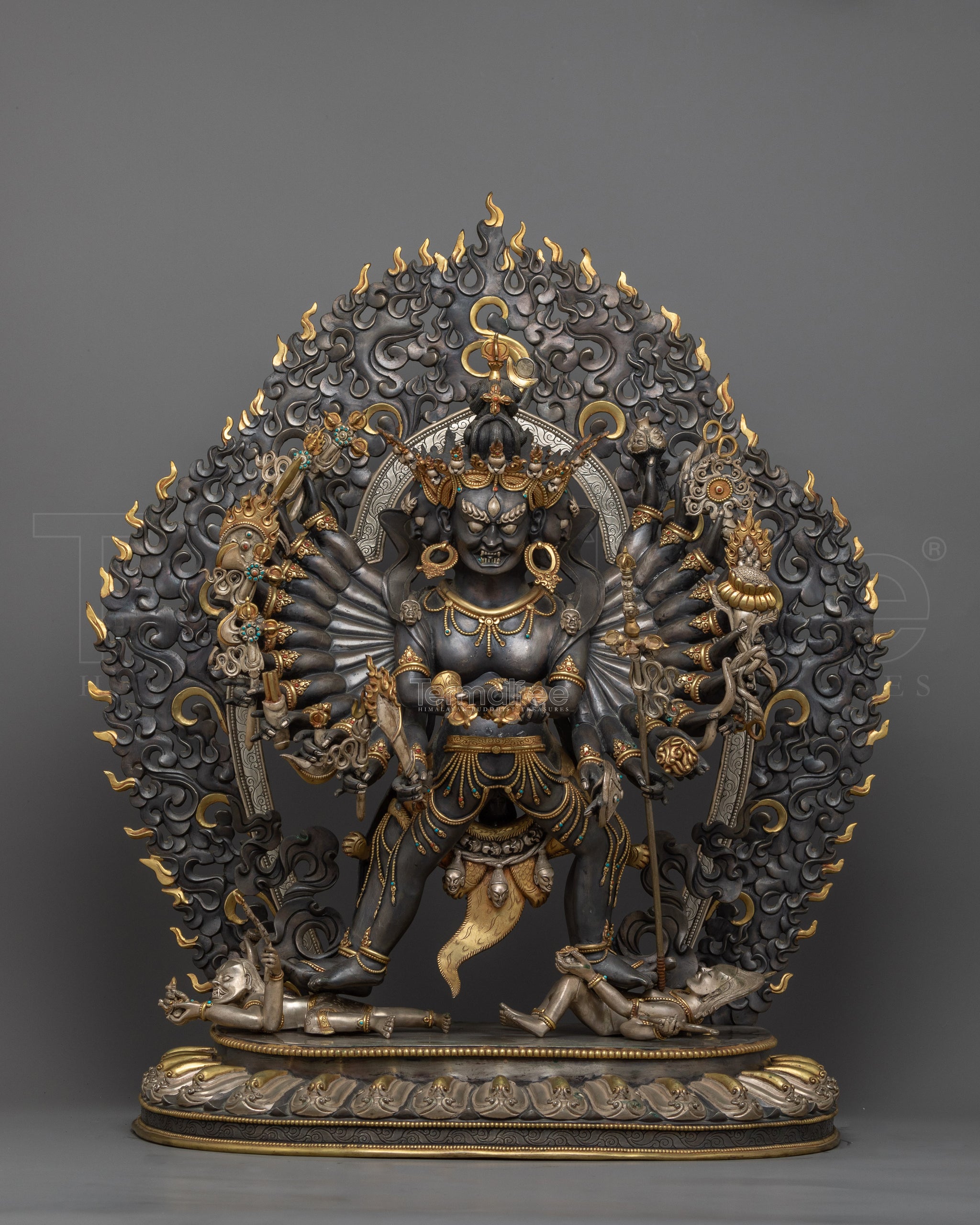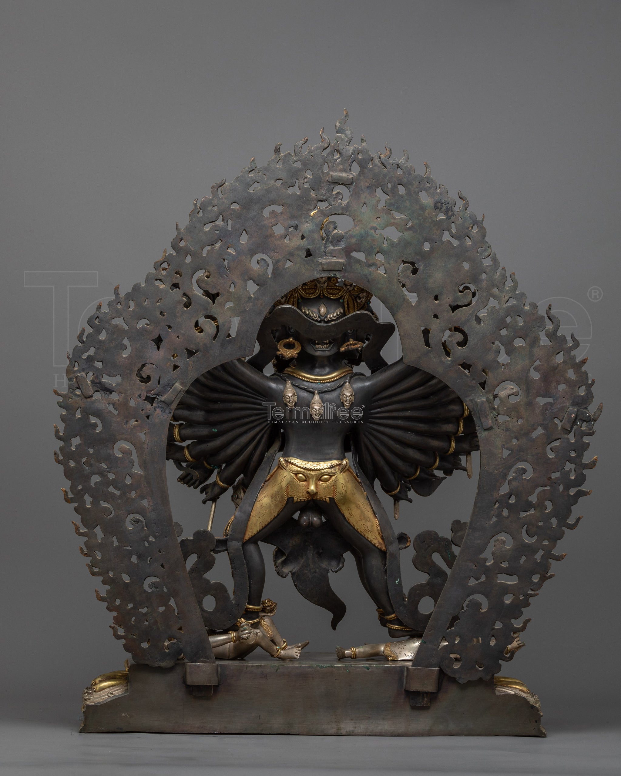 The wrathful deity Kalachakra is accompanied by his consort Vishvamata in the statue. The two are depicted in the union, which represents the union of wisdom and compassion, which are essential for achieving enlightenment. Both the deity and his consort can be seen standing on the sun disc lotus seat over two human figures that represent the triumph of good over evil. The two figures are surrounded by fiery motifs as a representation of the teachings of Kalachakra's transforming power, which is claimed to lead to the achievement of supreme wisdom and enlightenment. The deity is depicted with multiple arms, each holding an item iconic to his divine powers and abilities.