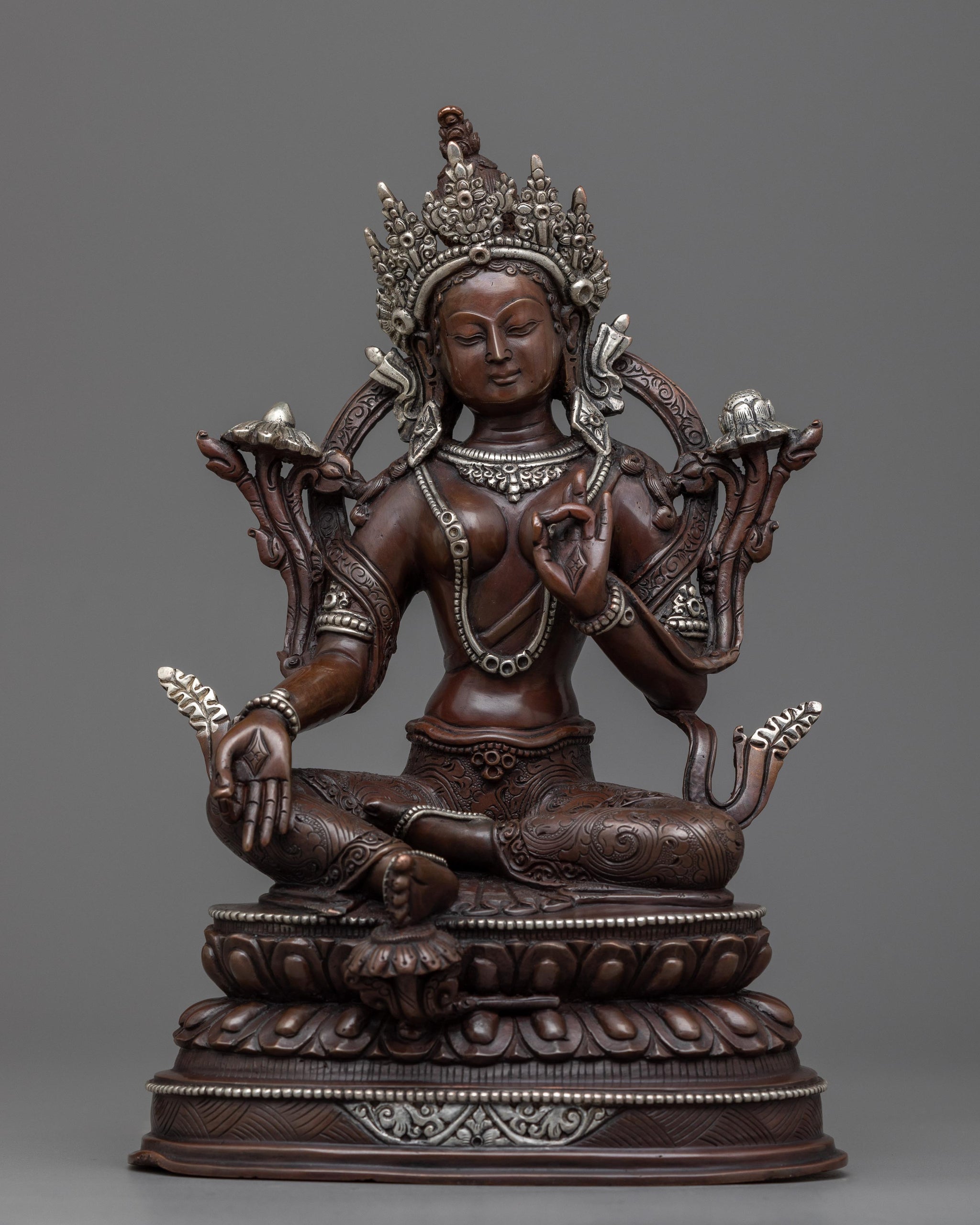 Our exquisitely made Khadiravani Tara statue, also known as the Green Tara, will bring peace into your environment. It easily fits in a variety of locations, from your own meditation place to a corner in your living room, spreading tranquility all around, with measurements of 9.4 inches in height and a 6.2-inch base. This handcrafted masterpiece, weighing 2.102 kg, features exquisite craftsmanship. Its silver-plated, oxidized copper body is a tribute to the skilled craftsmanship practiced by generations of Nepalese artisans. The statue comes to life thanks to the artisan's great attention to detail, offering an accurate representation of Buddhist tradition.
