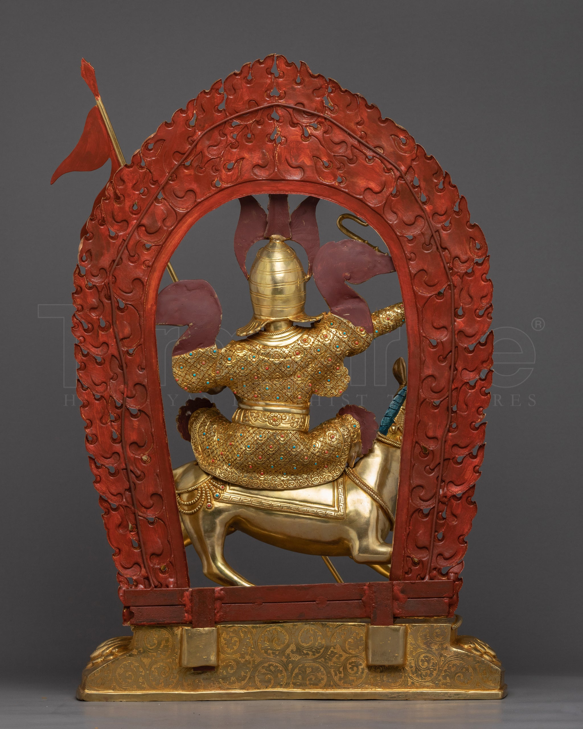 The magnificently sculpted, rare King Gesar Statue is hand-carved in our studio in Kathmandu, with the utmost attention to detail. We have been sculpting sacred deity statues for generations, carrying an ancient Himalayan tradition. We have molded the figure using a copper body and gilded it using genuine 24k gold. He is the fearless lord of the legendary kingdom of Ling. We have depicted him as a Tibetan warrior atop a horse with a wrathful expression. Clad in armor and a helmet with elaborate flag pennants and streamers.