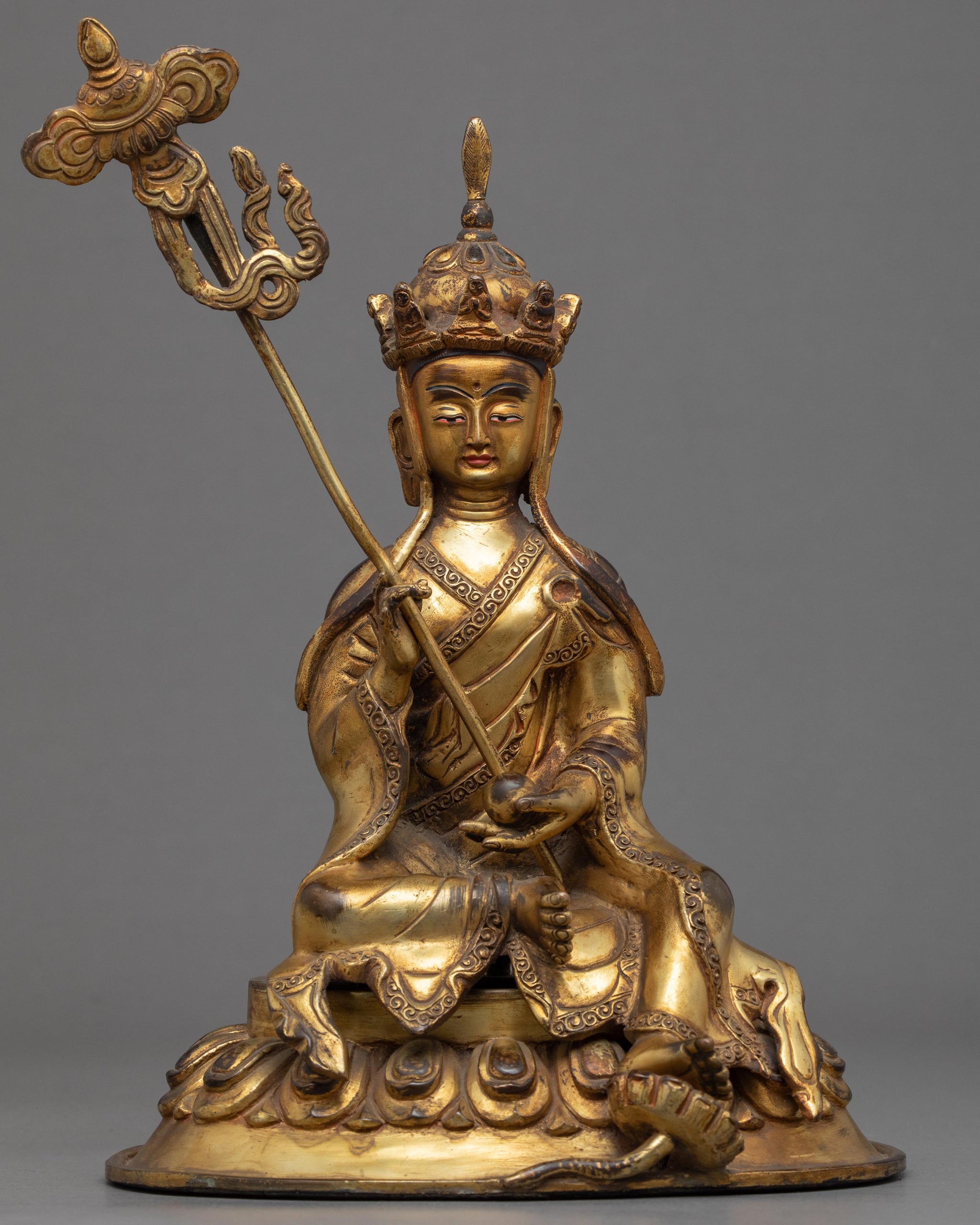 We have sculpted the exquisite Kshitigarbha Bodhisattva in traditional Himalayan art. Artist has beautifully hand-carved this sculpture with a pure copper body and is gilded with 24K Gold. The antique finish is given by the artists, which is done over the gold body of the statue. The deity is depicted seated over a moon disc lotus with royal Kasaya robes that he wears. The holds a staff with both hands, which is slightly tilted. An antique painting has also been used to give a unique look to the sculpture.