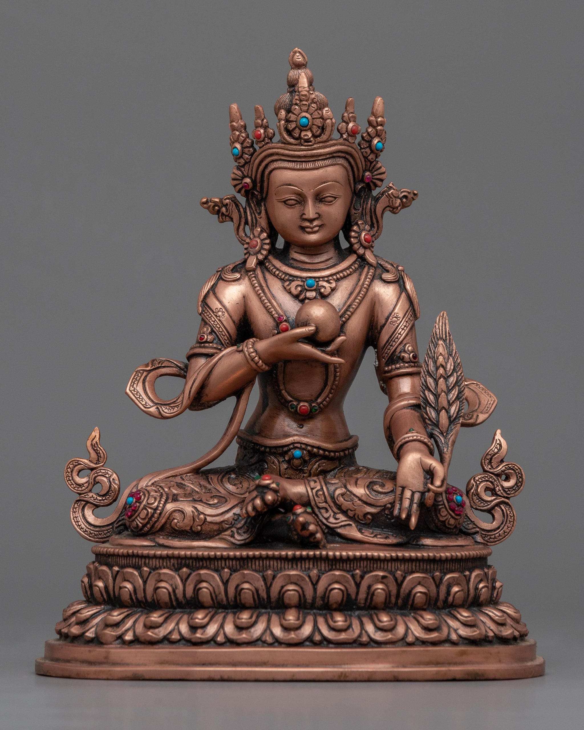 The Kshitigarbha bodhisattva is depicted serenely seated atop a moon disc lotus seat holding a pearl in his hand, which represents his role as a protector and guide for all beings who are lost, suffering, or in need of help. He can be seen wearing a five-jeweled crown representing the five transcendental virtues of wisdom, compassion, generosity, morality, and meditation. The statue features intricately detailed hand-carvings done on the copper body with hammers and chisels by our artisans in our studio, especially for his robe, lotus seat, and headpiece.