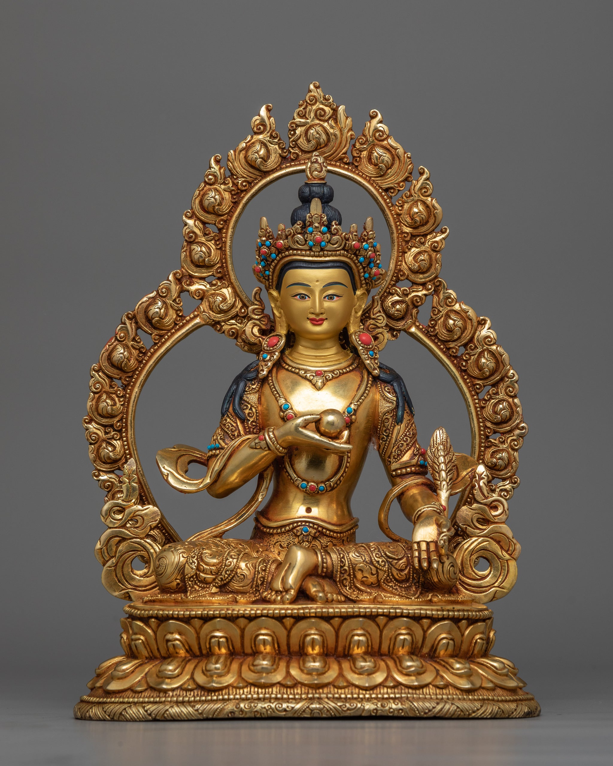 Made of a copper body and gilded in 24 carat gold, this statue gleams with a splendid polish that accentuates the expression's intricacy and the fine carvings on Kshitigarbha's monastic robes and staff. The features are given more depth by the acrylic paint, which improves the figure's realism. With its substantial weight of 2.672 kg, the monument anchors any area with its creative integrity and spiritual value.