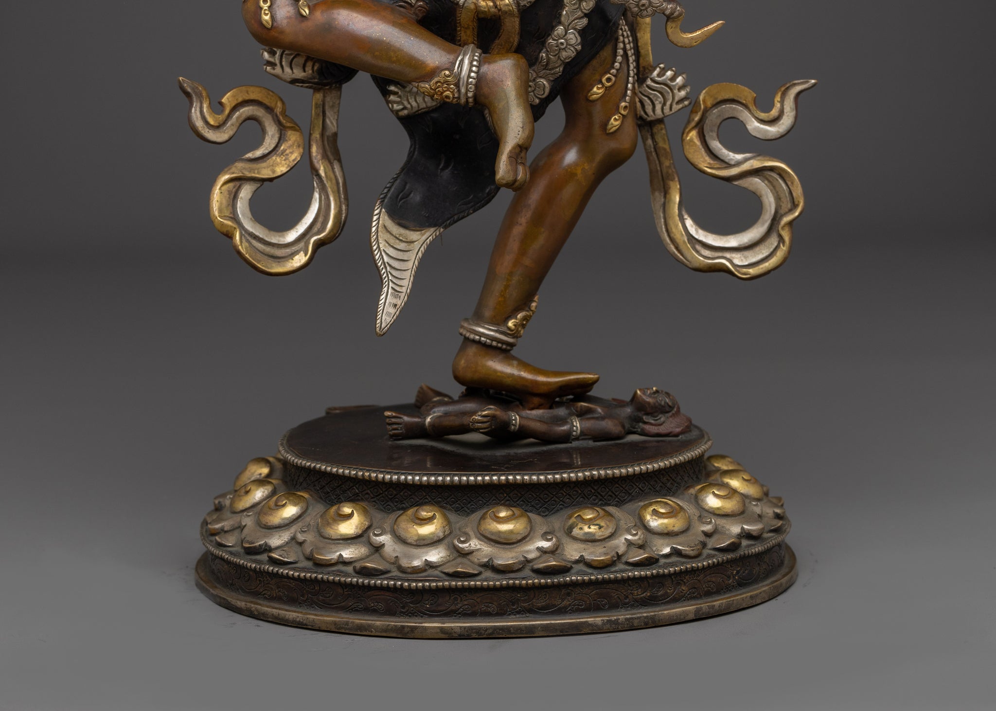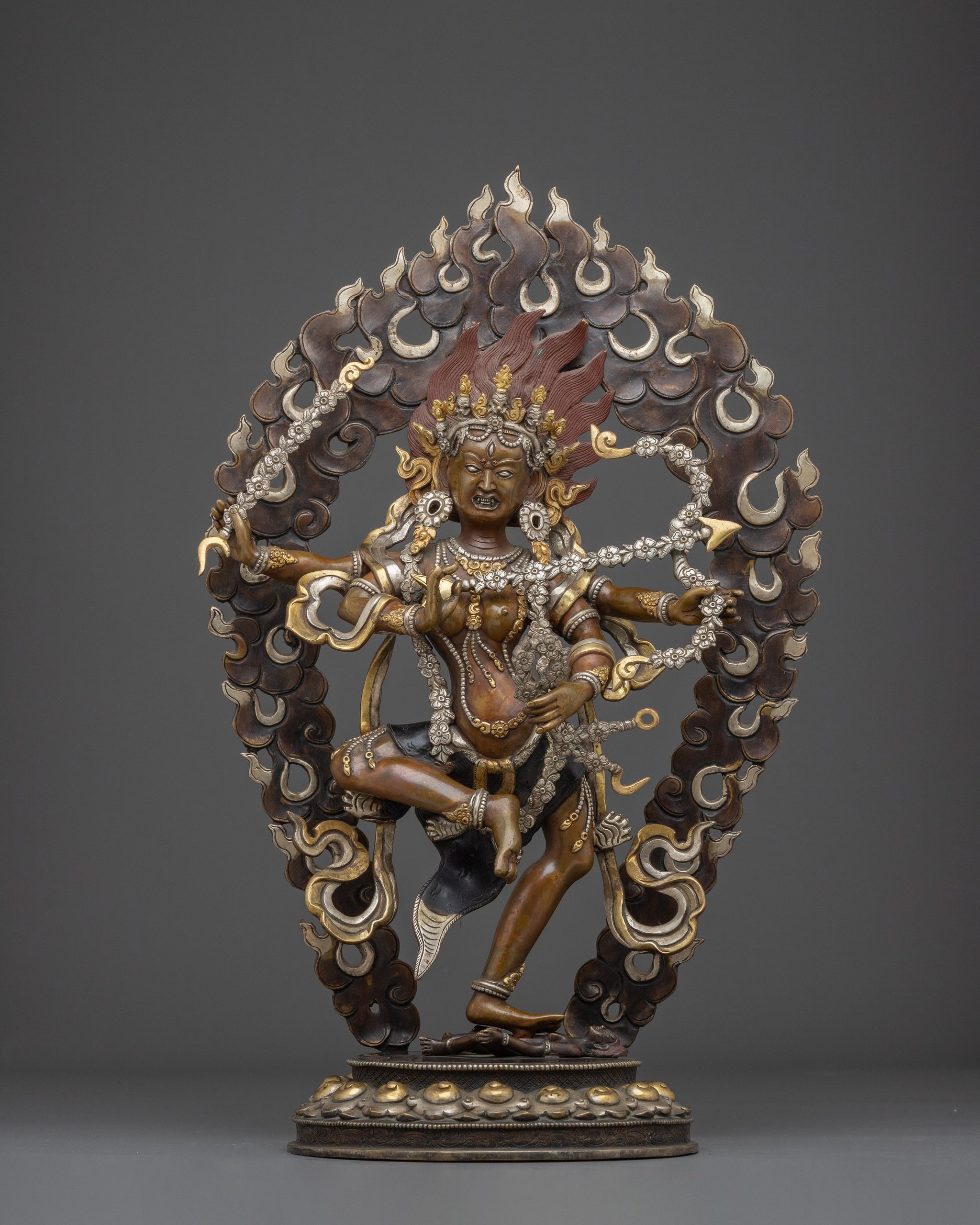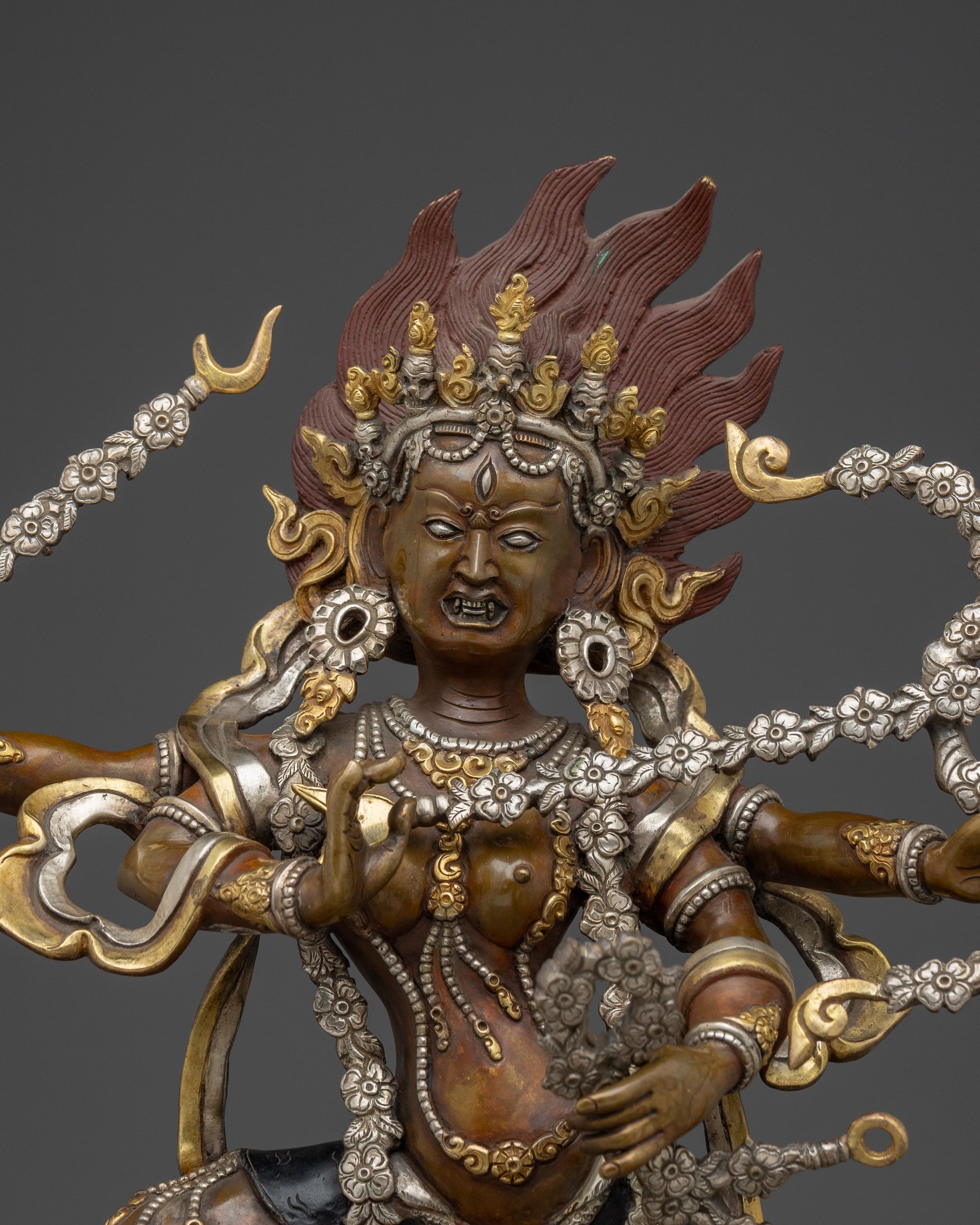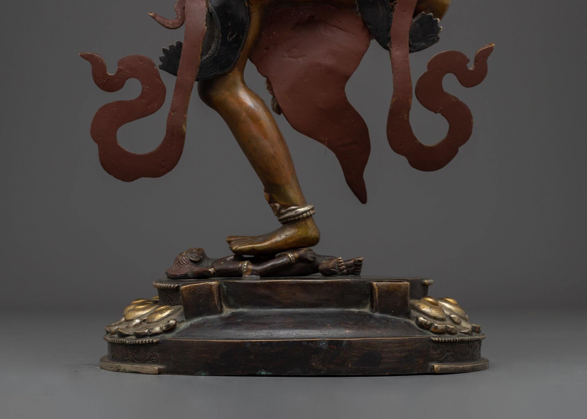 Kurukulla Art, Wrathful Compassion Deity, stands 20.9 inches (53cm) tall with a broad base measuring 13.2 inches (33.5cm), and weighs 6.93 kilograms, giving it a prominent and dignified presence. Expertly handcrafted from oxidized copper, covered with 24K gold gilding. This sculpture, handcrafted by expert Nepalese artisans, elegantly symbolizes Himalayan Buddhism's sacred traditions, making it an appropriate addition to altars, meditation places, or sacred collections.