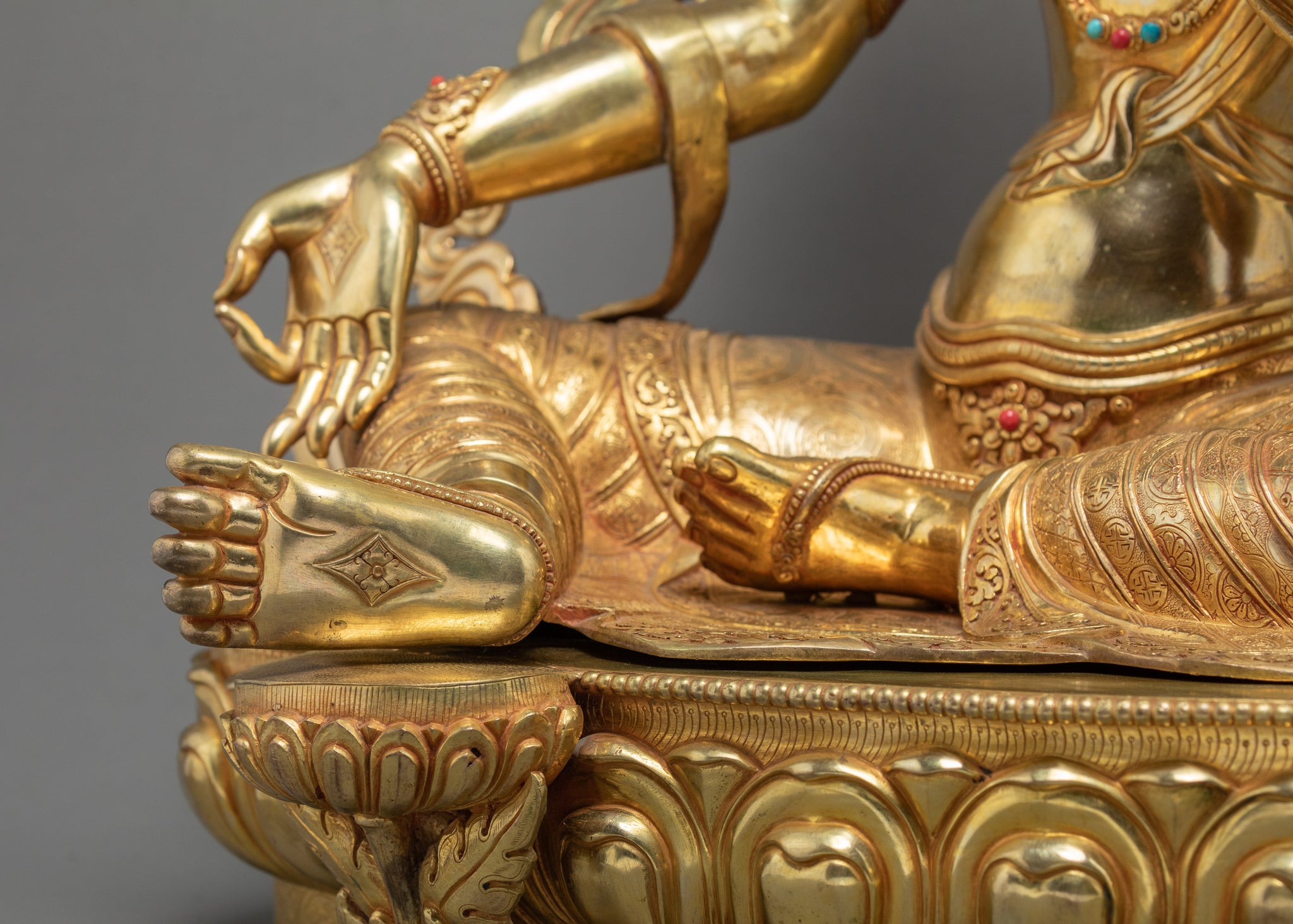 Purely gold gilded, her face depicts the utter calmness and serenity. Her beautifully crafted eyes gaze into the eternity. She is fully gold plated and carved with refined patterns and motifs using the traditional approach of the Himalayan Art form. The use of semi-precious stones on her has added an amazingly beautiful contrast to her golden body. From her jewelled crown, ornaments, her silks, every details are carved to precision. These rare and exotic forms of refined artistry are one distinctive feature of Himalayan Sculpting art culture.