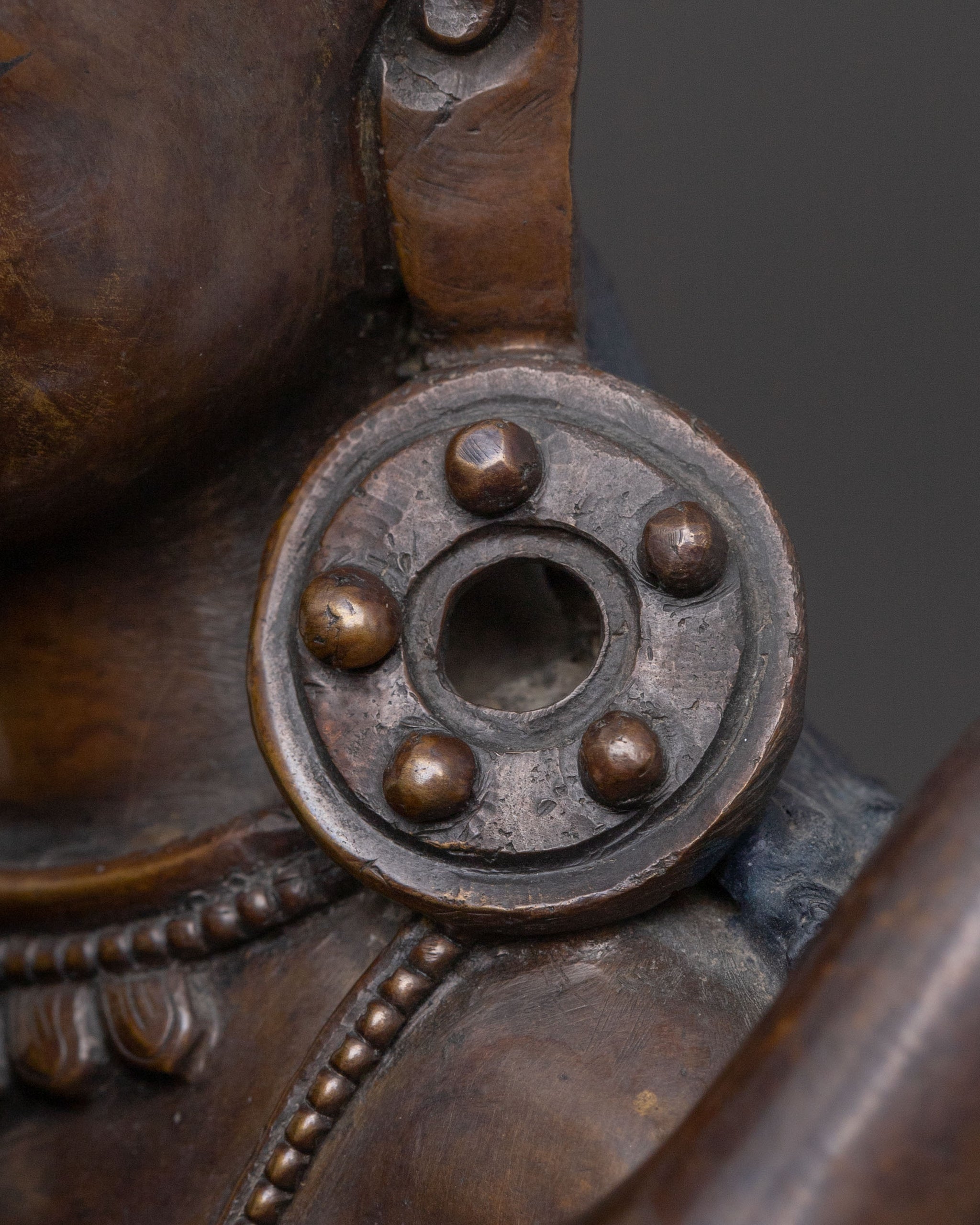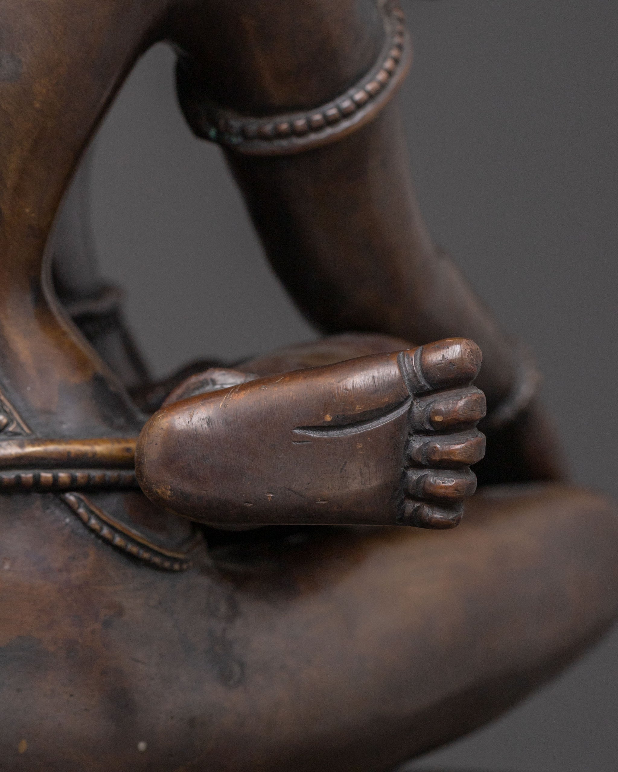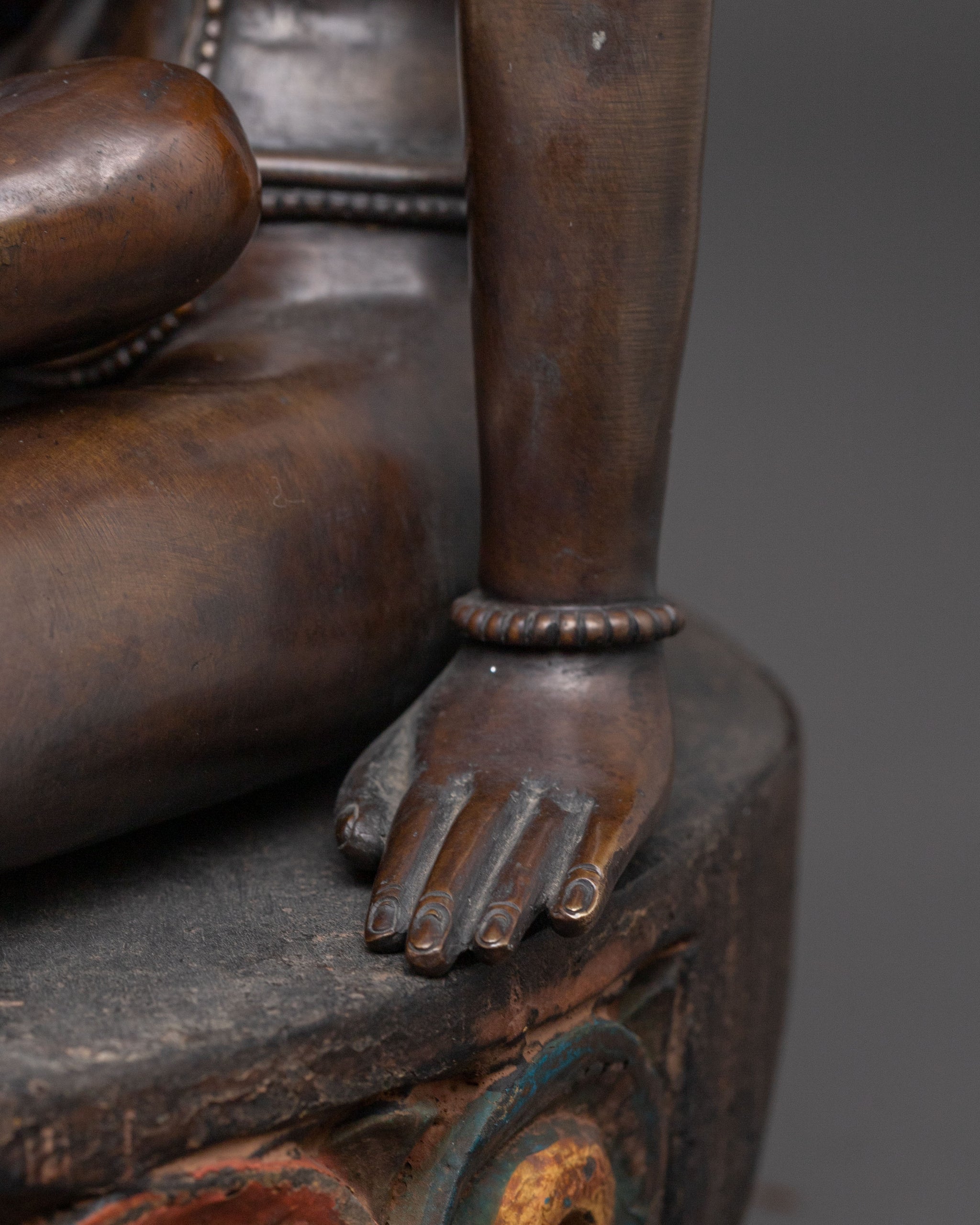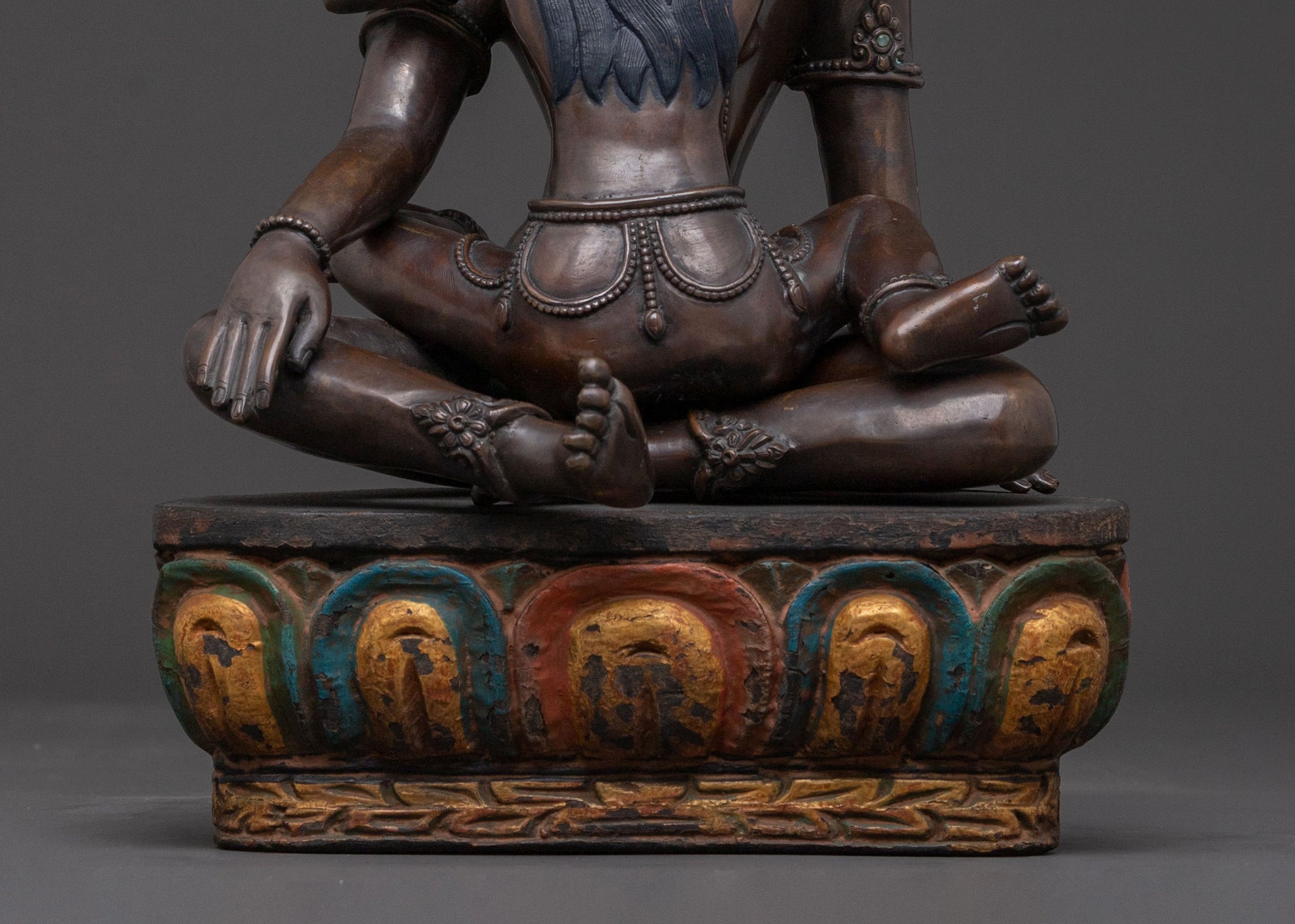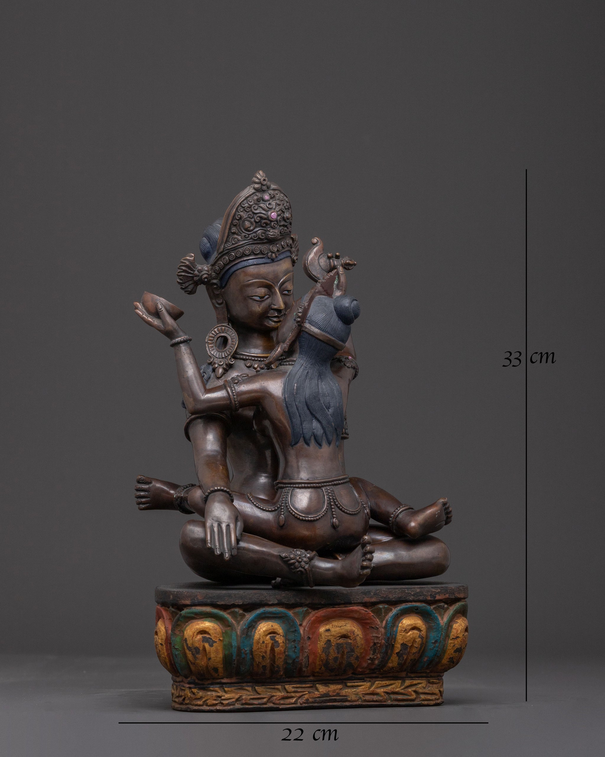 Radiating profound serenity and spiritual depth, this Lokeshwor with Consort sacred statue beautifully embodies the essence of divine compassion and perfect wisdom. Masterfully crafted from oxidised copper and adorned with delicate, hand-painted acrylic details, this 33 cm tall piece depicts Lokeshwor in a tender, protective embrace with his consort. Covered with a triple layer of 24K gold gilding, the statue shines with a radiant and sacred glow. Its surface is carved with deeply engraved details, producing a magnificent 3D-like effect that enhances its spiritual and artistic significance. Its inviting and tranquil presence cultivates a deeply devotional aura, making it ideal for enriching any sacred space or meditation area.