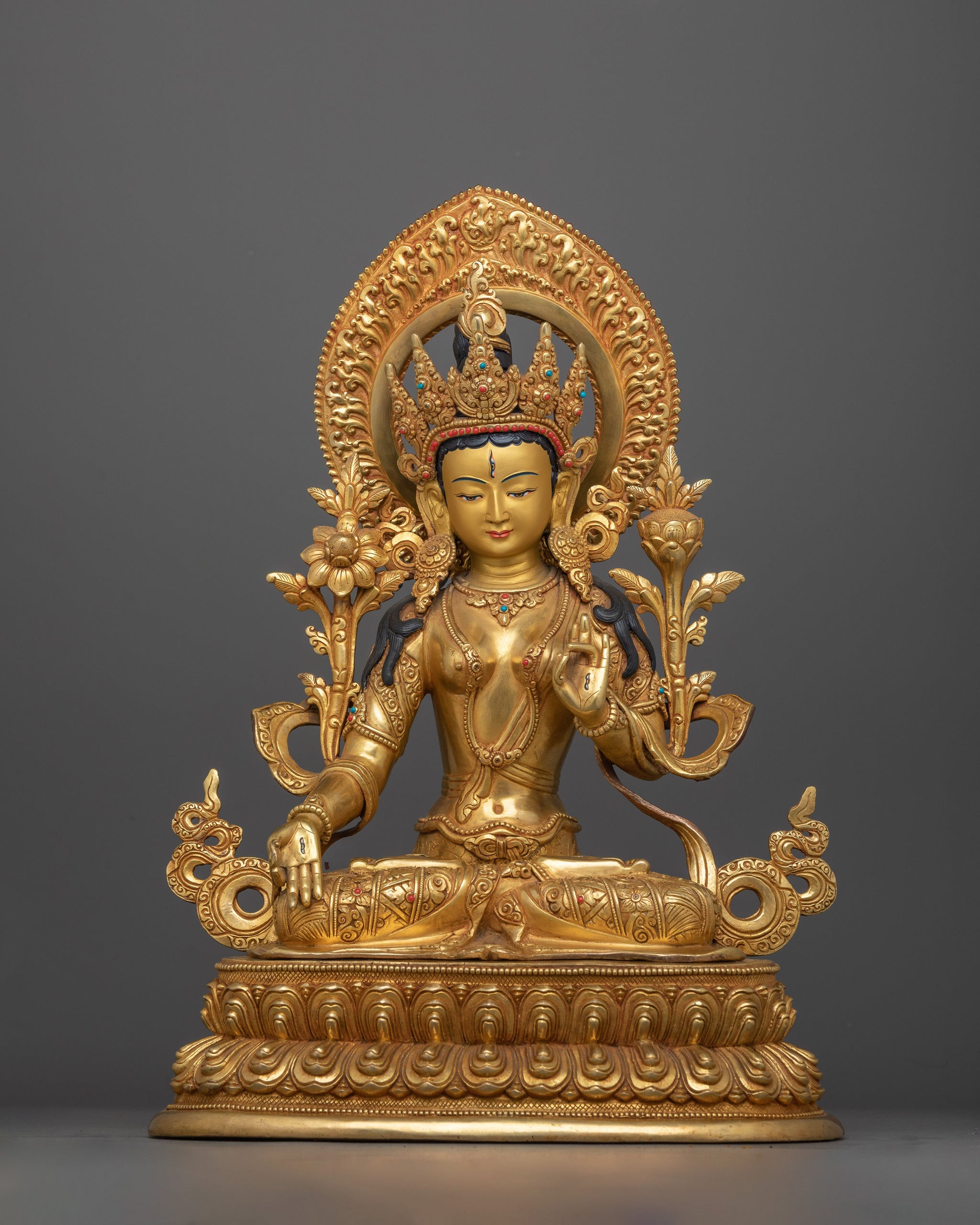 Standing 16.7 inches tall with a base width of 11.8 inches, White Tara, often referred to as the Buddha of Long Life, is portrayed in this exquisite artwork, handcrafted in Nepal, with the copper body delicately embellished with triple layers of 24K gold gilding, deeply engraved carving, and intricate acrylic & gold paintings which is designed to radiate tranquility and spiritual protection. It weighs 6.78 kg and is beautifully detailed, symbolizing White Tara, the goddess of protection, healing, and long life.
