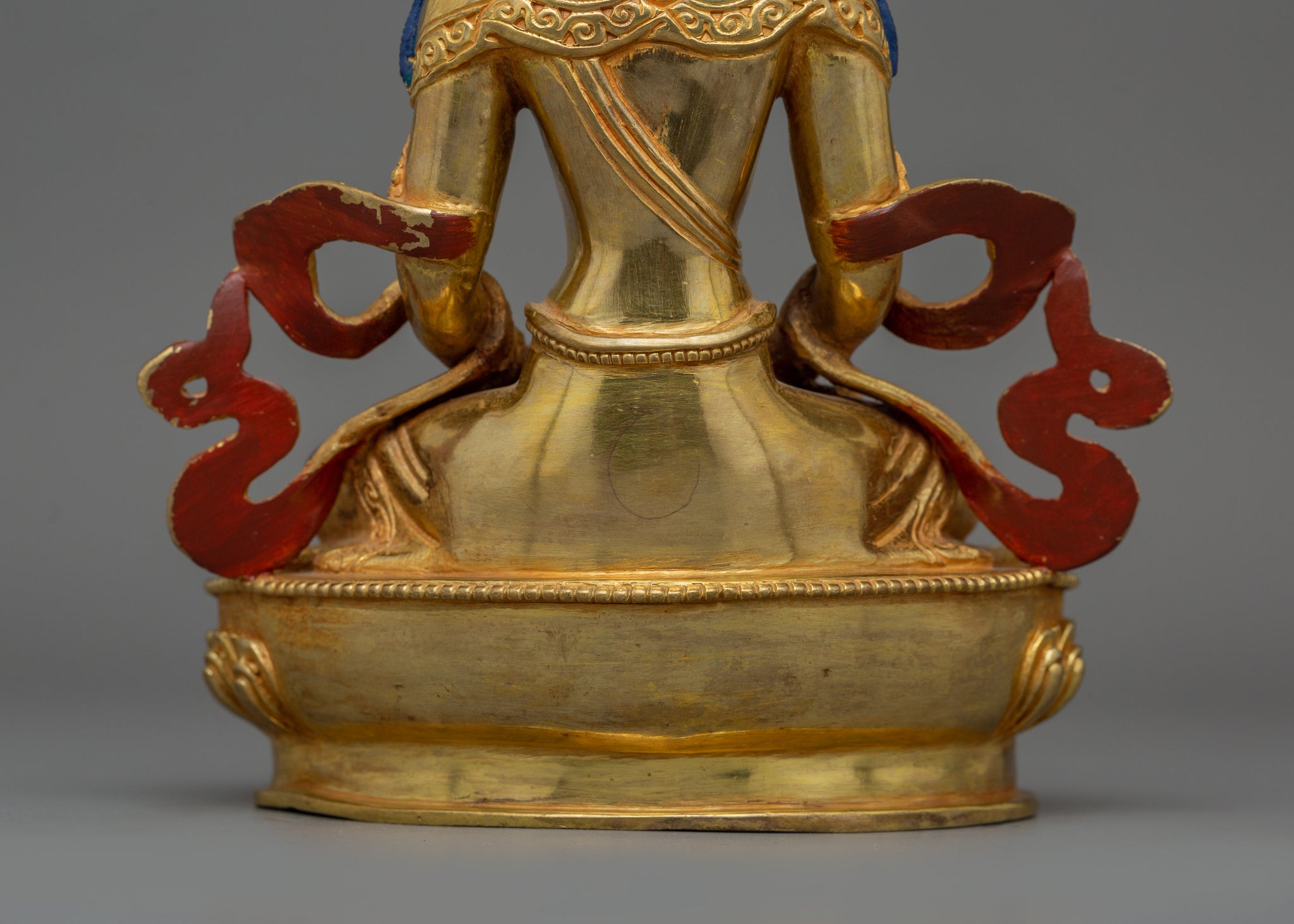 Vajrayogini is stunning. The details are amazing. It's easy to make out her facial expressions, skulls, feet, and the ring of fire around her. You can tell she's handmade. There is a consecration hole in her back.