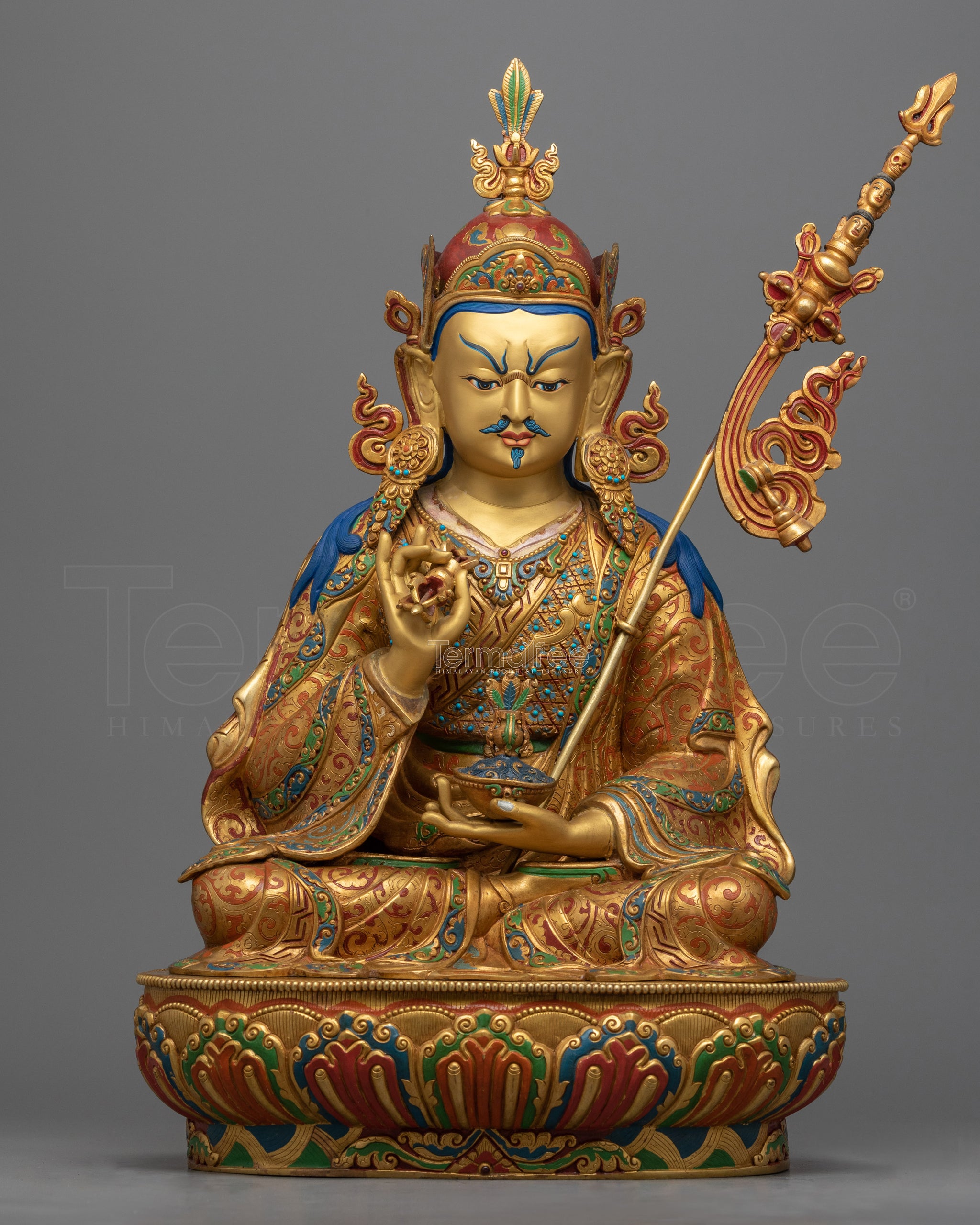 This beautifully crafted piece of Lotus born master, Guru Rinpoche Statue employs traditional Himalayan motifs and designs delicately produced in our studio. The statue's copper body is gilded gold and painted with acrylic colors, giving it its sheen and brilliance. In the statue, the Lotus-Born is depicted regally seated atop a moon disc lotus seat holding a vajra in his left hand and a skull vase with a jar of immortality in his left. In the arc of his left hand, he holds the Khatvanga trident, his celestial ally of bliss and emptiness. The Guru's body is filled with artistically placed jewels that add to the statue's prominence.
