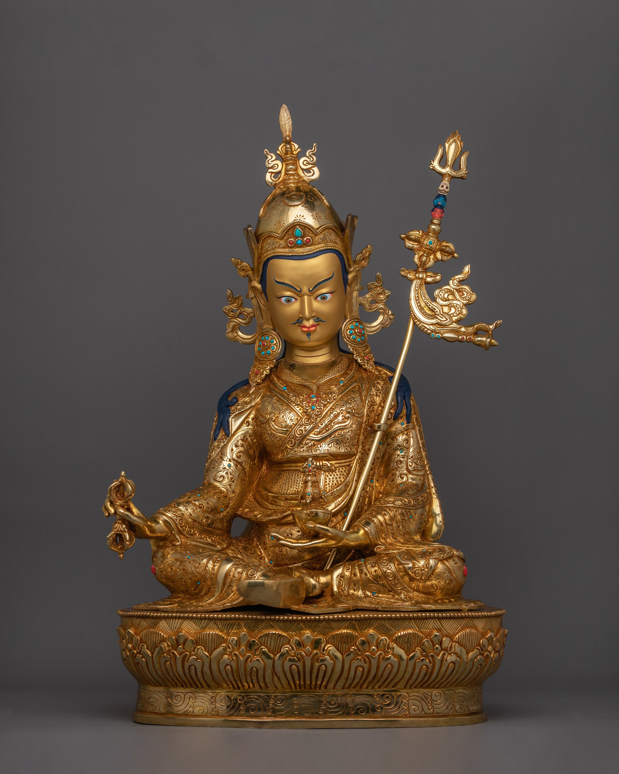 This handmade statue of lotus-born precious master Guru Rinpoche is standing at 21.9”/55.5cm (Height) and 14.2”/36cm (Base). This statue is made up of a copper body with 24k gold gilding and gemstones. Designed by talented Nepalese artisans, this detailed sculpture is ideal for altars, meditation areas, or as a meaningful decor item for individuals seeking awareness in their daily lives.