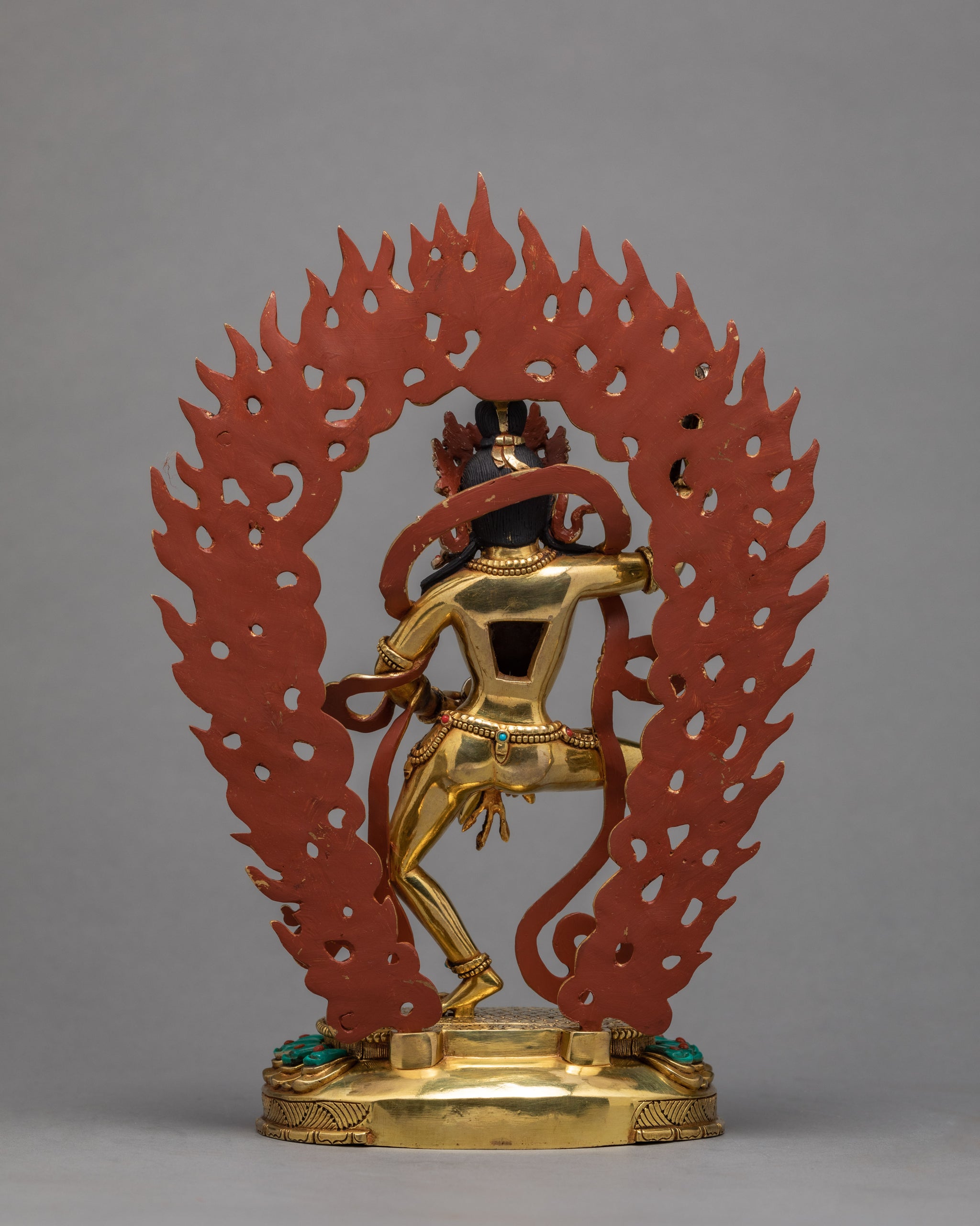 Machig Labdron is known as a reincarnation of Yeshe Tsogyal and the renowned eleventh century tibetan Trantric Buddhist Master. This Statue has one face with two hands. Her right hand plays a golden drum in the sky, the left supports a bell at her hip. Her three eyes gaze into space. Her hair is bound atop her head, the rest flowing free down her back. Her naked body is adorned with bones and jewels, With her right leg flexed and the left straight and she dances.Size: 27cm/10.62"(Height) X 13cm/5.11"(Base)