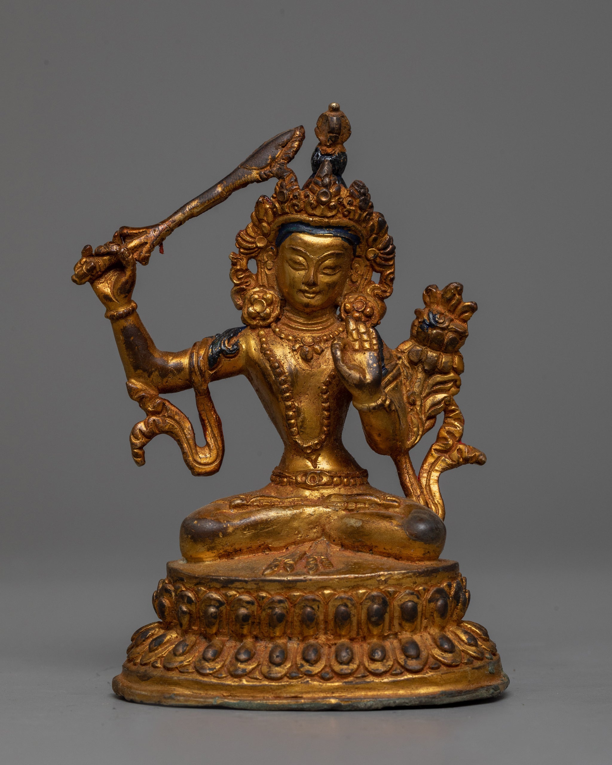 With our Illuminated knowledge: Machine-Made Manjushri Sculpture, a bright symbol of insight and clarity, you can experience the embodiment of illuminated knowledge. This little image of the Bodhisattva of Wisdom, Manjushri, has been molded with extreme perfection and emits a feeling of spiritual enlightenment and heavenly illumination.