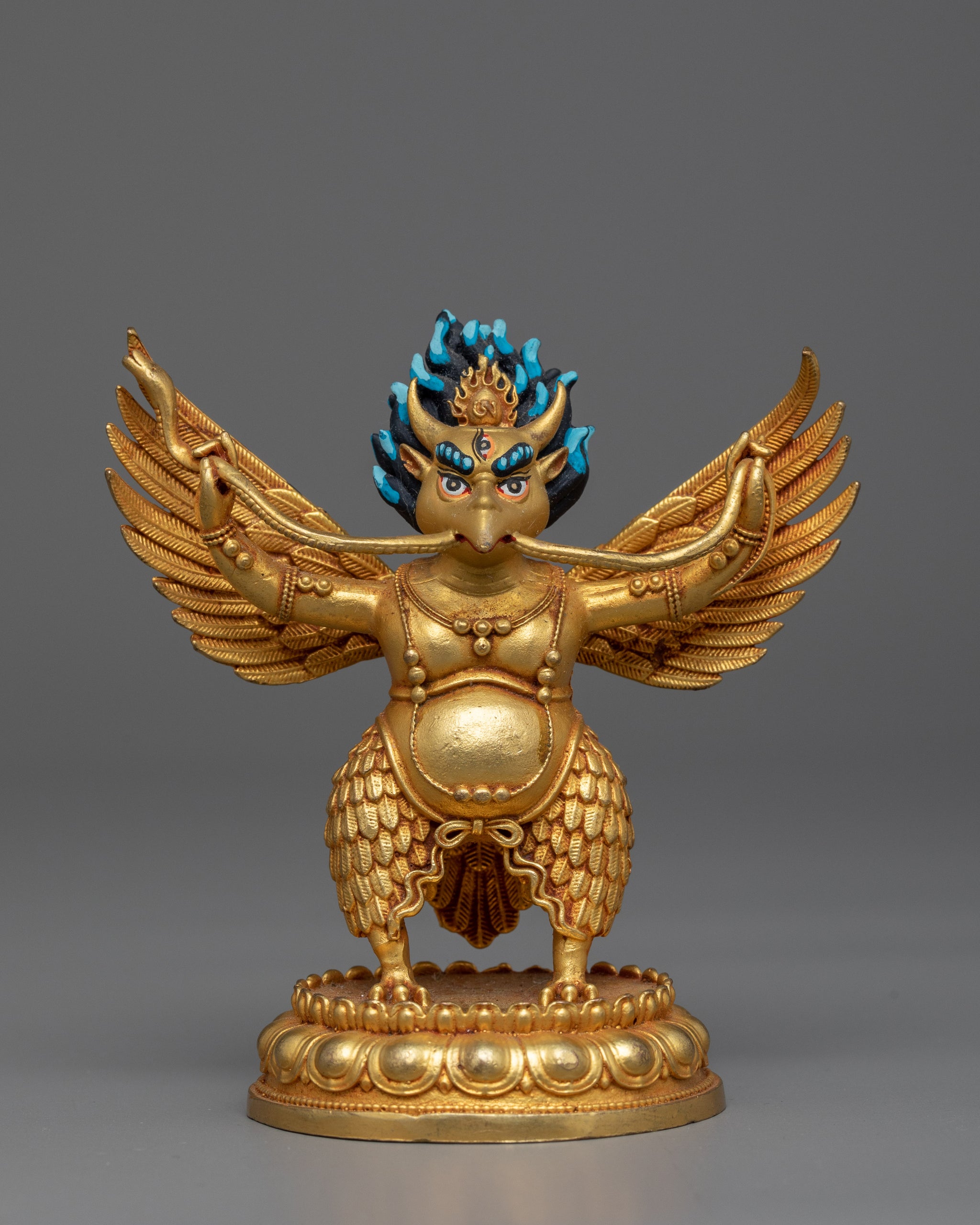 Gold electroplating is used to embellish this amazing figure, which is created via machine molding. Gold and acrylic paintings accentuate the fine details of Garuda's ferocious look and the ornate embellishments on his wings, giving the picture more depth and vitality. Its 0.154 kg weight makes it both impactful and lightweight, making it the perfect addition to any area used for spiritual development, meditation, or introspection.