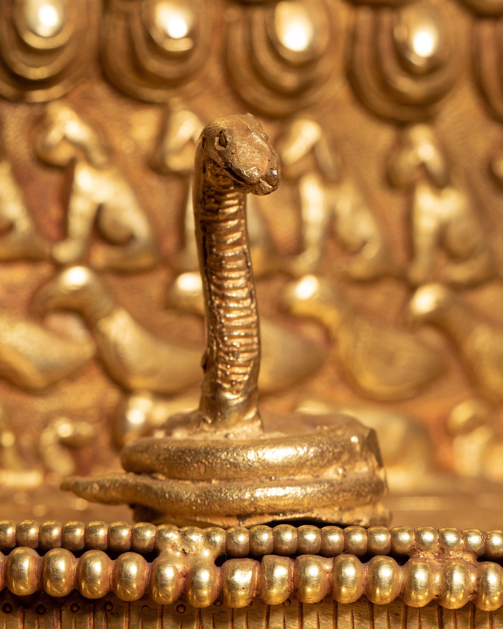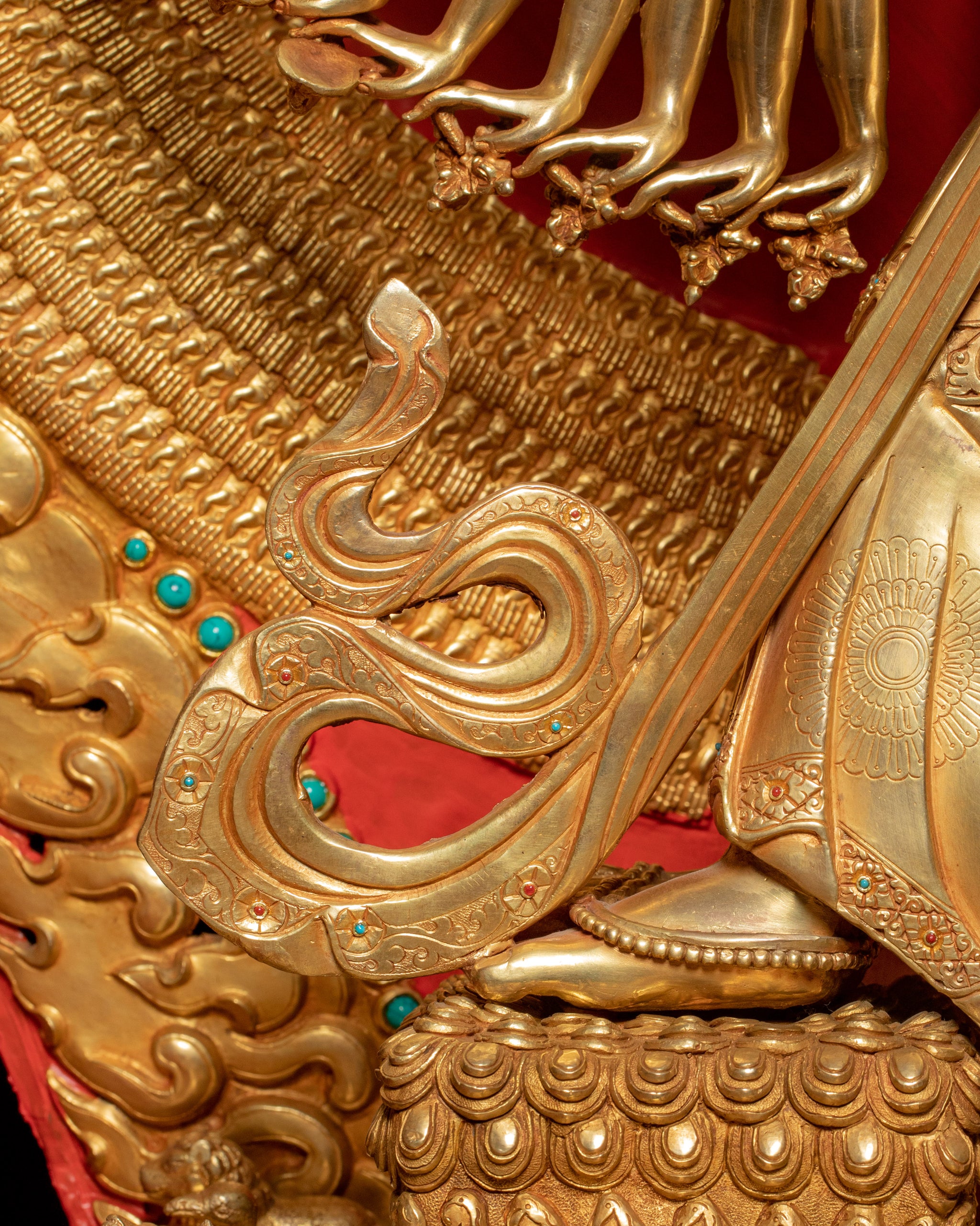 Towering at a remarkable 51.2” (130 cm) with a broad 35” (89 cm) base and weighing 48.60 kg, the 1000-Armed Dukar Statue commands attention with its grandeur. Fashioned from a copper core and lavishly coated in 24K gold, it’s brought to life through intricate gold and acrylic paintings and sparkling gemstones. This masterpiece showcases the finest Nepali artistry, skillfully created by expert hands. Whether gracing a grand altar, enhancing a meditation sanctuary, or starring as the centerpiece in a spiritual collection, this statue embodies protection and exquisite craftsmanship in one breathtaking form.