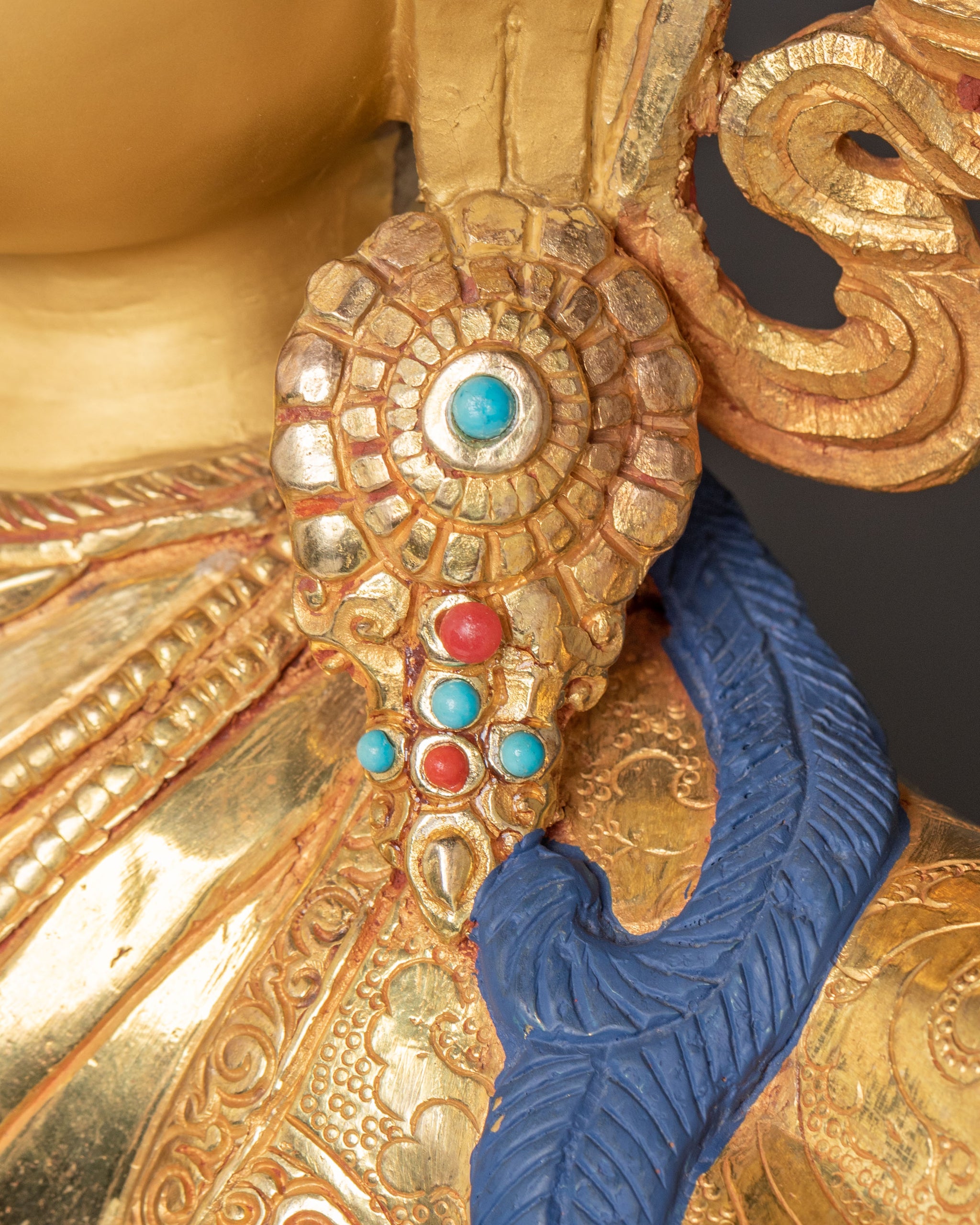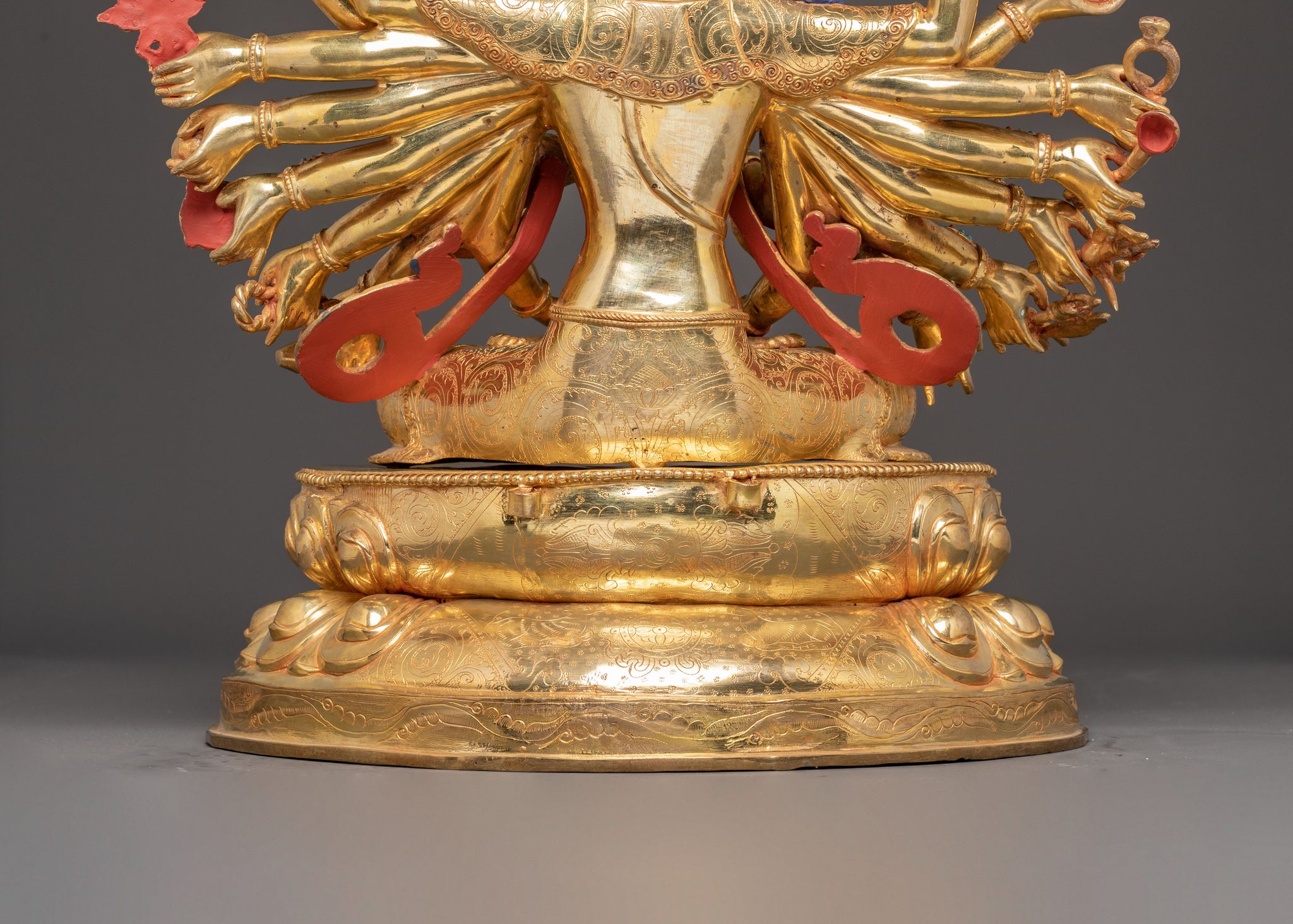 This magnificent Chundi Golden Statue depicts the goddess of purity and spiritual strength. This statue is a powerful representation of Chundi's cleansing and protective qualities, standing at an astounding 22.8 inches tall and weighing 16.38 kg. This sculpture, made of triple layer 24K gold gilded copper, represents Chundi's holy nature and her function as a guide to enlightenment.