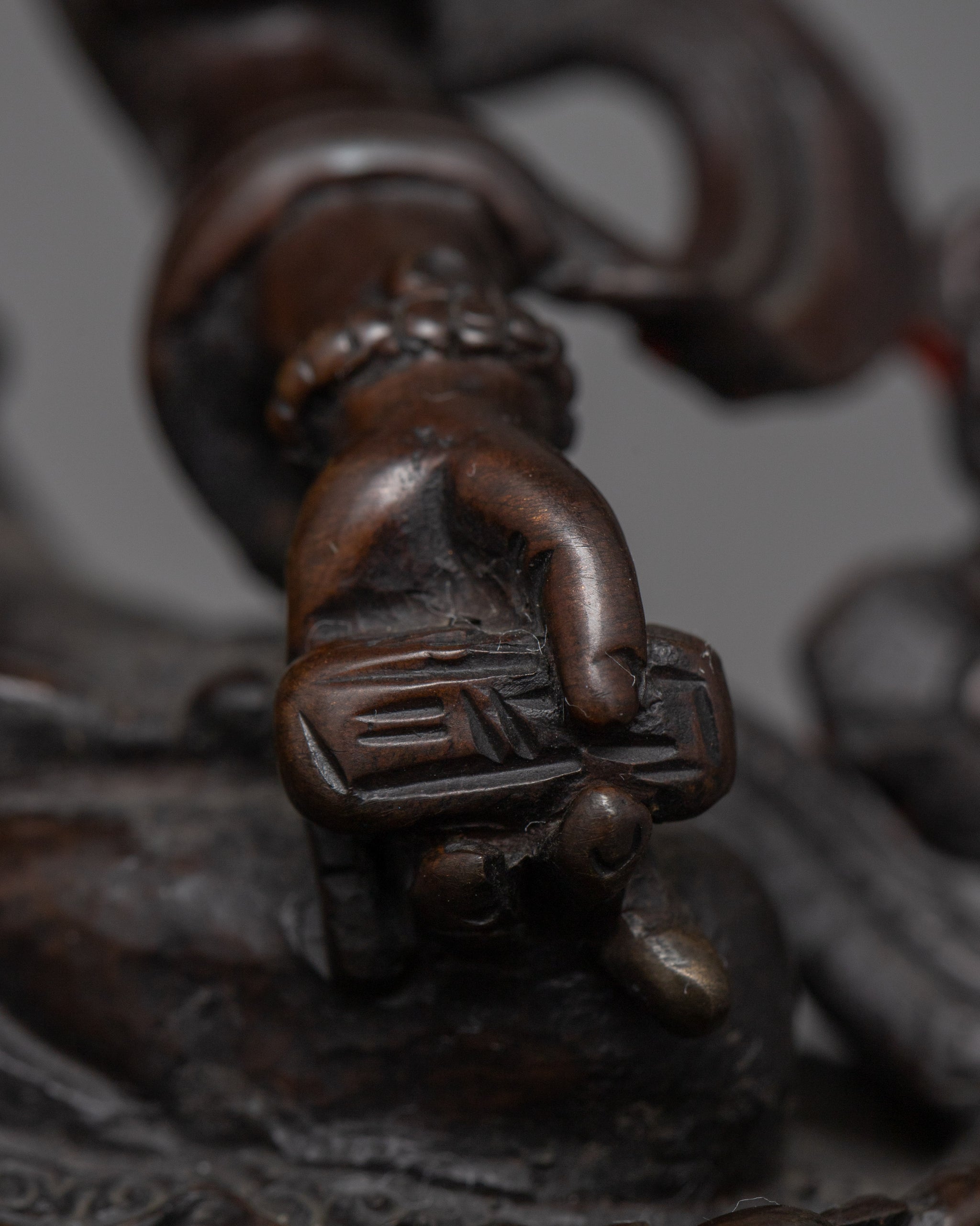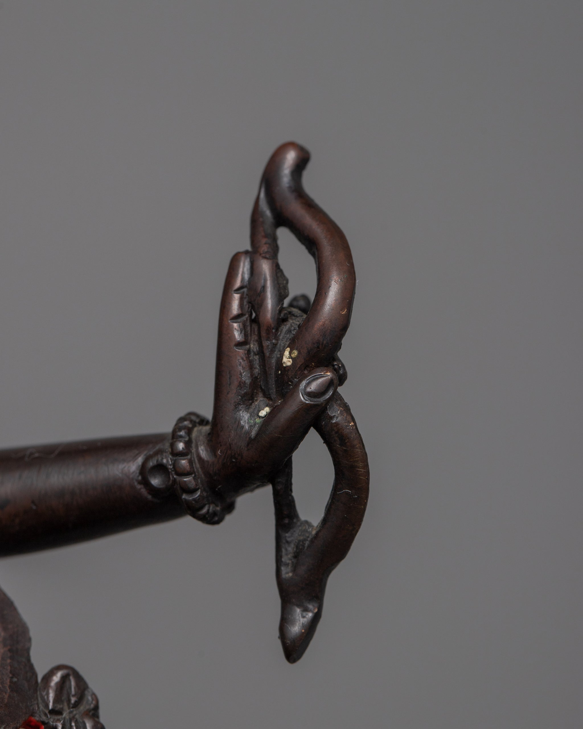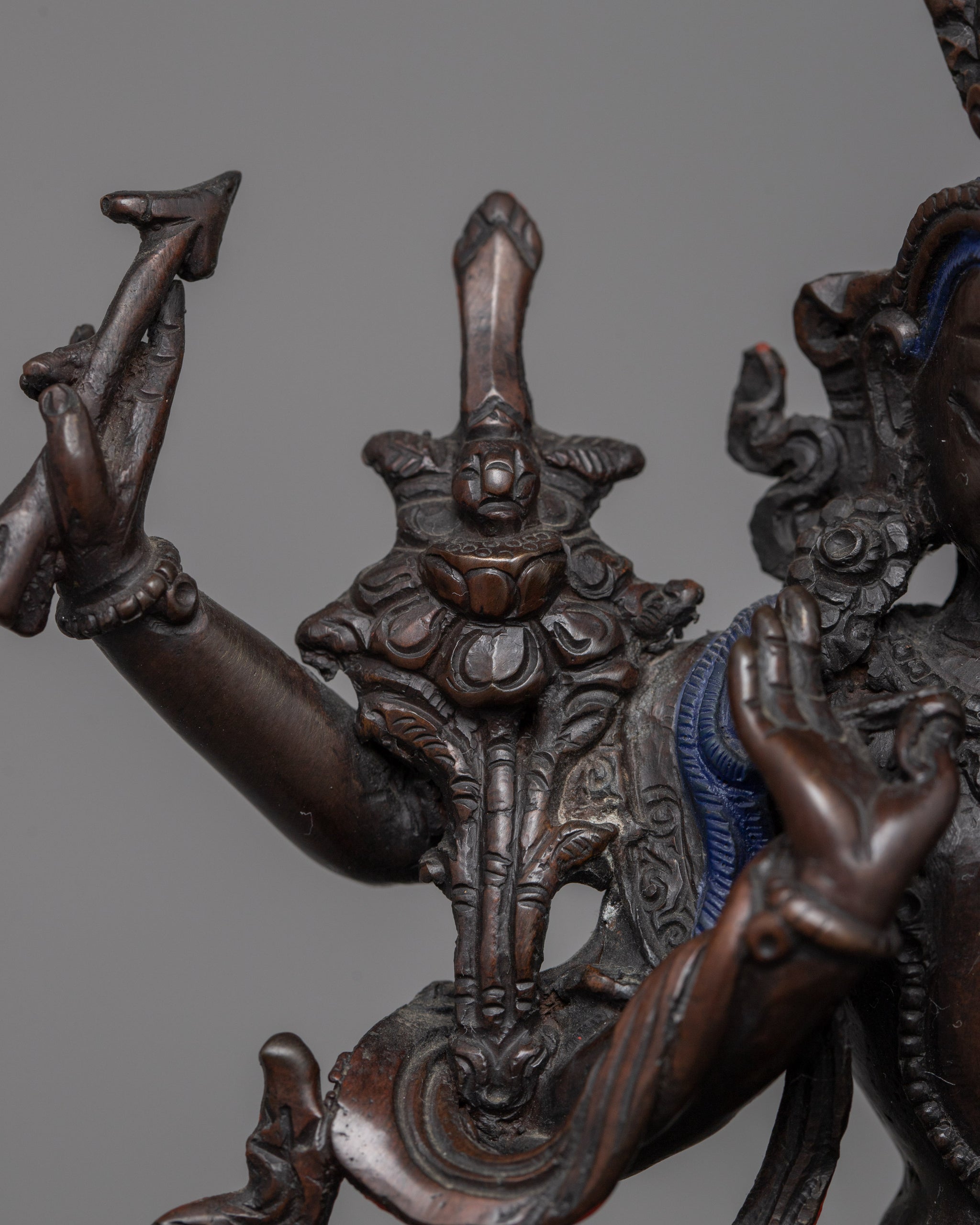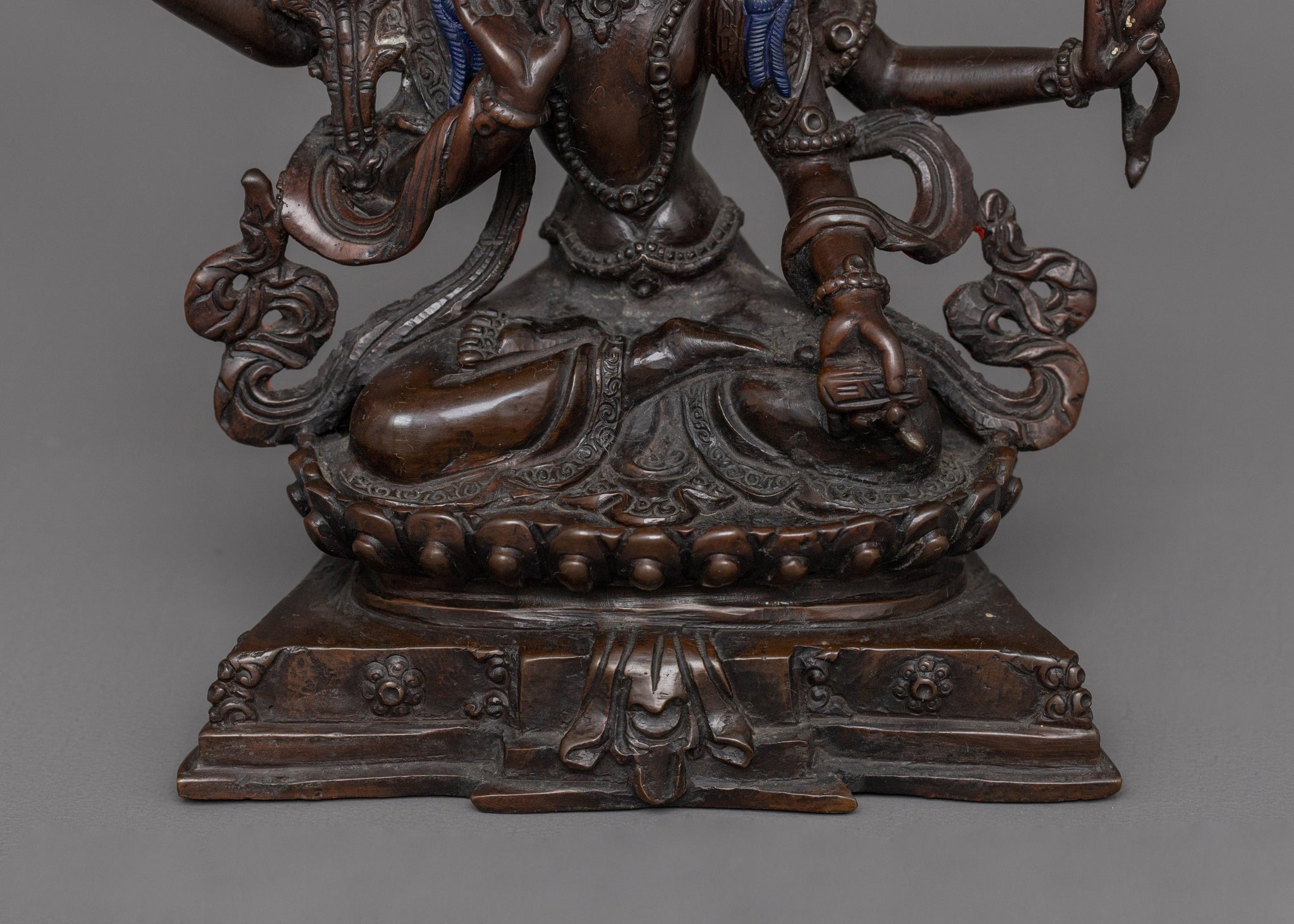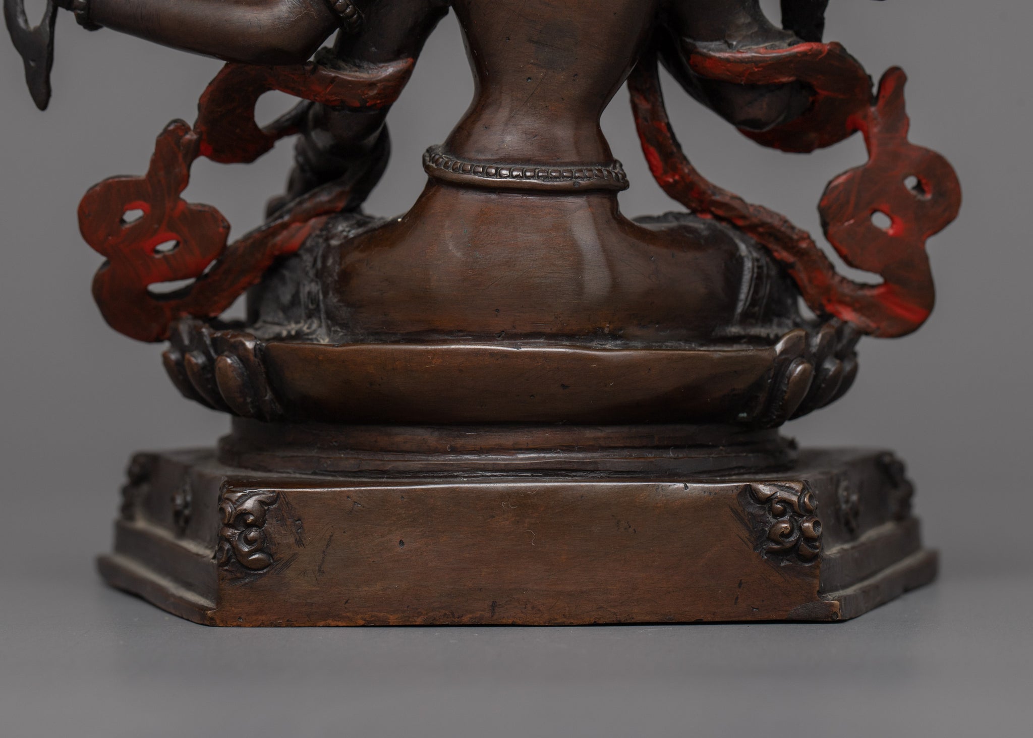 Vajrayogini is stunning. The details are amazing. It's easy to make out her facial expressions, skulls, feet, and the ring of fire around her. You can tell she's handmade. There is a consecration hole in her back.