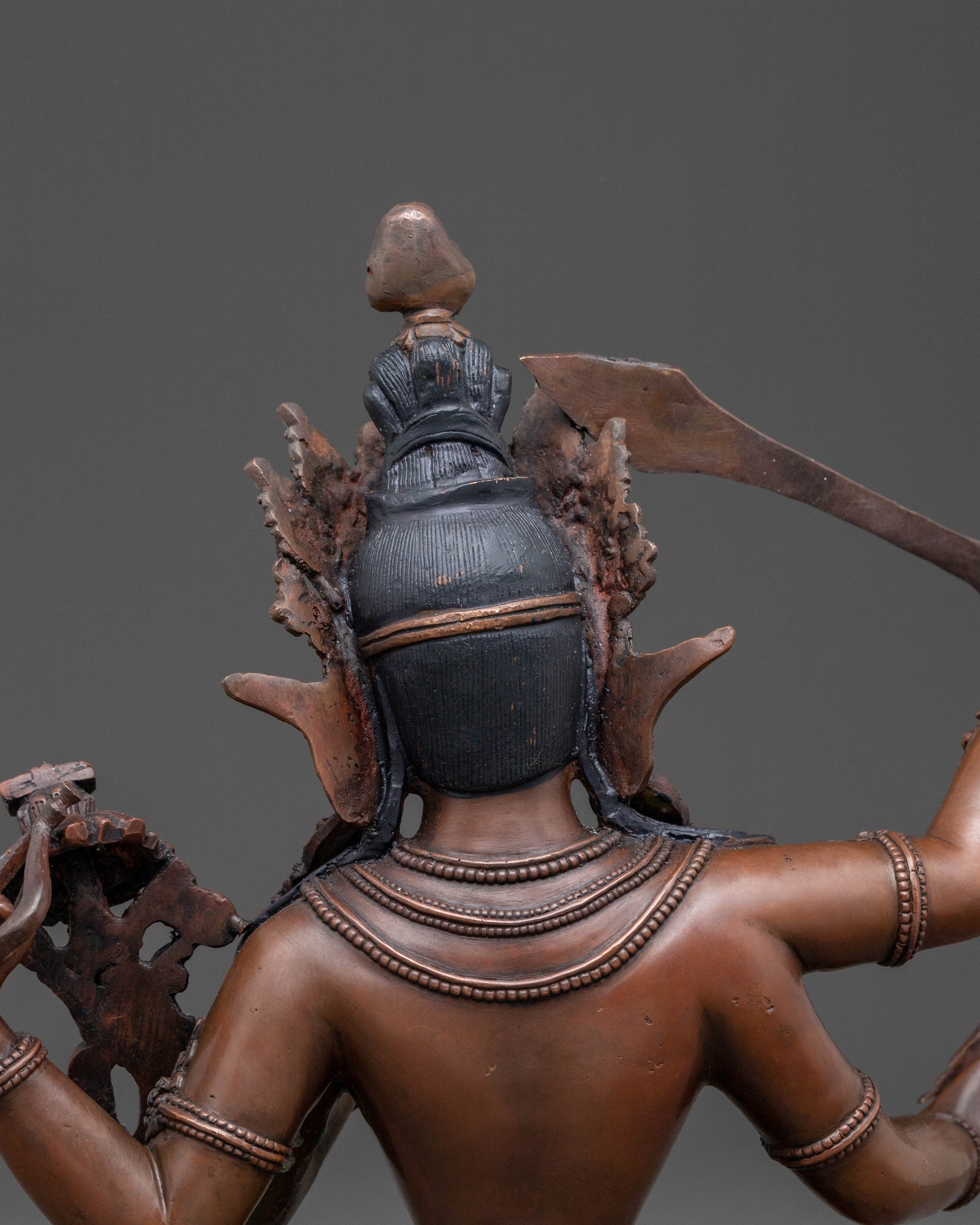 This Maha Manjushri sacred statue stands at 9.4 inches (24cm) tall with a base measuring 8.7 inches (22cm) and weighs 2.02 kg. Crafted from an oxidized copper body and enhanced with acrylic paintings and vibrant gemstones, this handcrafted piece reflects authentic Himalayan craftsmanship. Created in Nepal by skilled artisans, it is perfect for personal altars, meditation spaces, or as a meaningful spiritual gift.