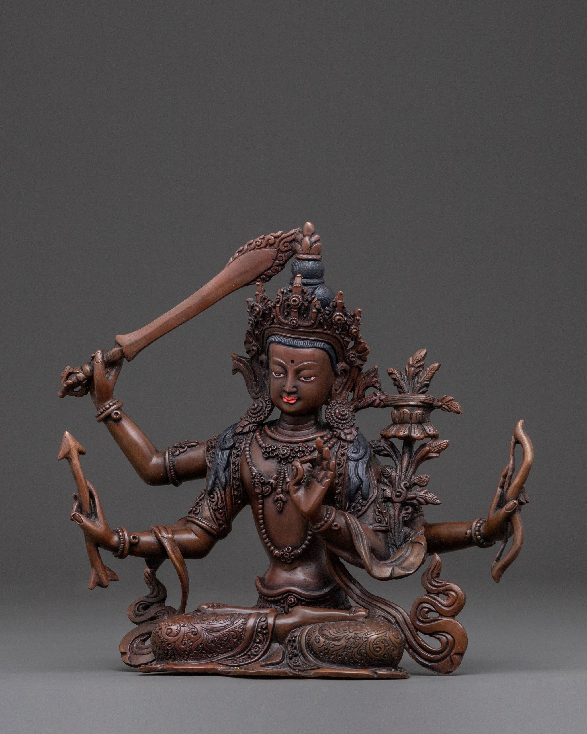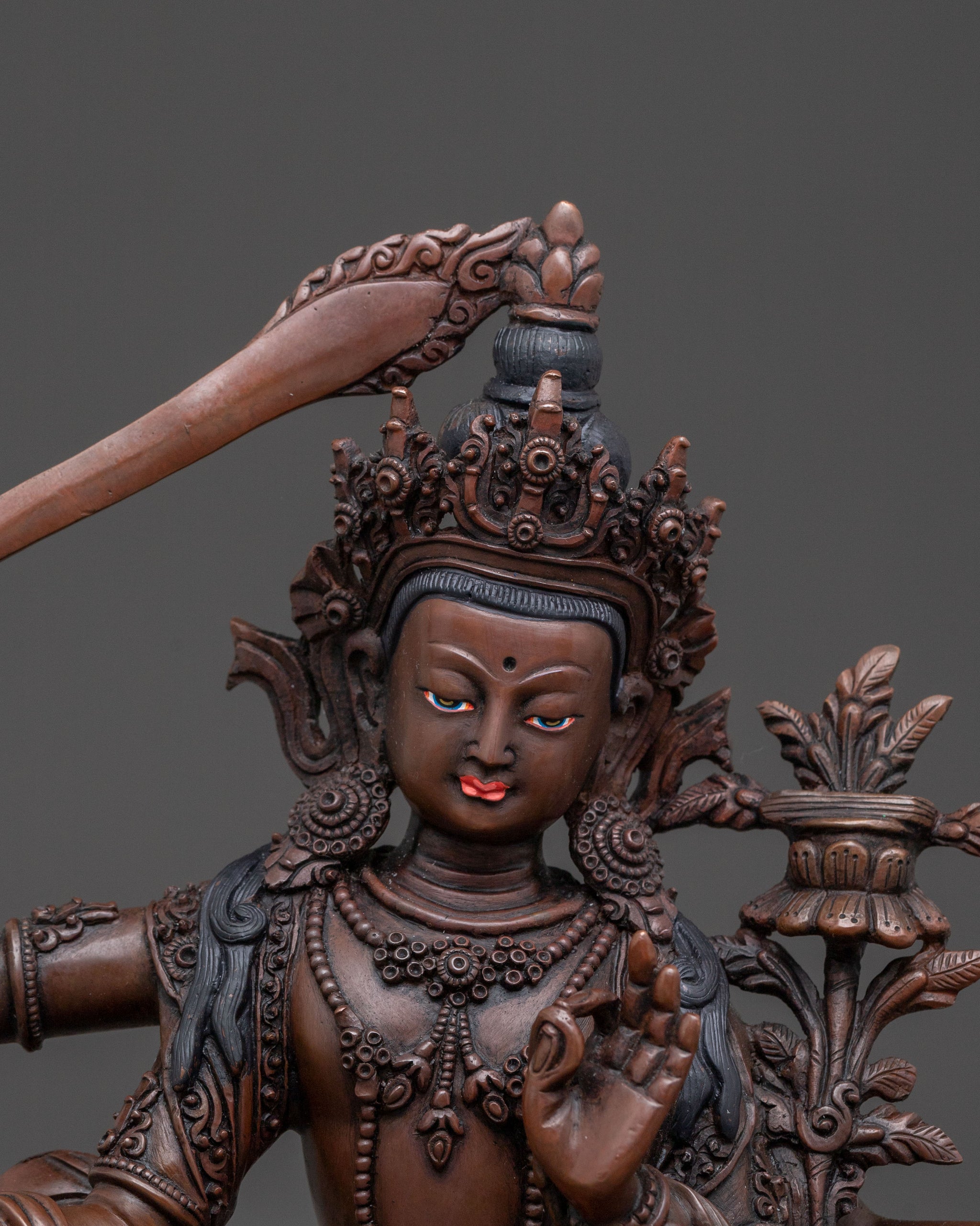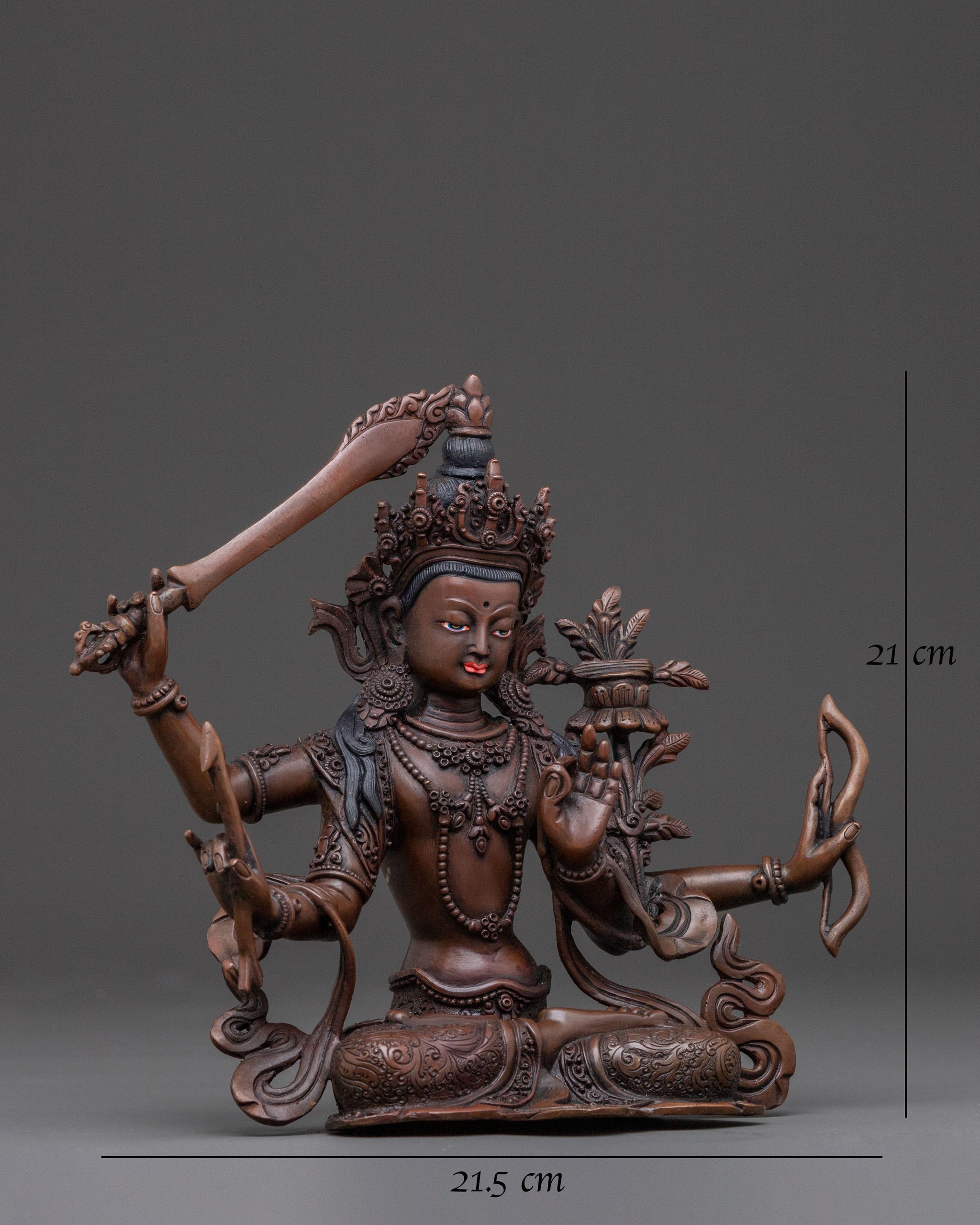 This Maha Manjushri sacred statue stands at 8.3 inches (21cm) tall with a base of 8.5 inches (21.5cm) and weighs 1.69 kg. Crafted from a robust oxidized copper body and enhanced with delicate acrylic paintings, this handcrafted piece reflects authentic Nepalese craftsmanship. Created by skilled artisans in Nepal, it is perfect for personal altars, meditation spaces, or as a thoughtful spiritual gift.