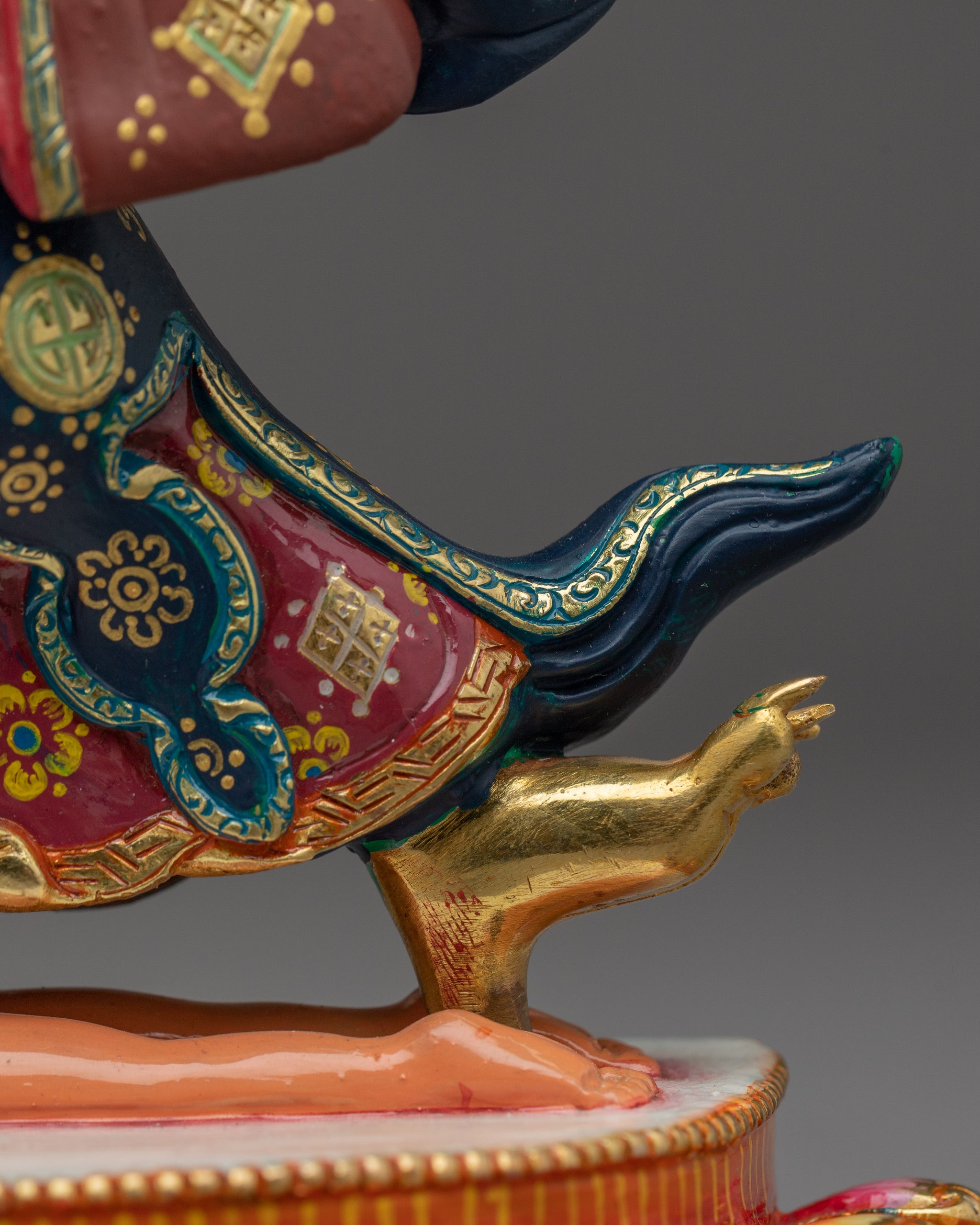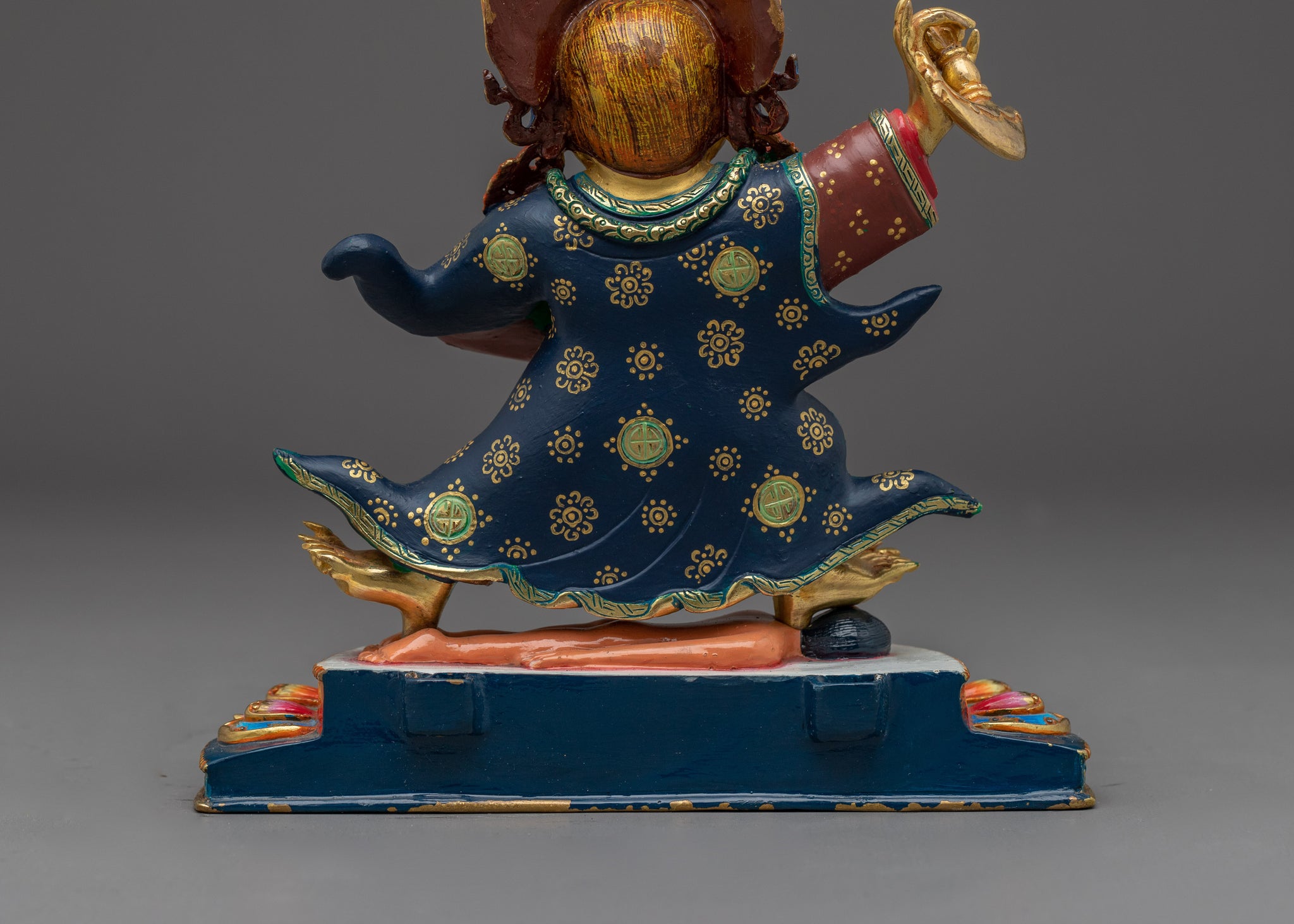 This little yet powerful statue weighs 1.83 kg and is excellent for personal altars, travel shrines, or intimate Vajrayana ritual settings. Mahakala's upraised chopper and skullcup represent the removal of ignorance and the absorbing of egoic delusion. Bernagchen, the chief defender of the Karma Kagyu lineage, protects practitioners on their spiritual journey with attractive might and awakened anger.