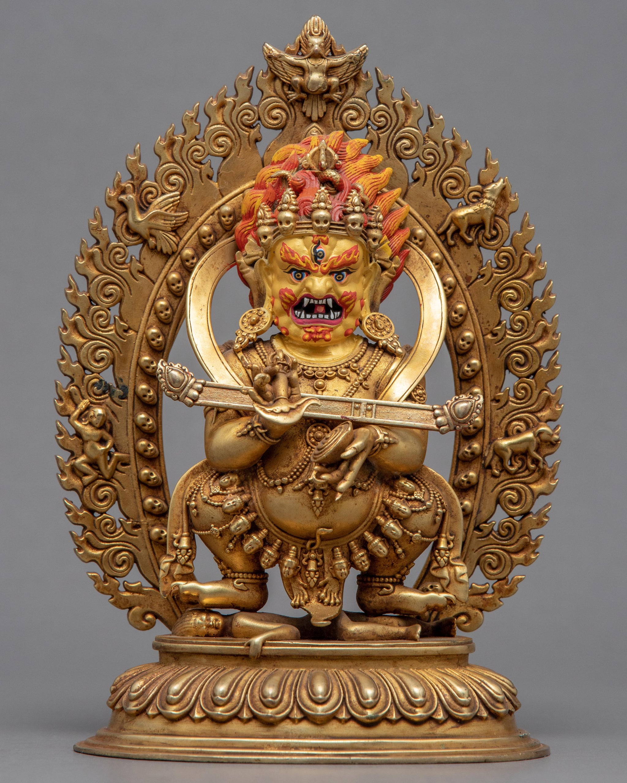We are the Kathmandu Valley artists who have expertly machine crafted the Sakya Mahakala Buddha Statue in the traditional Himalayan Art style. He is also wearing a five-headed skull crown. He has a wrathful expression standing atop a sun disc lotus seat over a human body. In his right hand, Sakya Mahakala holds a vajra, and in his left, a skull cup. The jewelry has been brilliantly ornamented and studded with precious corals and jewels. The figurine was crafted from copper and covered in pure 24K gold. This work of art may be used for a variety of Buddhist rites as well as daily exercises like meditation. We guarantee that the statue's materials are of the highest quality and will last many years.