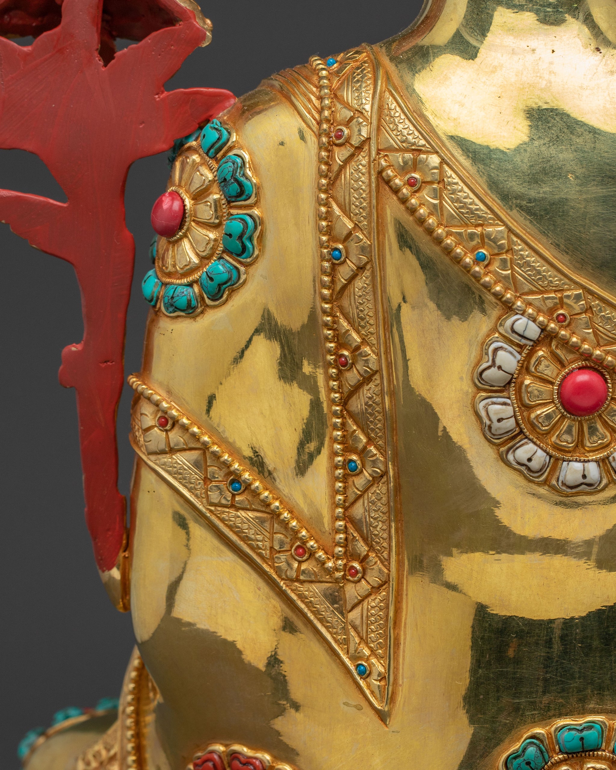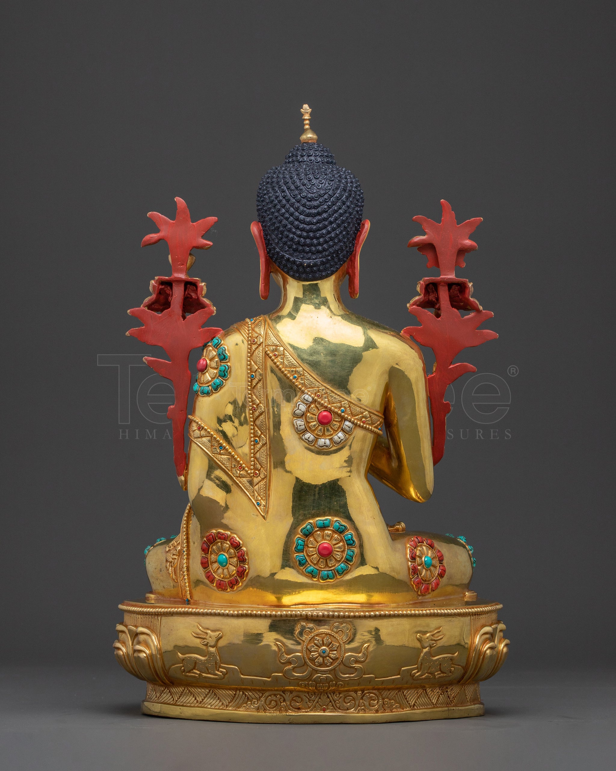This Maitreya Buddha statue, standing 18.3” (46.5cm) tall with a base of 11.8” (30cm) and weighing 9.81 kg, depicts the future Buddha seated calmly on a lotus base. Crafted from a copper body, it is adorned with 24K gold gilding, acrylic paintings, and hand-carved gemstones. The statue’s surface features deeply engraved carvings that create a stunning 3D-like effect, adding depth and beauty to its serene and peaceful presence. This exquisite piece embodies spiritual wisdom and hope, making it a profound addition to any sacred space.
