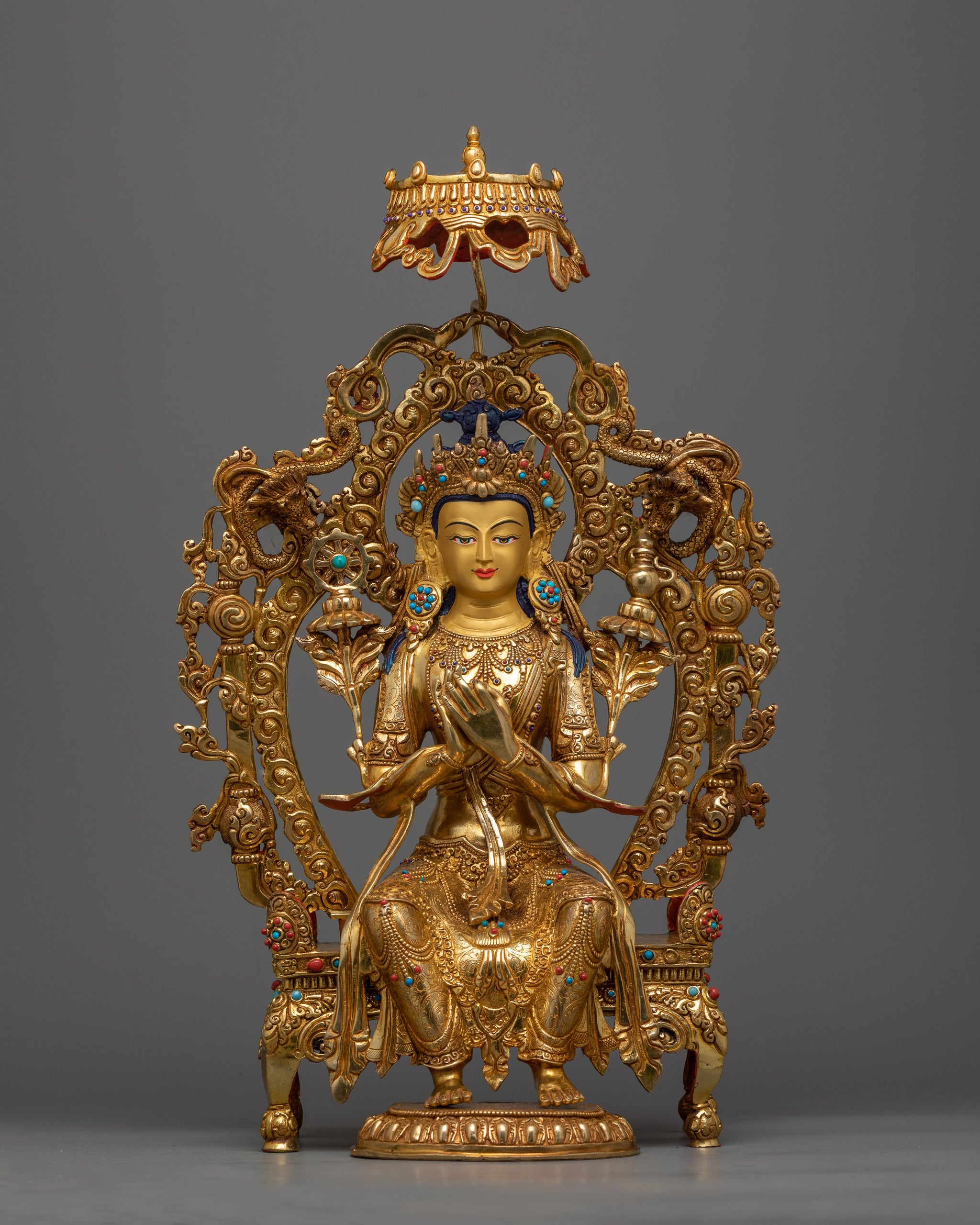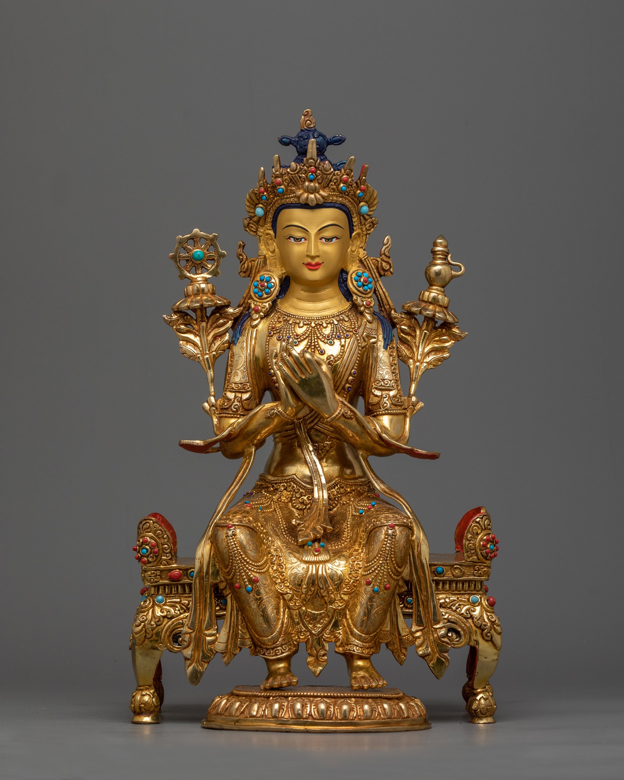 Maitreya, the Future Buddha, is seated on a grand throne with his hands clasped in the Dharmachakra Mudra, close to his heart. A lotus blossoms at each shoulder; the lotus on the right has a vase, signifying spiritual riches, and the lotus on the left has a dharma wheel, symbolizing Buddha's timeless teachings. This artwork shows Maitreya's significance in sustaining enlightenment in the future.