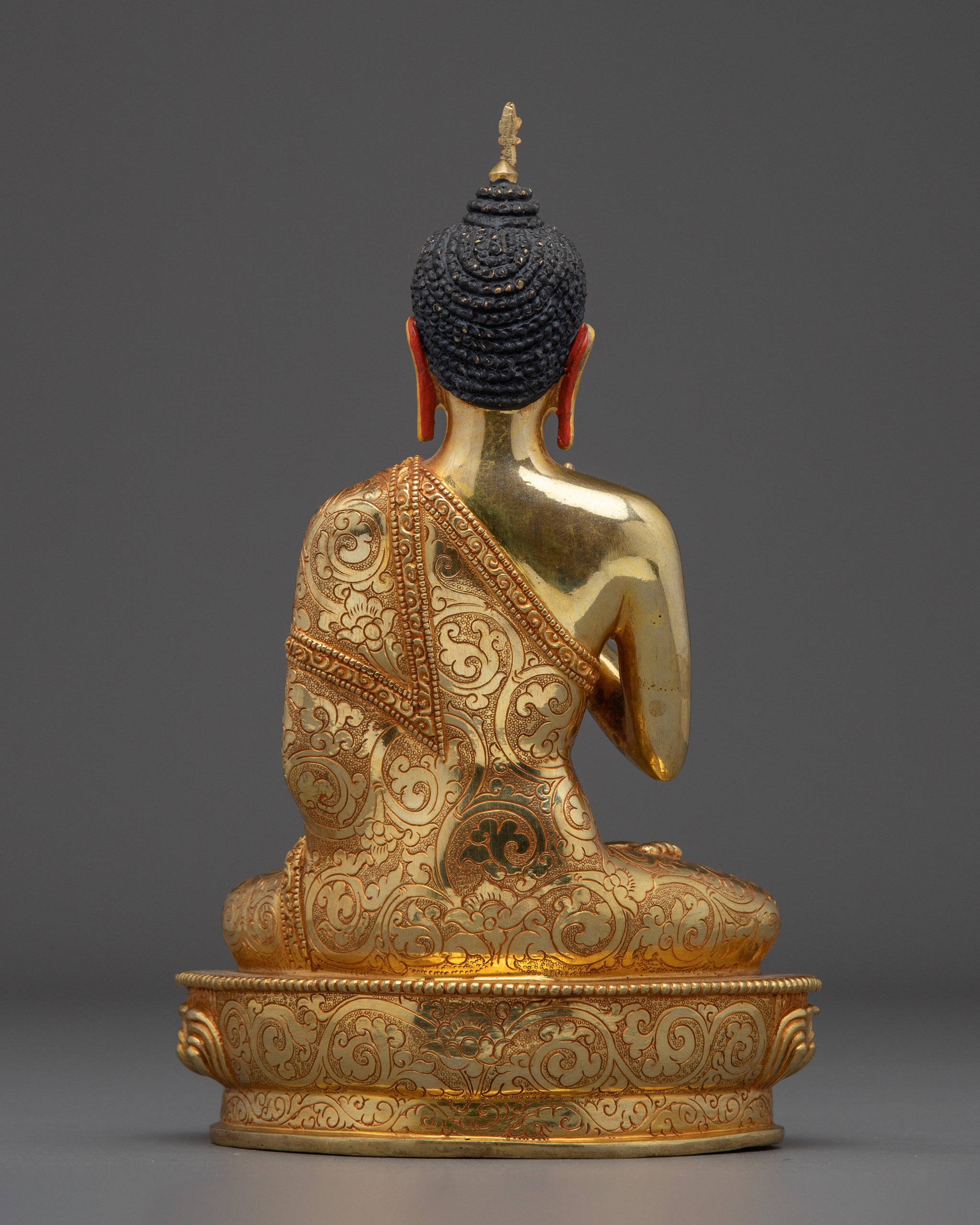 Iconographically, Maitreya Buddha is depicted seated in the padmasana posture on a lotus base, embodying purity and spiritual awakening. He performs the dharma chakra mudra, symbolizing the turning of the wheel of Dharma, or the teaching of Buddhist law. A small stupa crowns his head, representing his connection to the enlightened mind and the continuity of the Buddha’s teachings. Size: 9.4”/24cm (Height) × 6.1”/15.5cm (Width) Weight: 1.62kg Material: 24K Gold Gilded, Gold & Acrylic Paintings, Copper Body