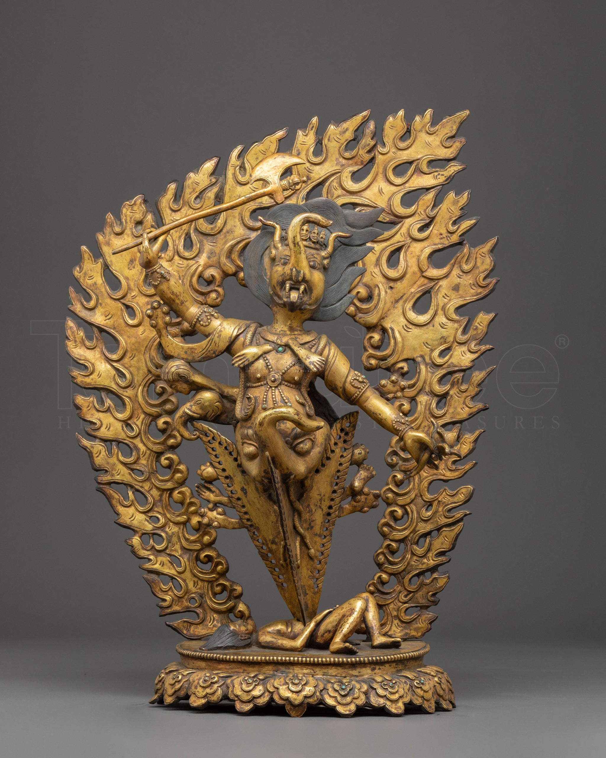 The statue is depicted with a fierce Makara head, symbolizing strength, protection, and the ability to overcome obstacles. His fierce expression and dynamic posture convey his power and determination to protect the Dharma and guide practitioners. The figure is surrounded by flames, representing purification and transformation. He wears a crown of skulls, signifying victory over ego and attachments. He is seen holding various weapons such as swords, axes, and a staff. These weapons represent the cutting through of ignorance and obstacles. His body is adorned with jewelry, emphasizing his divine and powerful nature. This statue serves as a powerful reminder of protection, strength, and the overcoming of challenges on the spiritual path.