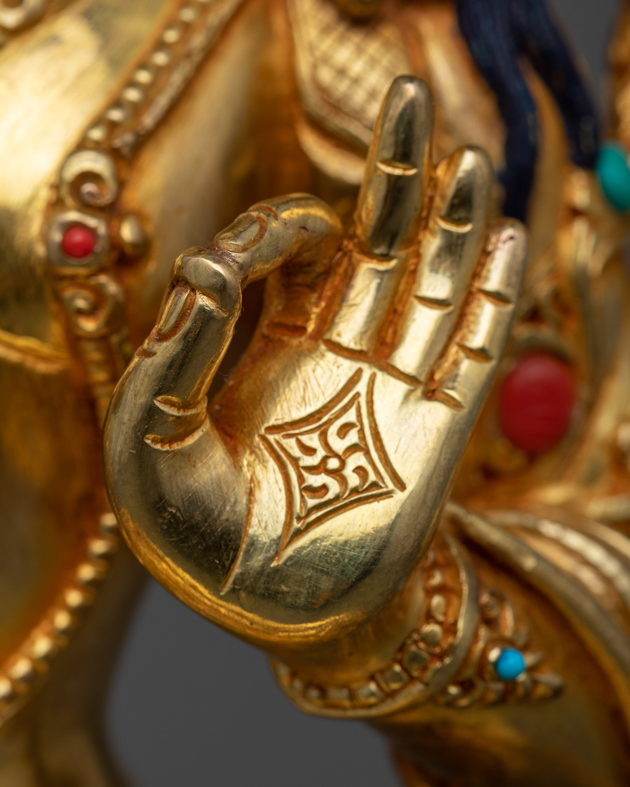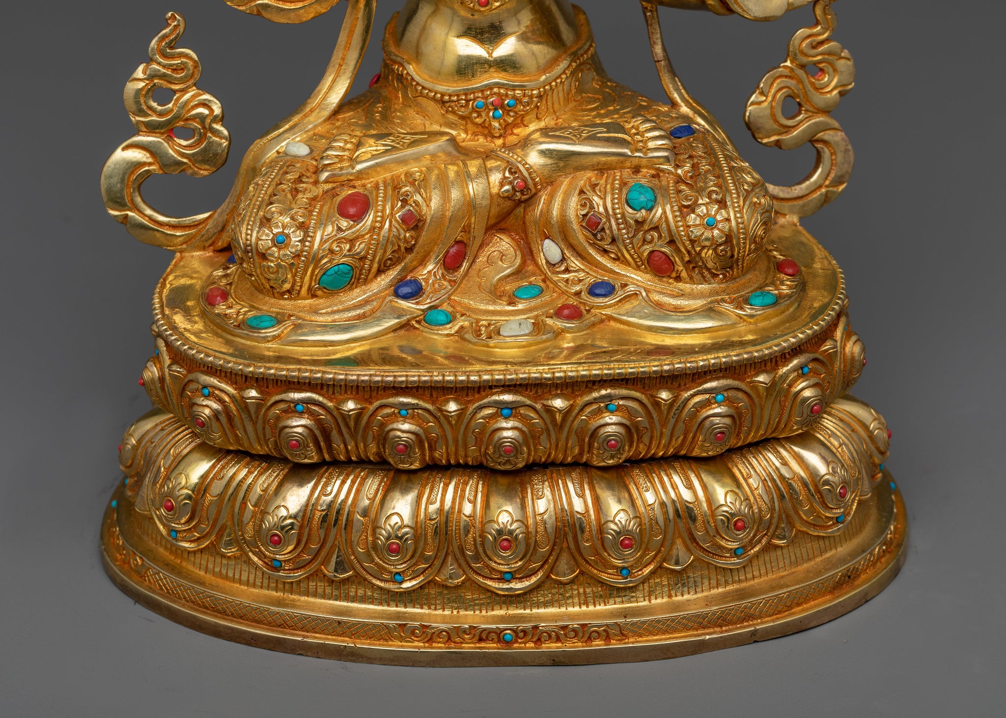 Unveiling our Manjushree God statue, a Buddhist emblem of infinite knowledge and comprehension. This magnificent statue was lovingly crafted in Nepal from solid copper and is embellished with 24k gold gilding, detailed acrylic paintings, and hand-carved gemstones that add to its brilliance.