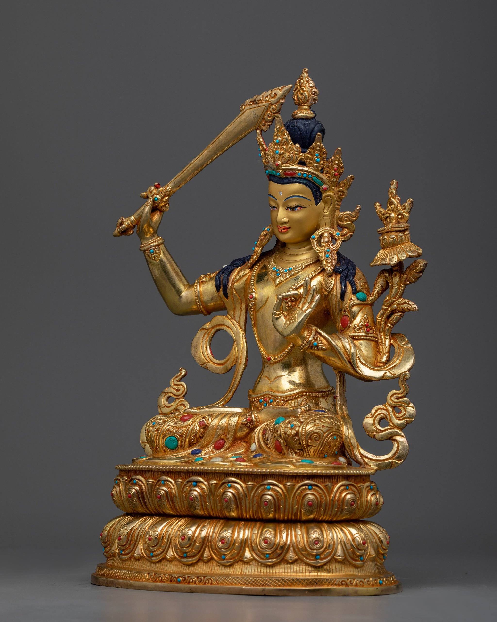Manjushree, also known as the god of heavenly wisdom in Buddhism, embodies the Buddhas' wisdom. He represents the enlightenment that triumphs over ignorance, holding a sword in one hand to cut through illusion and a text in the other to represent genuine understanding. Having this statue reminds you of Manjushree's teachings and helps you summon his blessings for wisdom and insight.