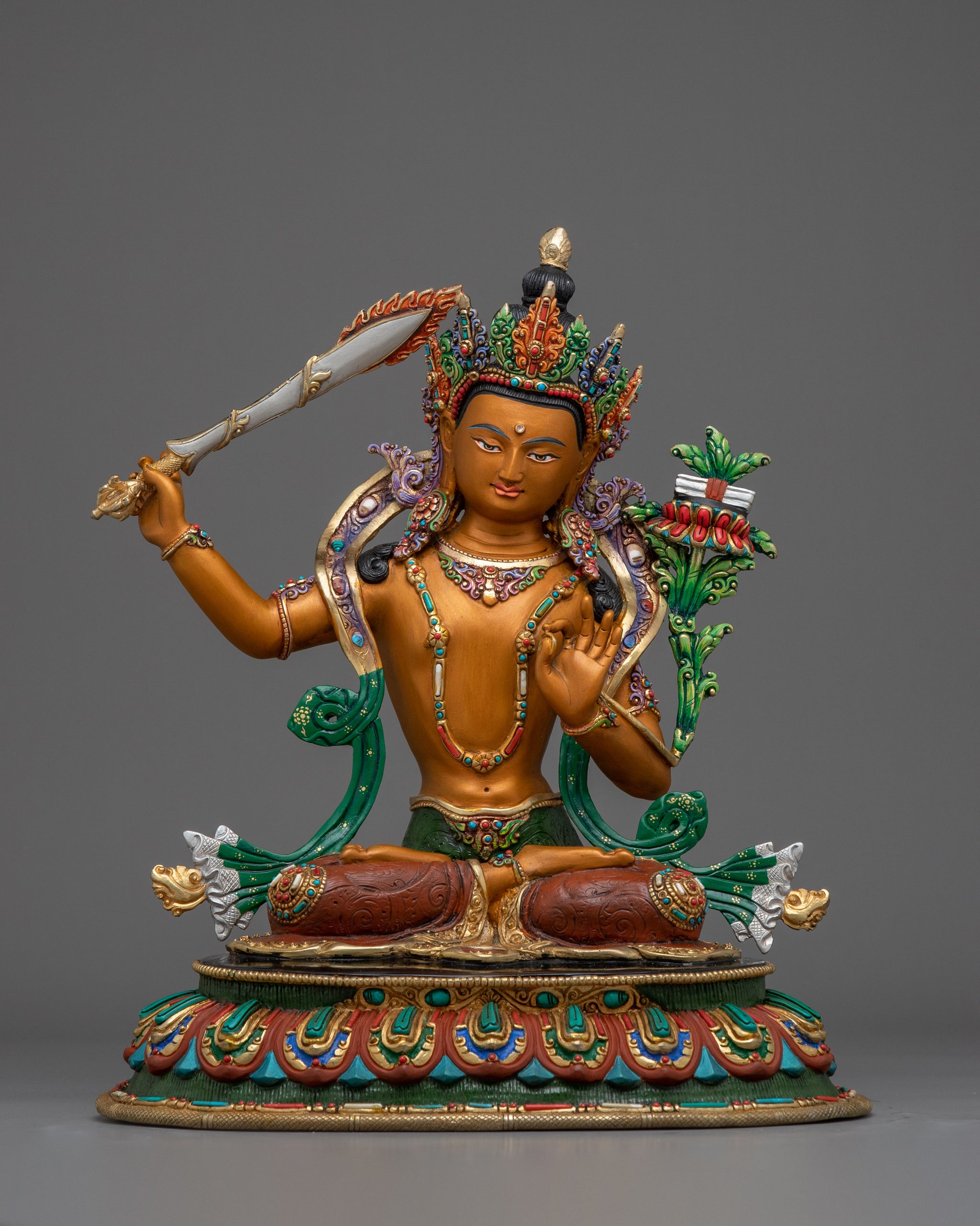The Copper Manjushri statue measures 14.2 inches (36 cm) in height and 11.4 inches (29 cm) at the base. The Bodhisattva of Wisdom is crafted from copper, covered with a triple layer of 24K gold gilding, and carved with deeply engraved carvings that produce a magnificent 3D-like effect. This sculpture, adorned with gemstones and handcrafted by expert Nepalese artisans, elegantly symbolizes Himalayan Buddhism's sacred traditions, making it an appropriate addition to altars, meditation places, or sacred collections.