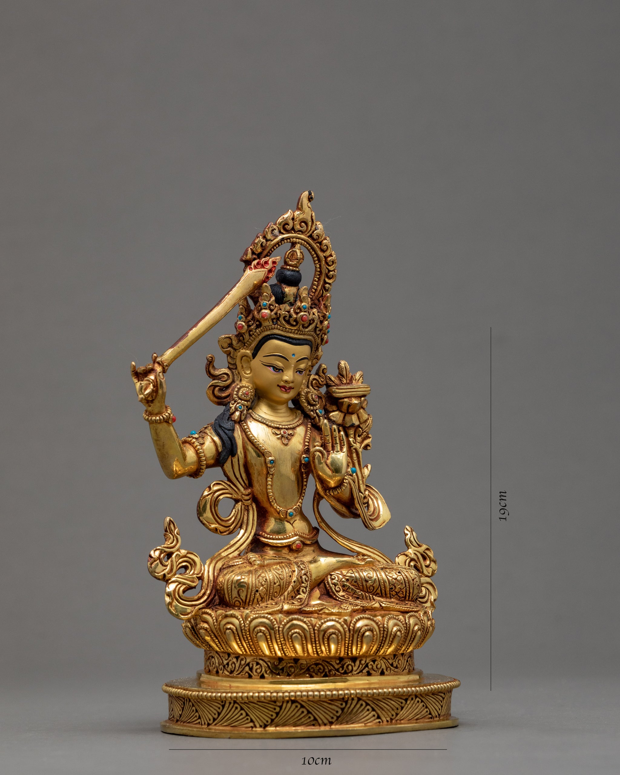 In this Himalayan statue, Bodhisattva Manjushri is shown wonderfully. This Infinite wisdom Buddhism sculpture was hand-carved in copper and gilded 24K gold by a Nepali artisan in Kathmandu. He is the embodiment of all Buddhas' knowledge. His right hand is seen wielding the sword of empty expertise, which he intends to employ to remove ignorance, which is the root of all suffering. He holds a lotus flower in his left palm, on which he rests the book of transcendental wisdom. He is dressed out in gorgeous and rare jewels and wears a wreath.