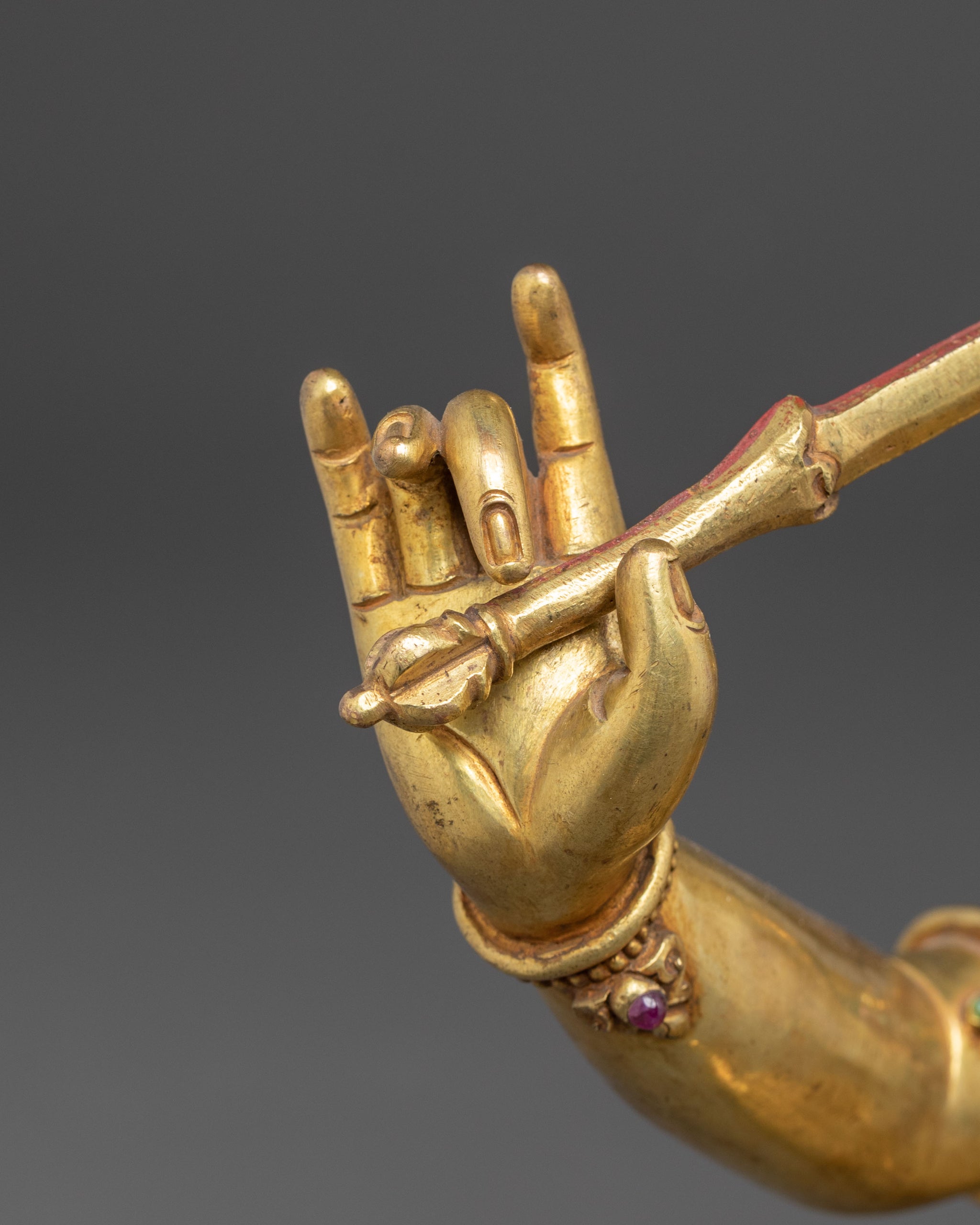 This stunning 12.2-inch Manjushri Bodhisattva Radiant Statue exudes knowledge, clarity, and enlightenment. This statue is made of copper, covered with a triple layer of 24K gold gilding, and carved with deeply engraved carvings that produce a magnificent 3D-like effect. This sculpture is handcrafted by expert Nepalese artisans, elegantly symbolizes Himalayan Buddhism's sacred traditions, making it an appropriate addition to altars, meditation places, or sacred collections.
