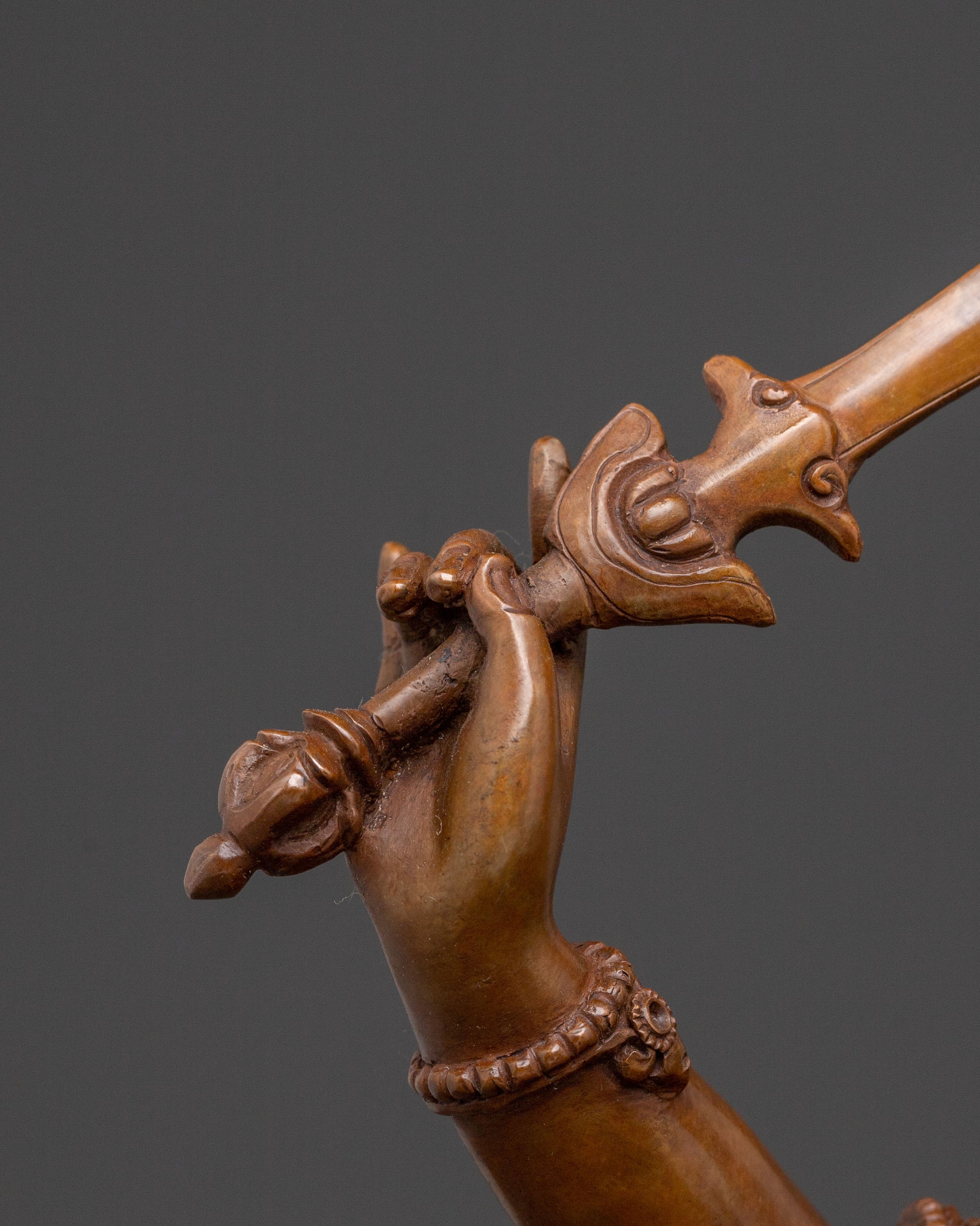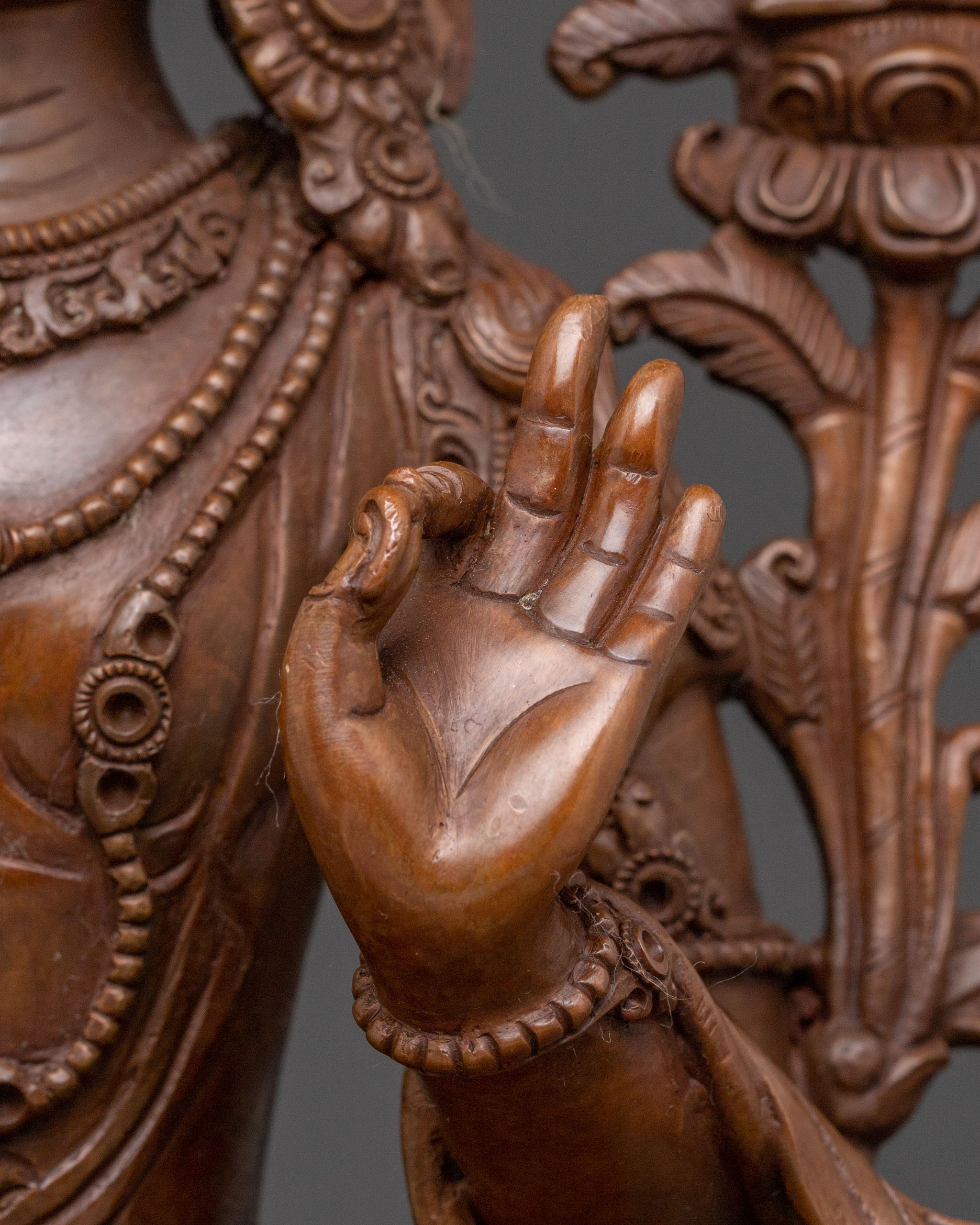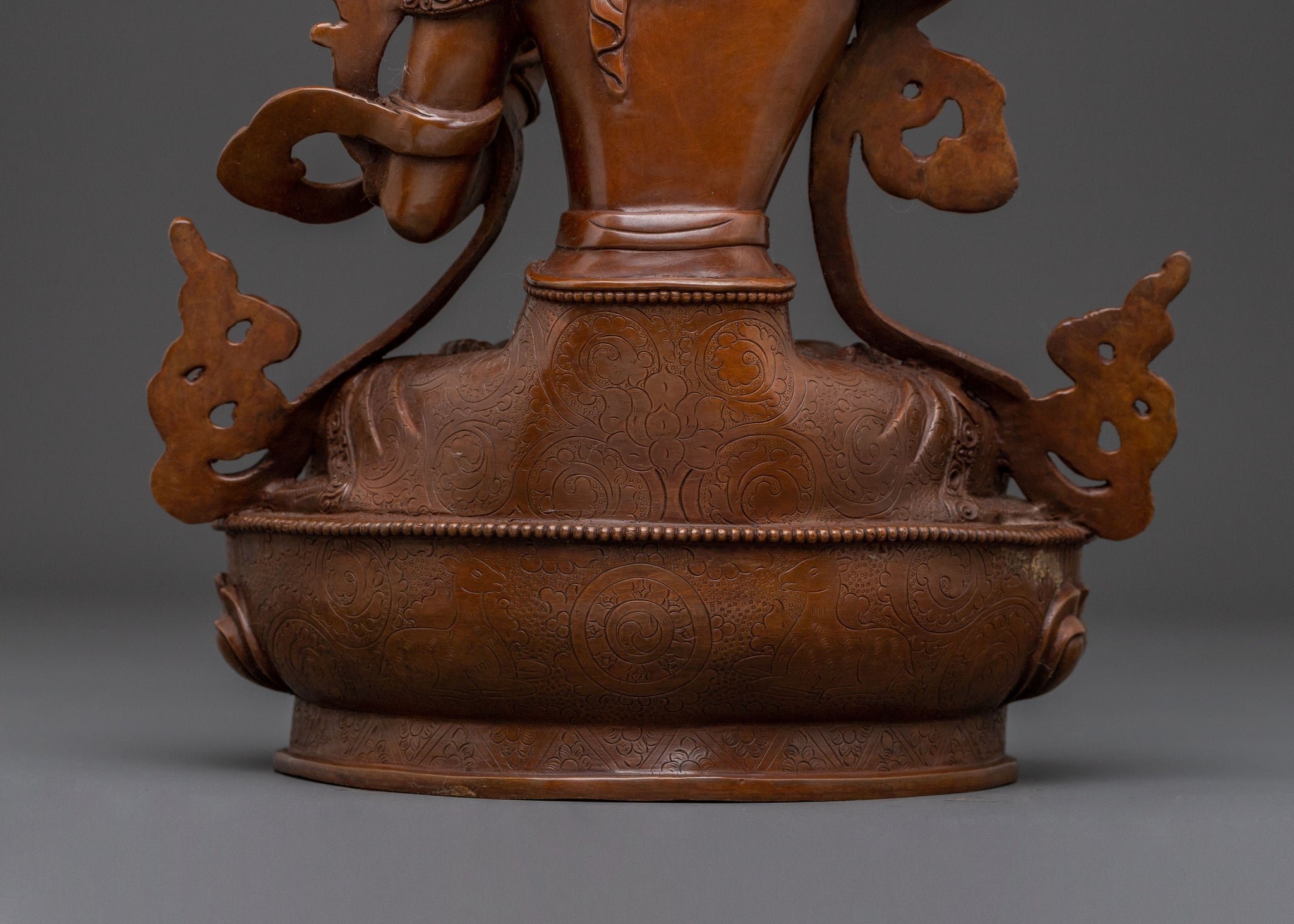 A profound symbol of enlightened thought, this Manjushri Bodhisattva statue embodies transcendent wisdom. Handcrafted in Nepal from oxidized copper, it stands 12.6 inches tall and offers a serene focal point for spiritual practice. Each detail of this statue is lovingly crafted by skilled artisans of Nepal, radiating a profound spiritual presence that invites quiet contemplation and deep reflection.
