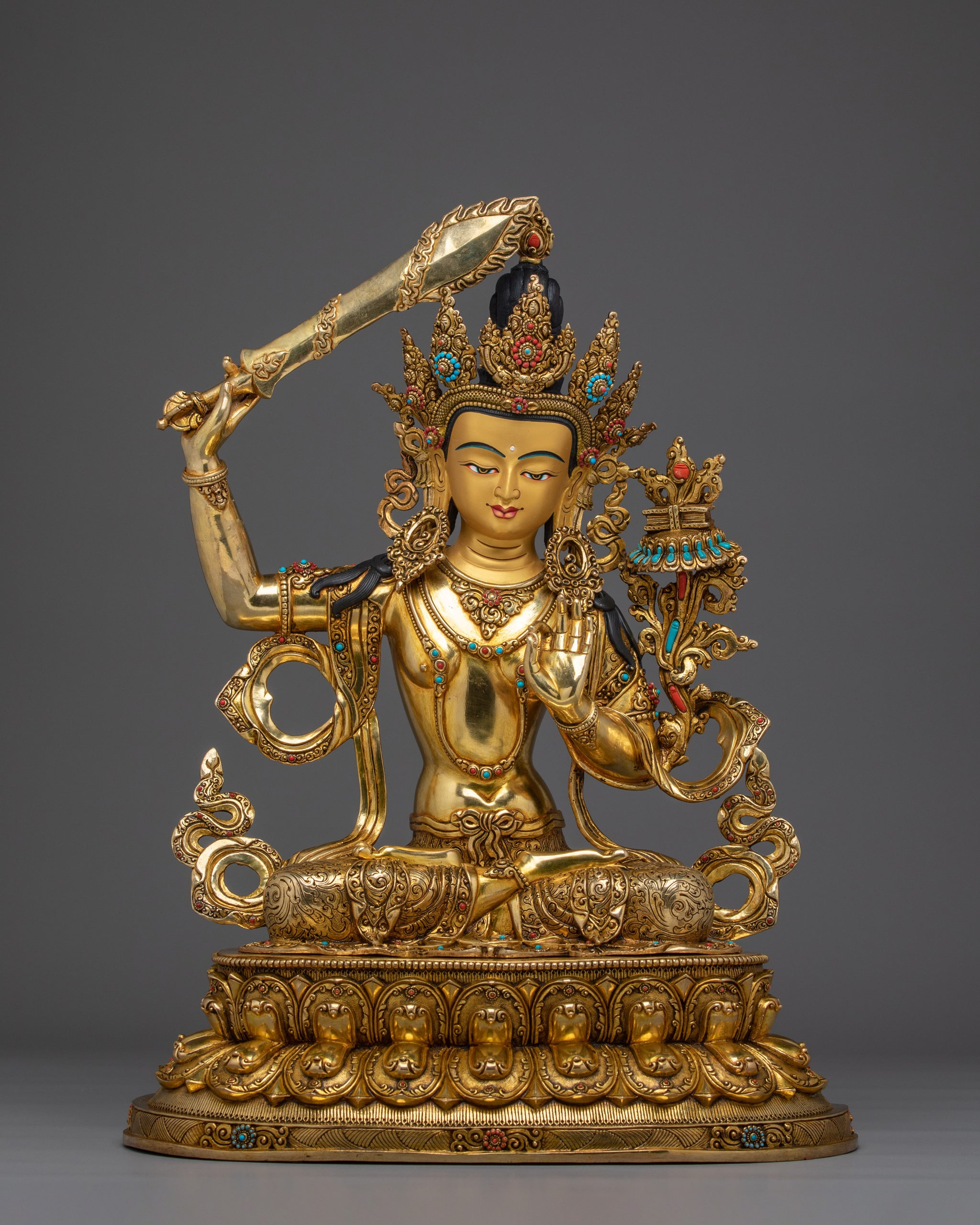 This stunning Manjushri Copper Statue for Spiritual Altar, which is 49 centimeters in height and was handcrafted in Nepal, is a collector's treasure that will elevate your special space. The spiritual brilliance and outstanding artisanal expertise that this statue exudes are a direct result of its construction is made of copper, covered with a triple layer of 24K gold gilding, and carved with deeply engraved carvings that produce a magnificent 3D-like effect.