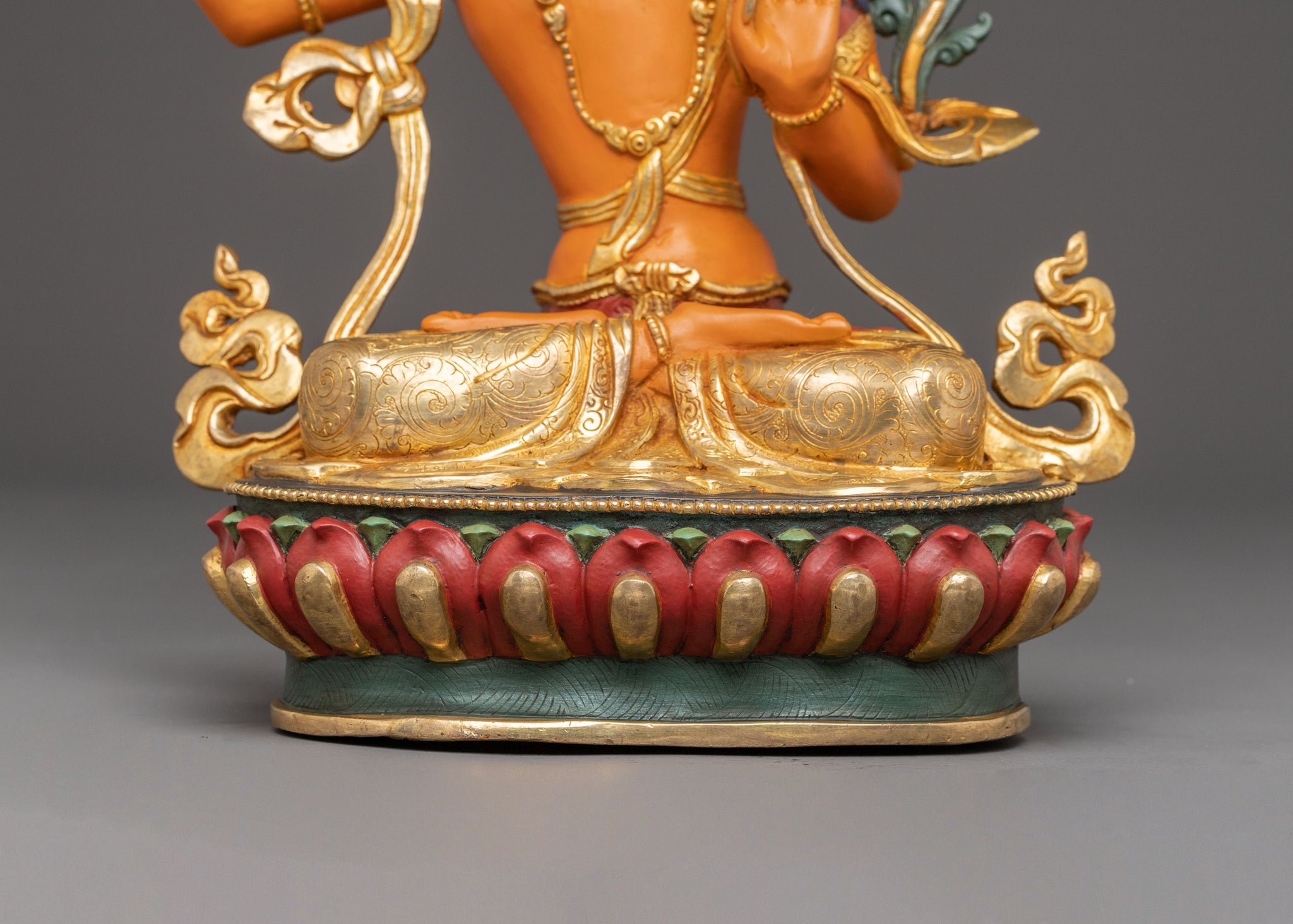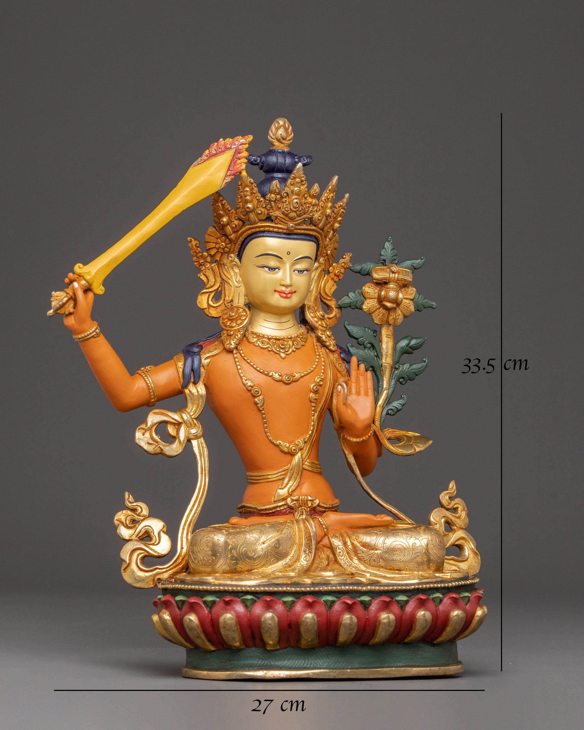 This Handmade Manjushri Golden Statue of Power and Wisdom, also known as the Bodhisattva of Wisdom, measures 13.2”/33.5cm in height and 10.6”/27cm at the base, weighing 3.39 kg. Made from a copper body with 24K gold gilding, gold, and acrylic paintings, it reflects both elegance and devotion. Expertly crafted by skilled Nepali artisans, it makes a refined addition to altars, meditation spaces, or spiritual collections.