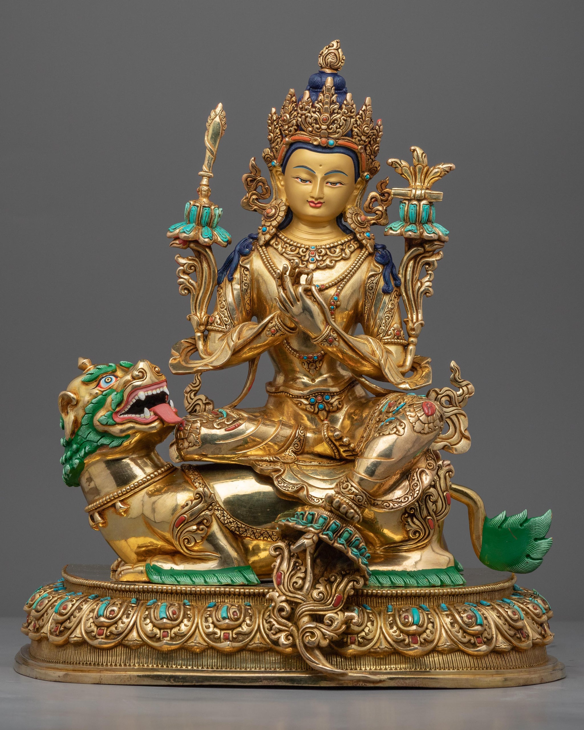 This Manjushri on lion statue has been expertly hand-carved in the traditional Himalayan manner. The statue was made with a copper body and then gilded with 24-karat real gold, highlighting the exquisite design patterns. The Bodhisattva peacefully sits on a Lion, a symbol of strength, fearlessness, and royalty. He can be seen performing the 'Dharmachakra Mudra' symbolizing the transmission of Buddha's teachings.