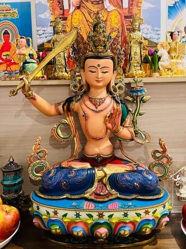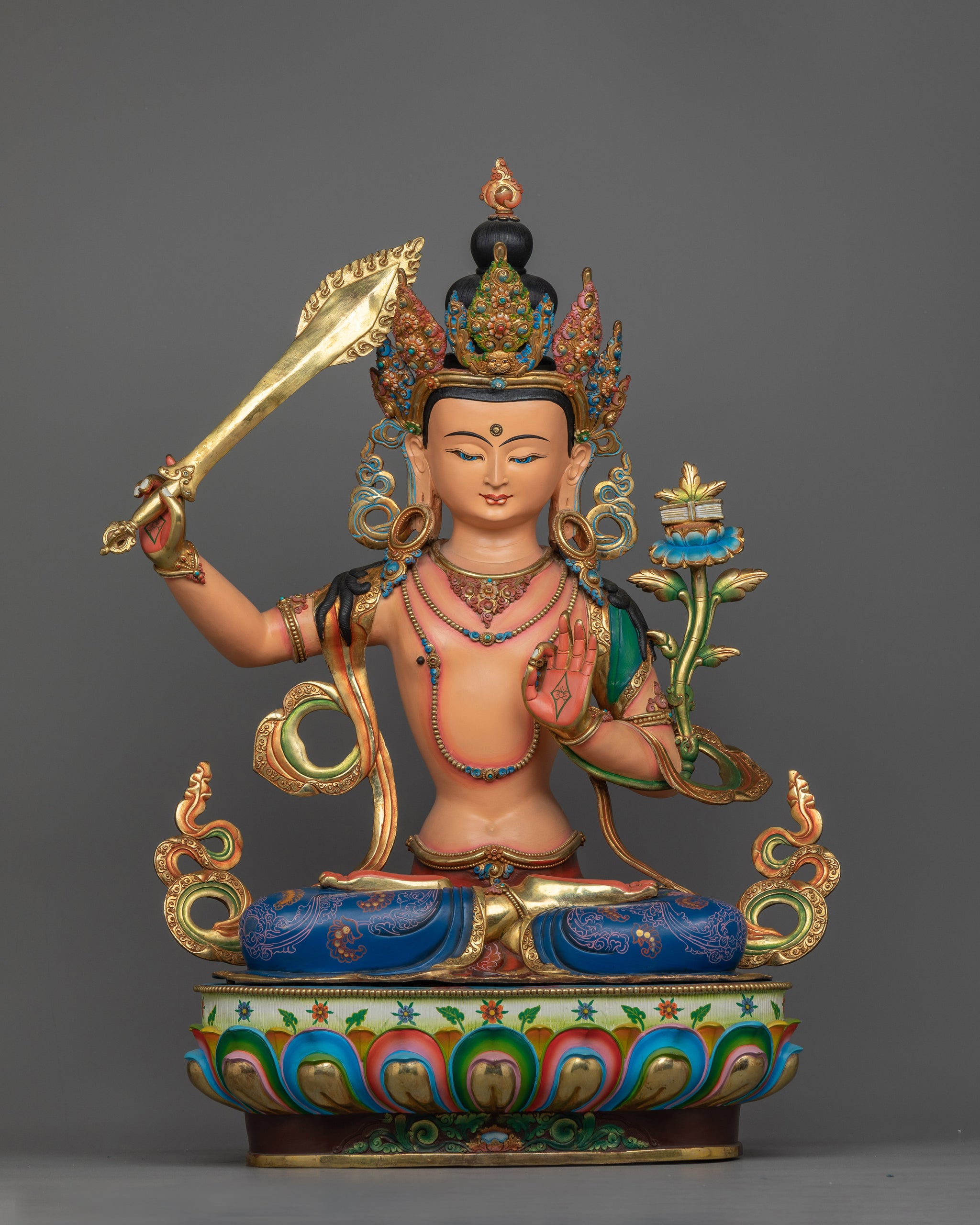 Imagine Manjushri's enlightened presence in your home, providing wisdom, protection, and spiritual comfort. This statue represents the deity's loving demeanor and his function as the embodiment of wisdom in Buddhism, acting as a beacon of knowledge and enlightenment.