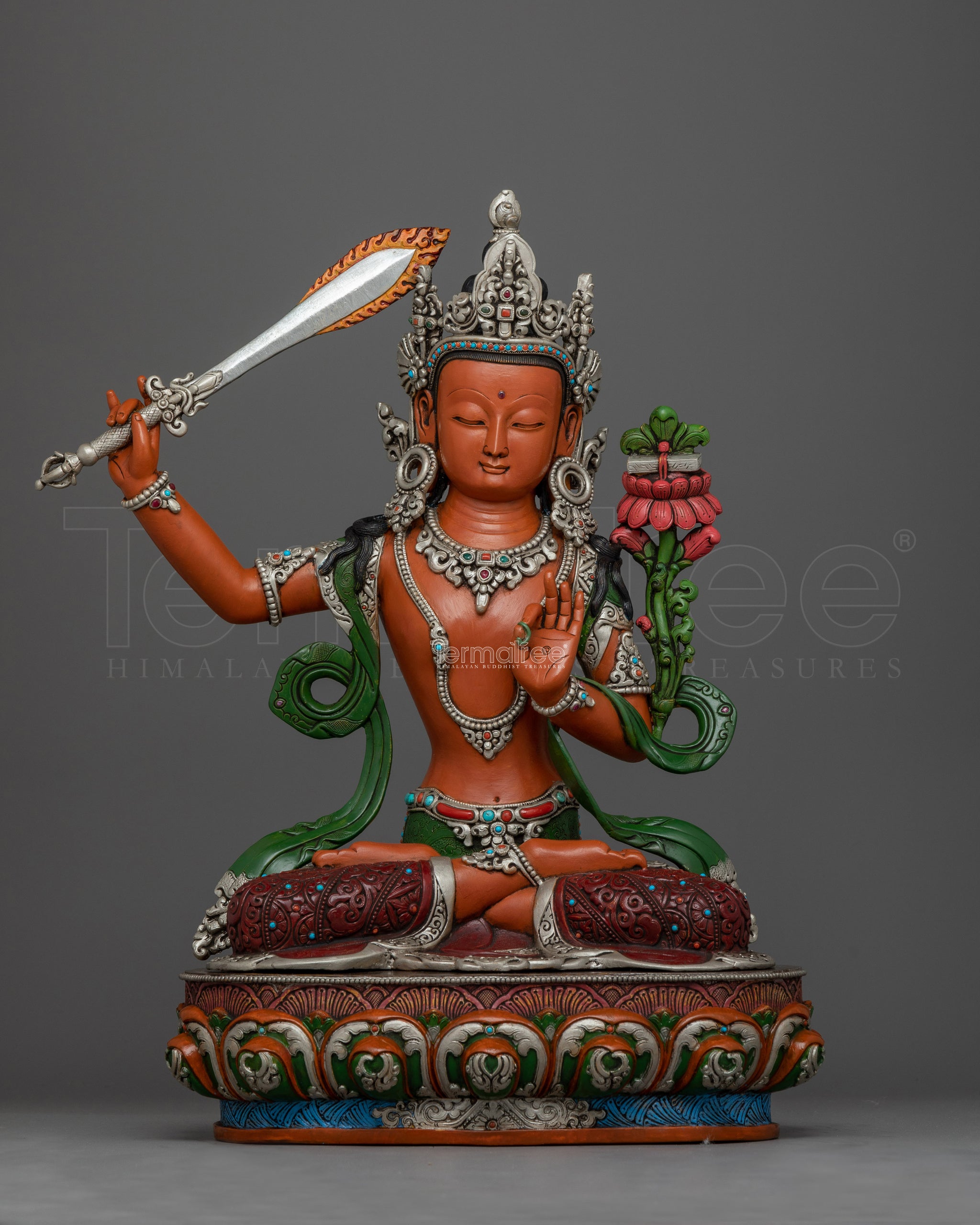 Hand-Carved Manjushri Prayer Tibetan Statue | Silver-Plated and Hand-Painted Sculpture