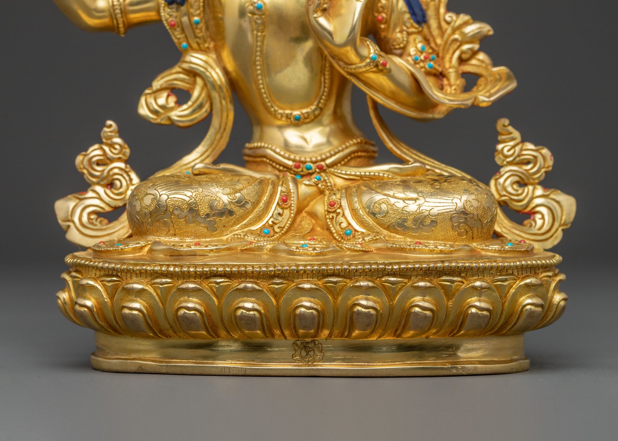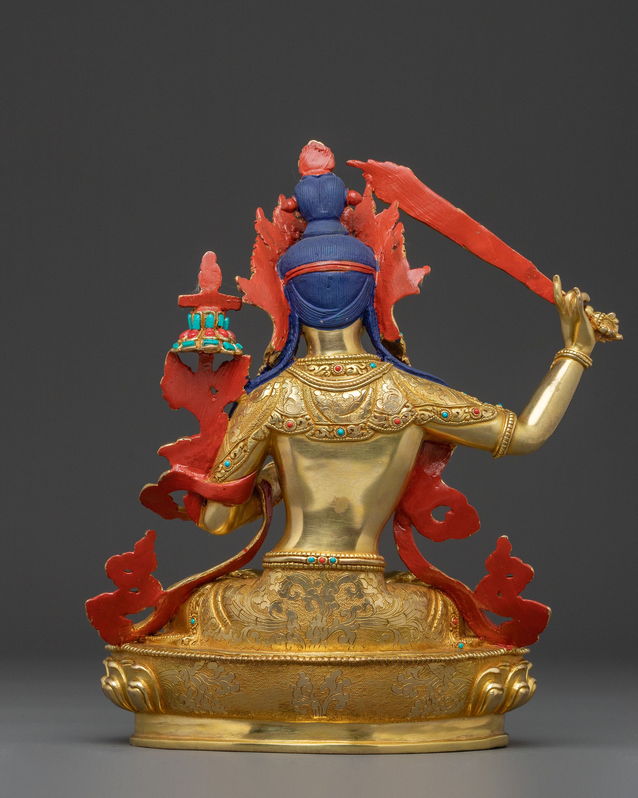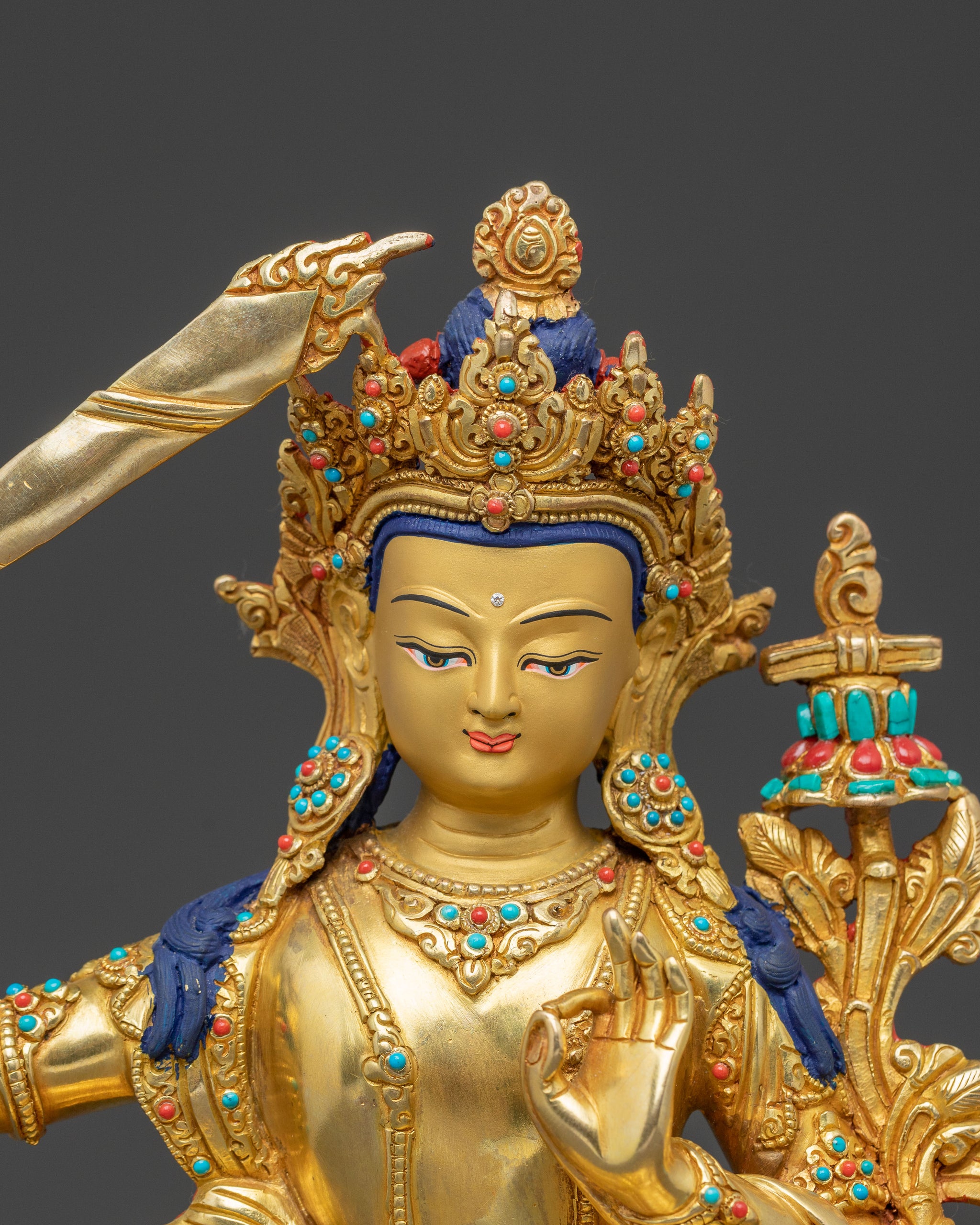 This Manjushri spiritual statue, standing 10.2 inches (26 cm) tall with an 8.7-inch (22 cm) base, gracefully embodies deep insight and wisdom. Made from copper and carefully gilded in radiant 24K gold, it emits a calming, luminous glow. Adorned with intricate acrylic paintings, vibrant gemstones, and detailed hand-carvings, this beautiful piece weighs 2.48 kg. A remarkable example of devotional art, it enhances any sacred space with its peaceful presence and enlightened focus, serving as a profound symbol of wisdom and spiritual clarity.