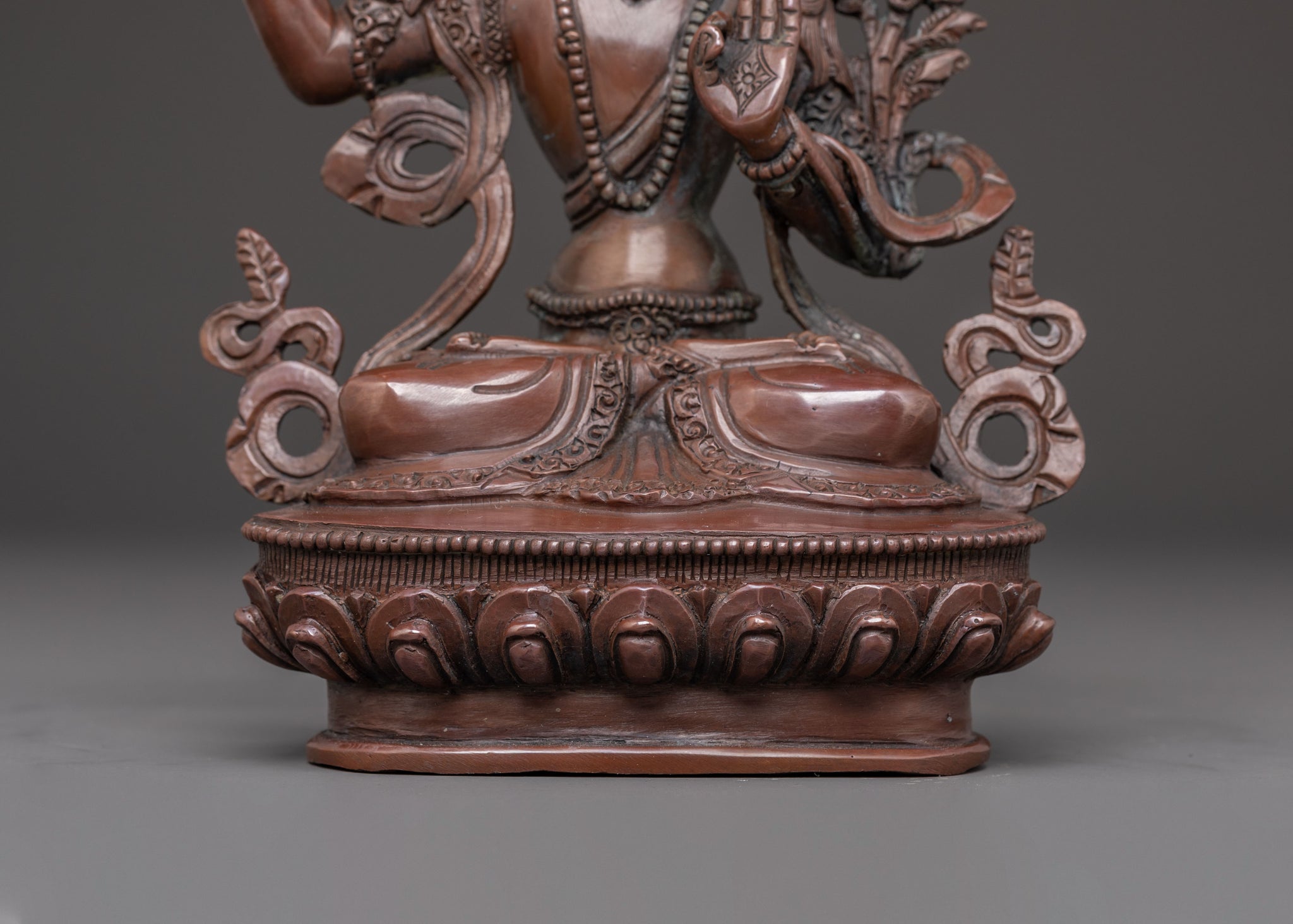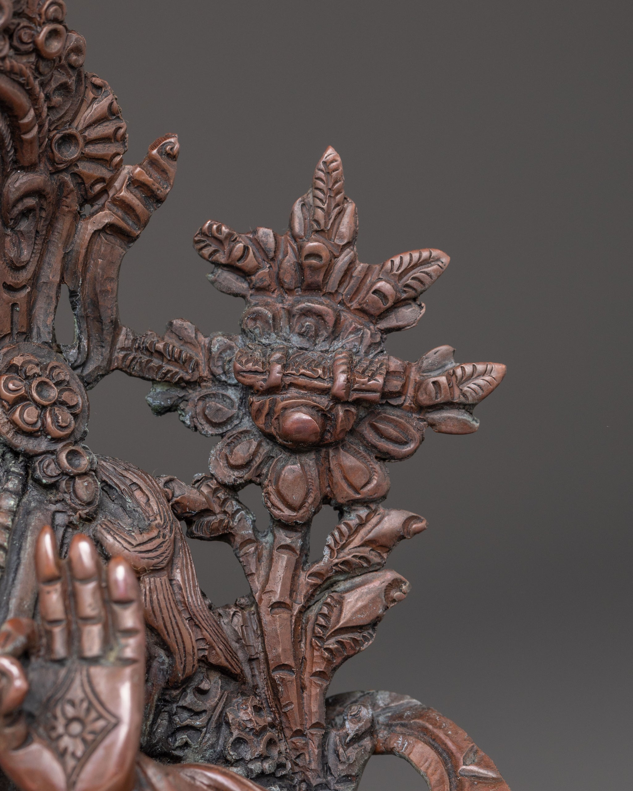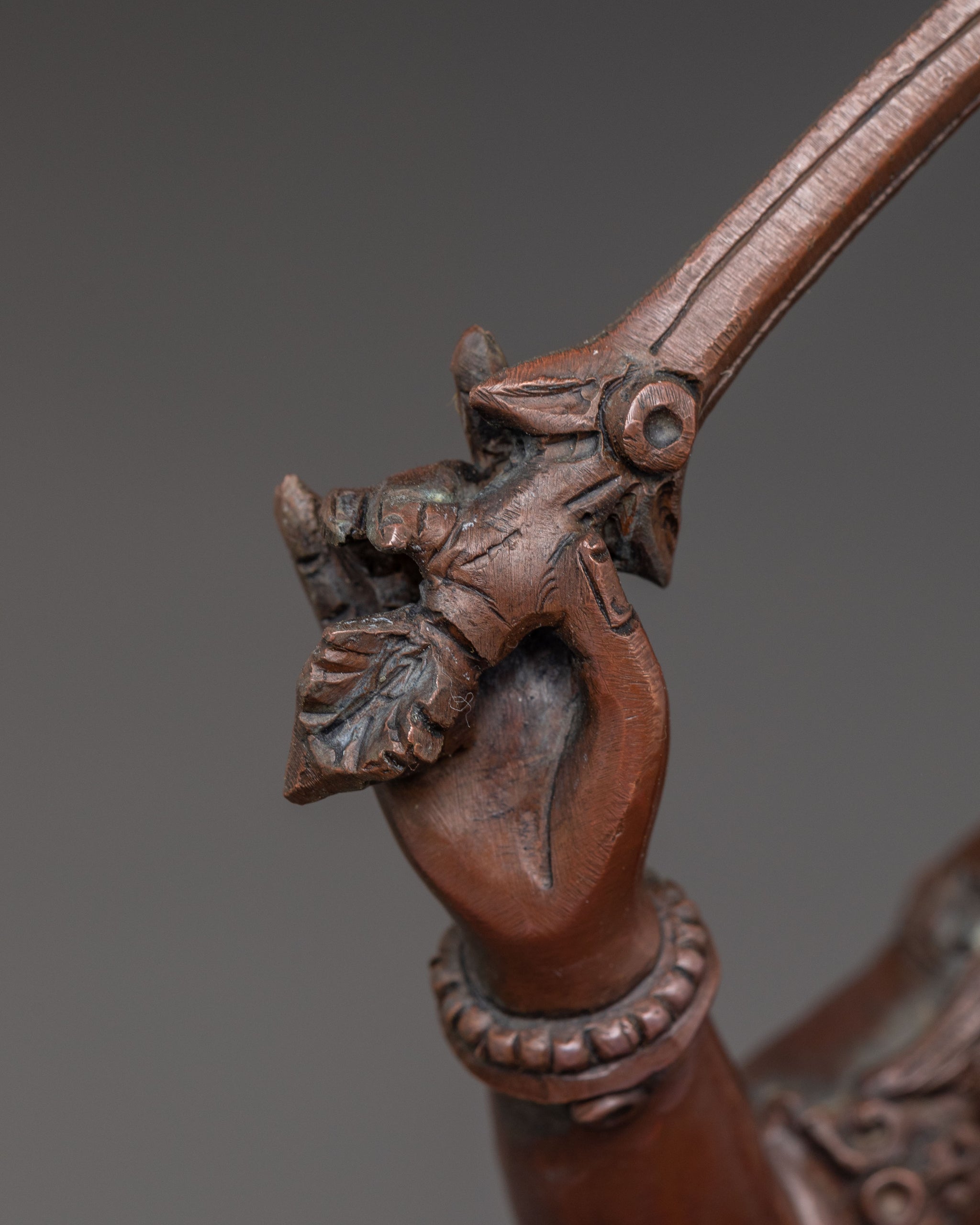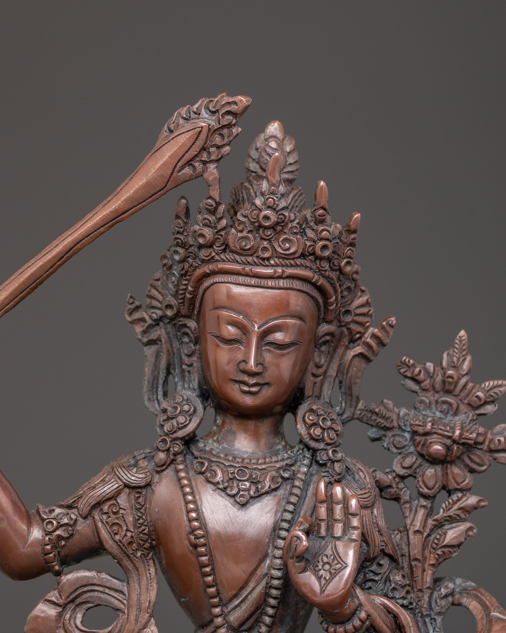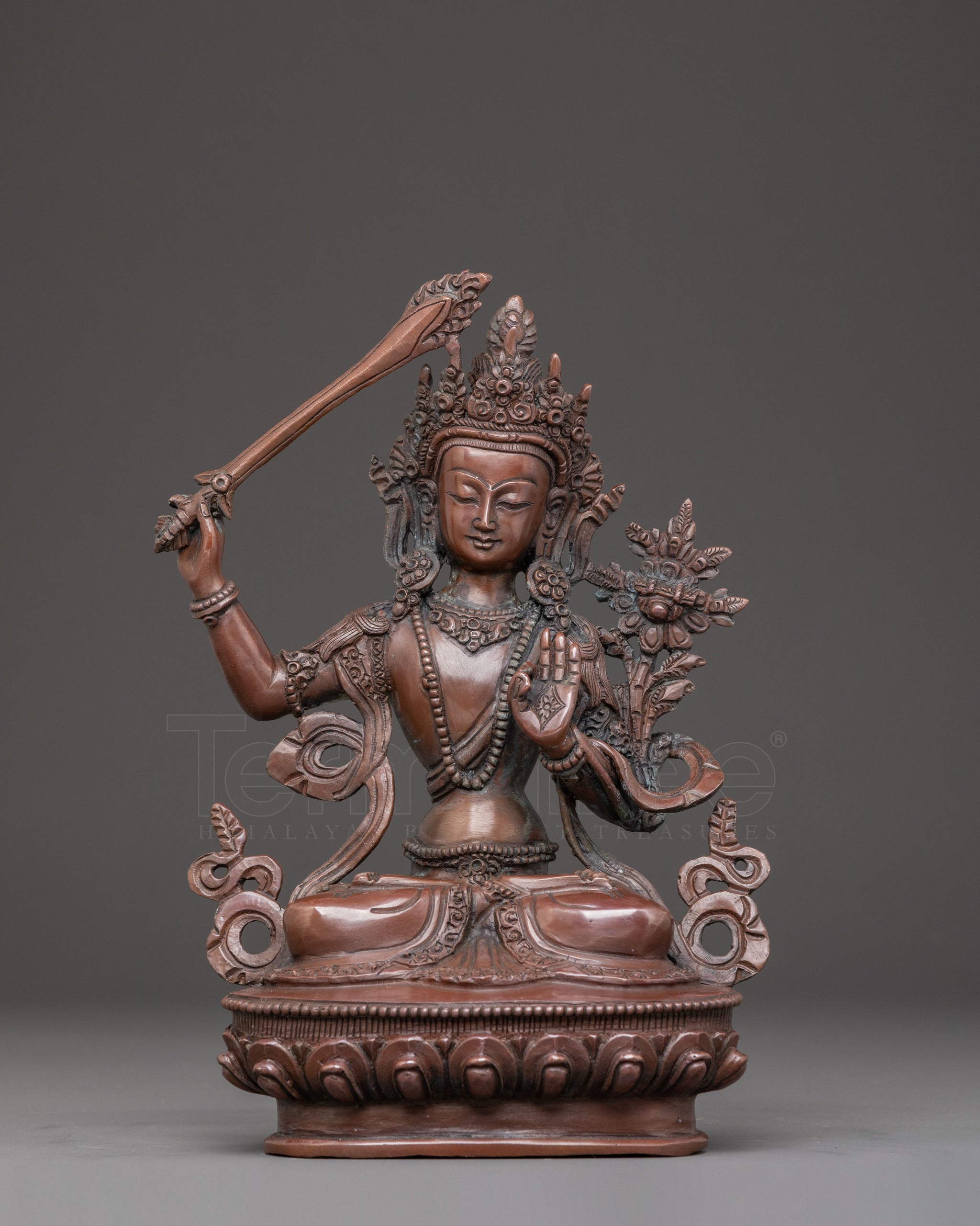 Manjushri is seated atop a moon disc lotus seat, holding a sword above his head with his right hand and making a 'Vitraka Mudra' with his left hand, where he has a lotus flower in it. The molding of the statue is done using oxidized copper, giving it an antique look. The intricate design patterns are hand-carved over the course of several months. The statue required our artists to put in months of hard work to complete every detail with utmost care. The crown and the body ornaments are adorned with precious gemstones.