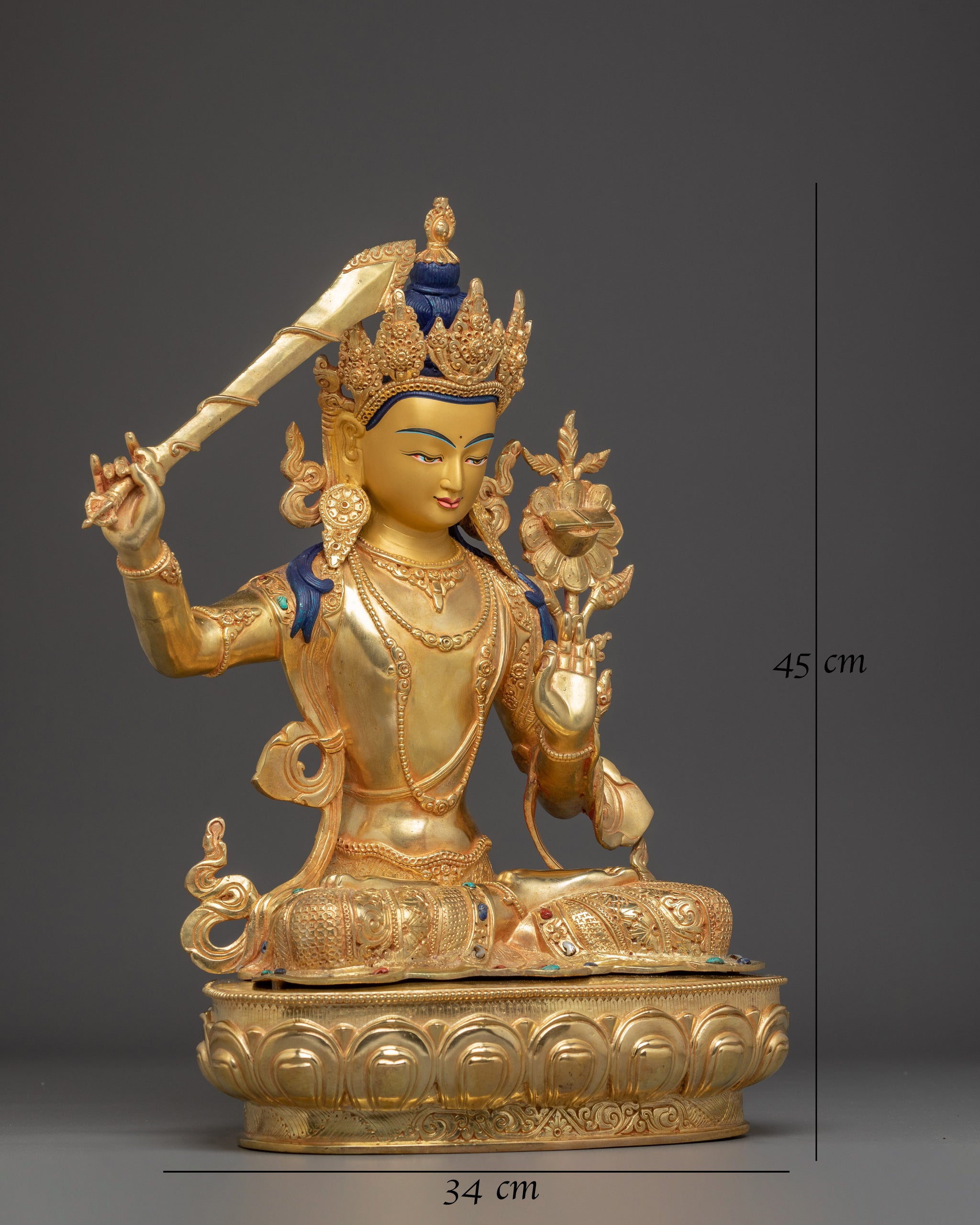 This Manjushri Statue, representing the Supreme Wisdom Deity, stands 17.7 inches (45 cm) in height with a 13.4-inch (34 cm) base and weighs 7.56 kilograms. Expertly handcrafted from a copper body, the statue is adorned with a rich layer of 24K gold gilding, detailed gold and acrylic paintings, and finely set gemstones that bring depth and brilliance to the piece. Manjushri, a revered figure in Buddhist tradition, symbolizes transcendent wisdom and clarity of mind. This intricately crafted sculpture is ideal for sacred spaces, meditation rooms, or as a centerpiece in any spiritual art collection.