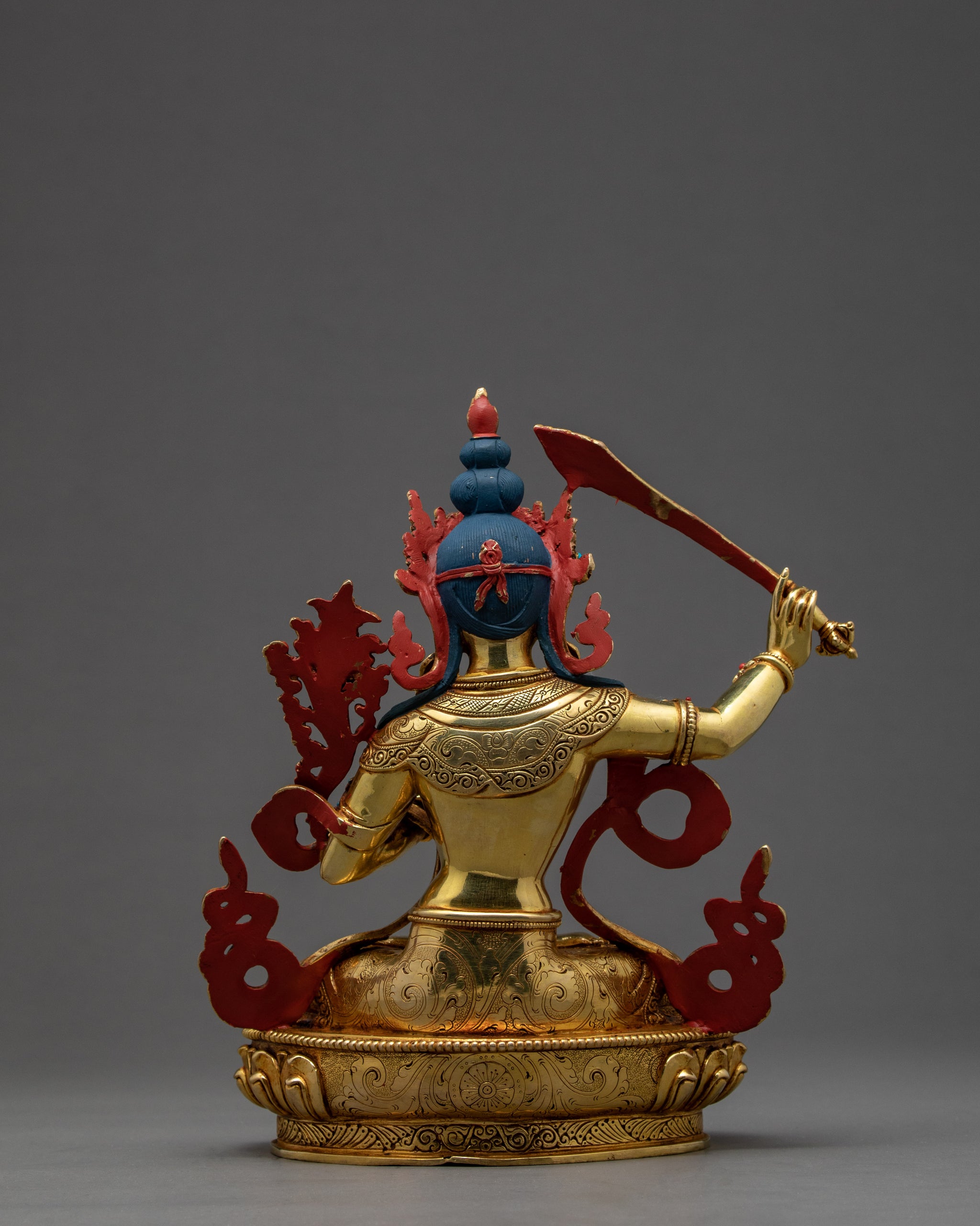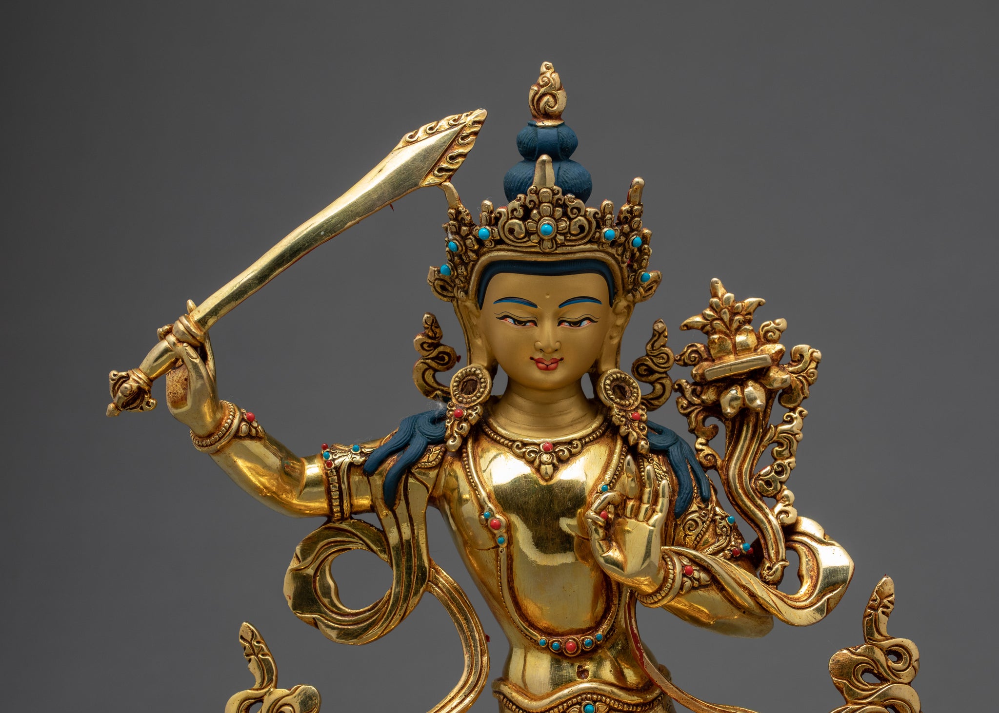 Manjushri, one of Lord Shakyamuni's eight primary disciples, is shown on this statue of Wisdom Deity. He wears a diadem and is adorned with precious and valuable jewelry. His left hand is holding a lotus flower, on which he has put the book of transcendental wisdom. His right hand wields the sword of emptiness wisdom, which he uses to slay ignorance, the source of all suffering.