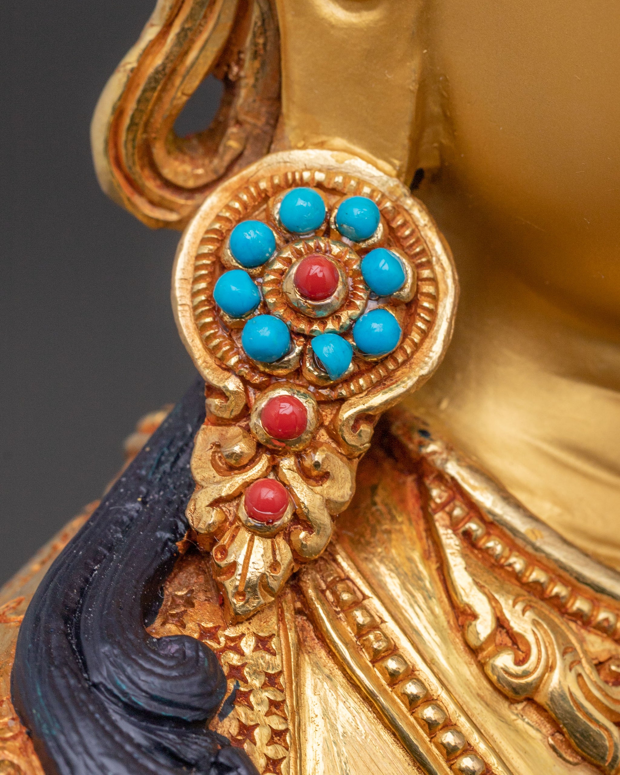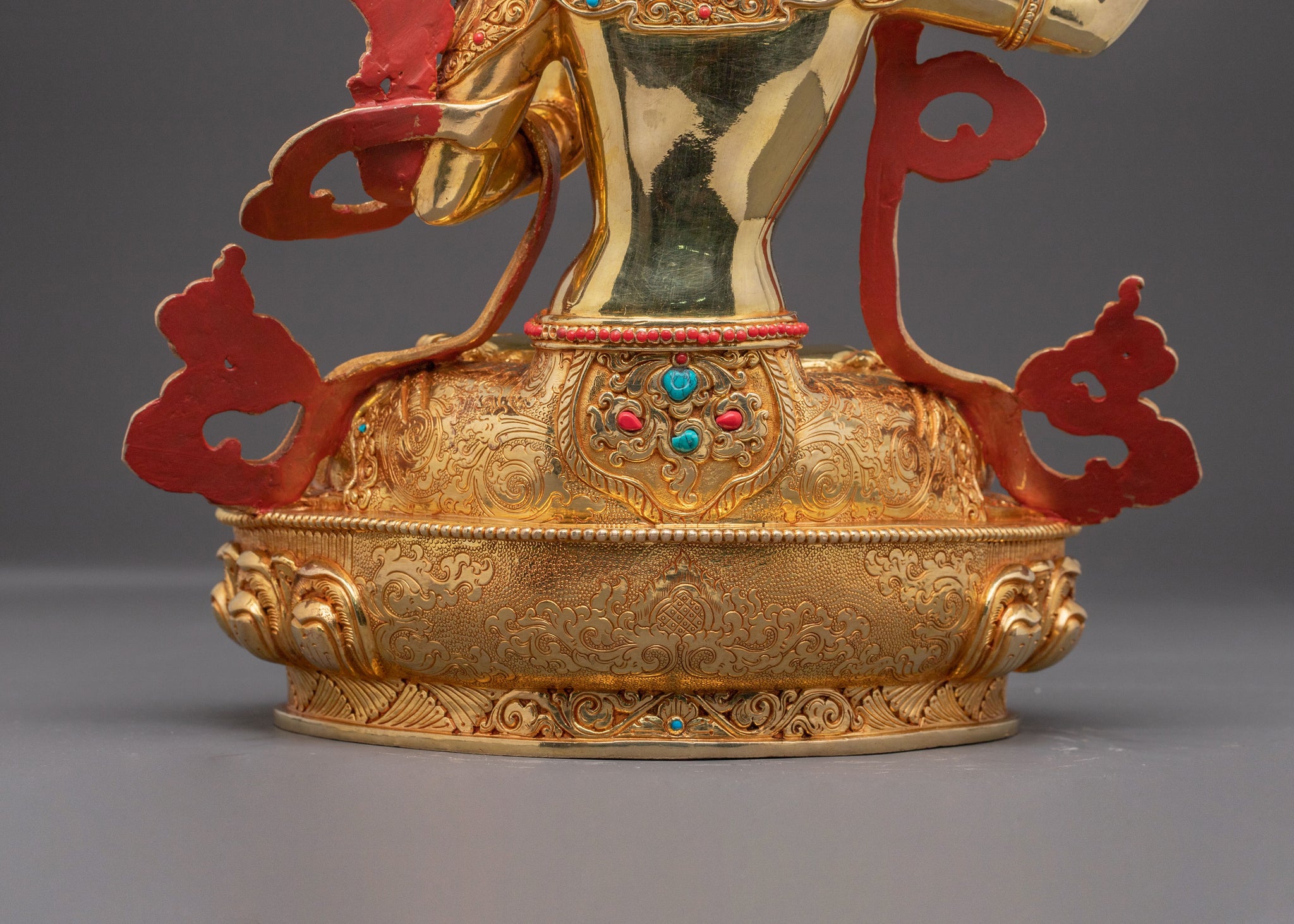 From the revered heart of Nepalese artistry, this exquisite Manjushri wisdom sword statue emanates profound tranquility and intellectual clarity. Standing 13.4 inches (34 cm) tall on a meticulously crafted base, the figure is cast in robust copper, covered with a triple layer of 24K gold gilding, and carved with deeply engraved carvings that produce a magnificent 3D-like effect. Its brilliant 24K gold-gilded surfaces and majestic presence reflect the boundless wisdom of all Buddhas, offering a powerful focal point for contemplation and the cultivation of insight.